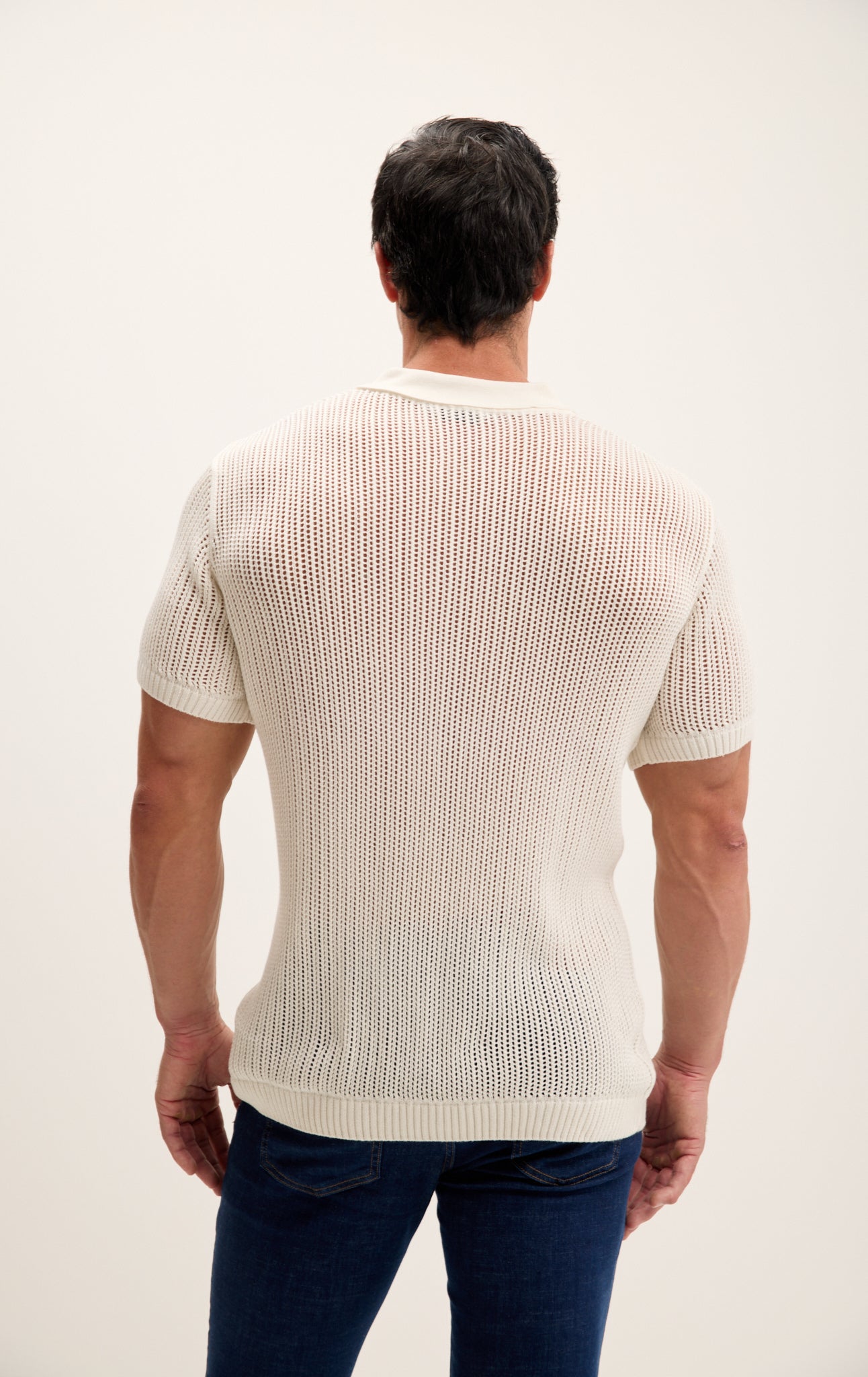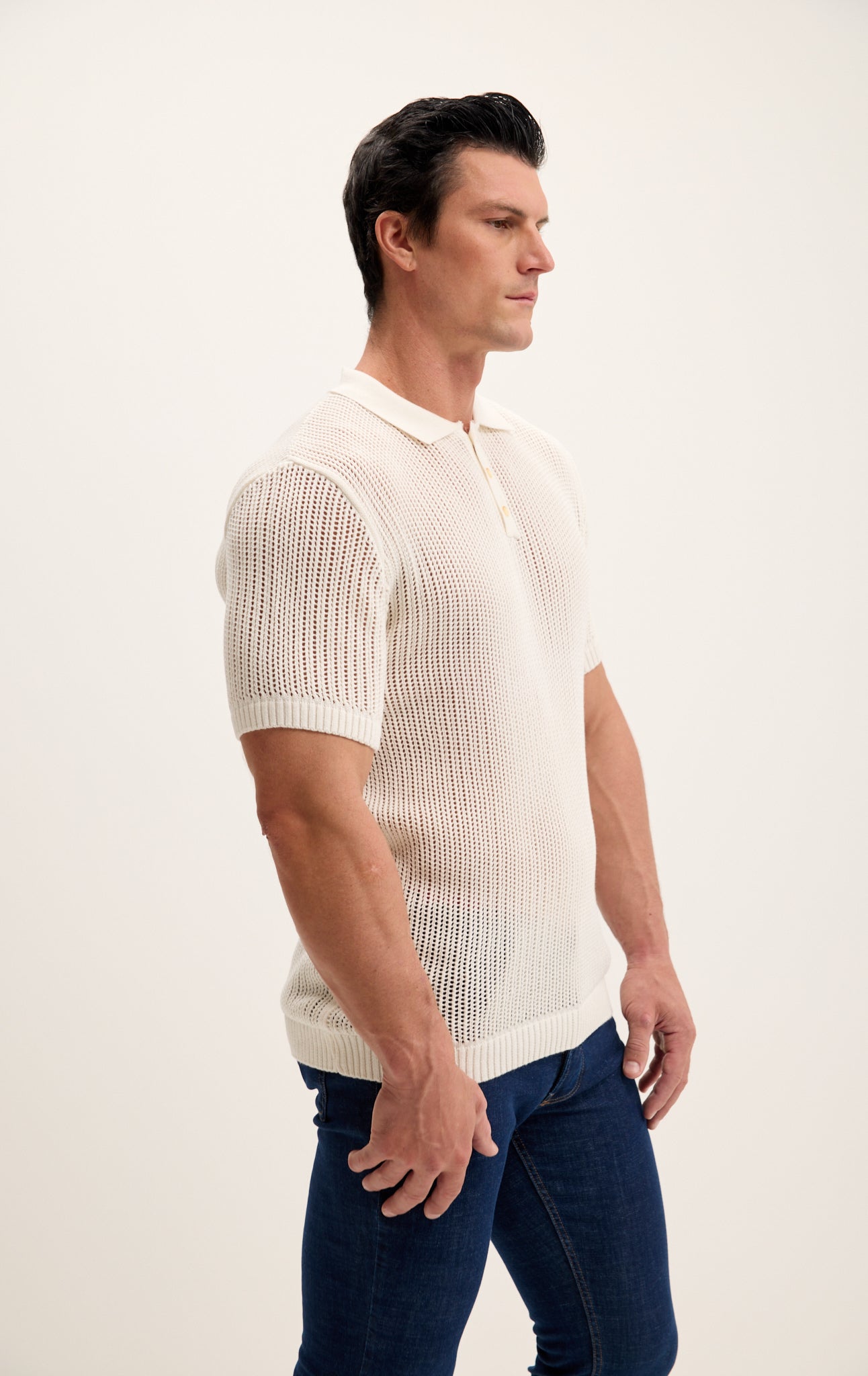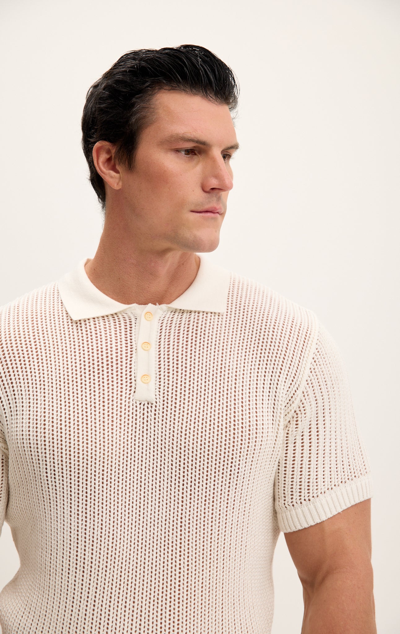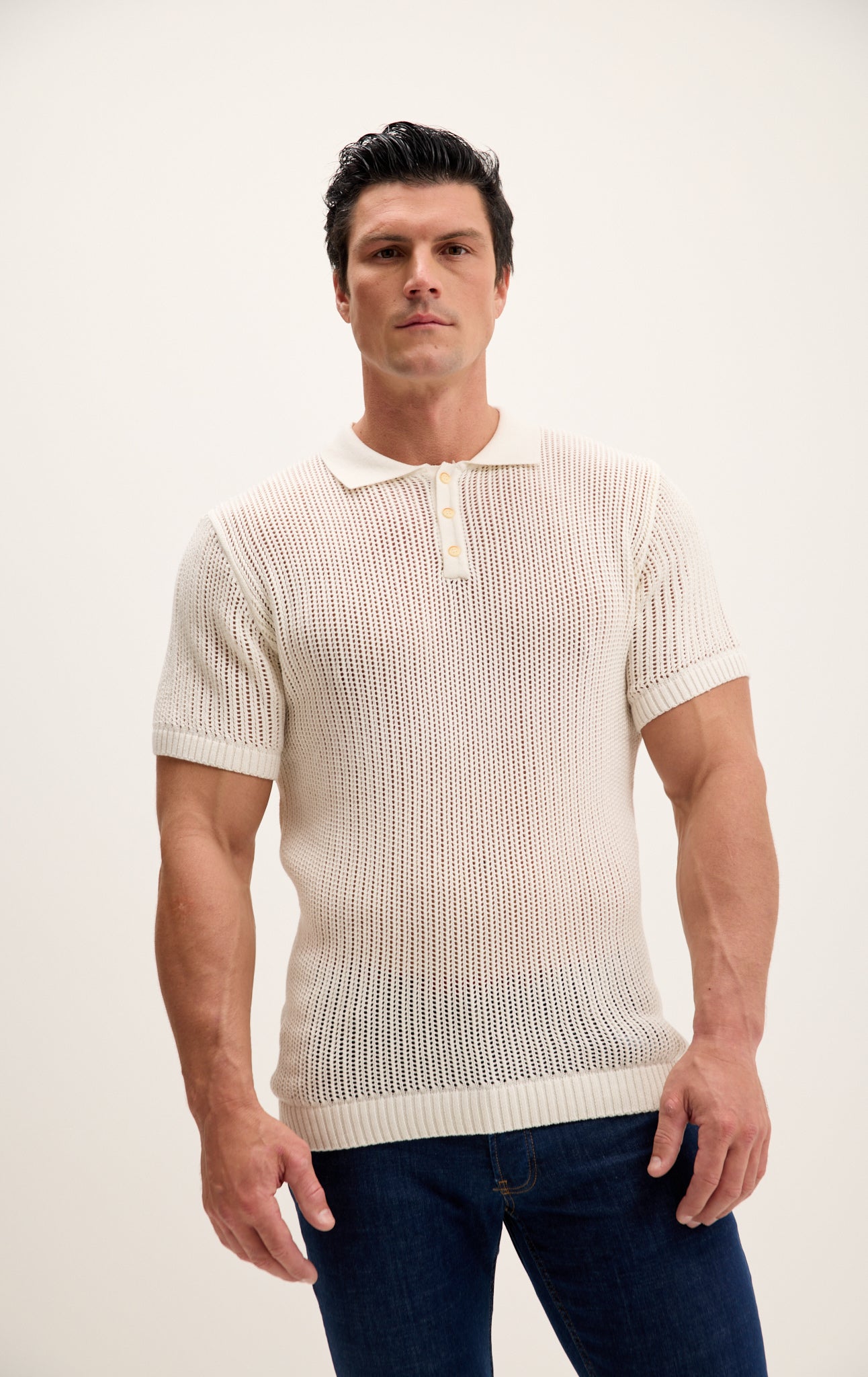 Polo-Shirt mit Lochmuster-Strickmuster – Cremeweiß