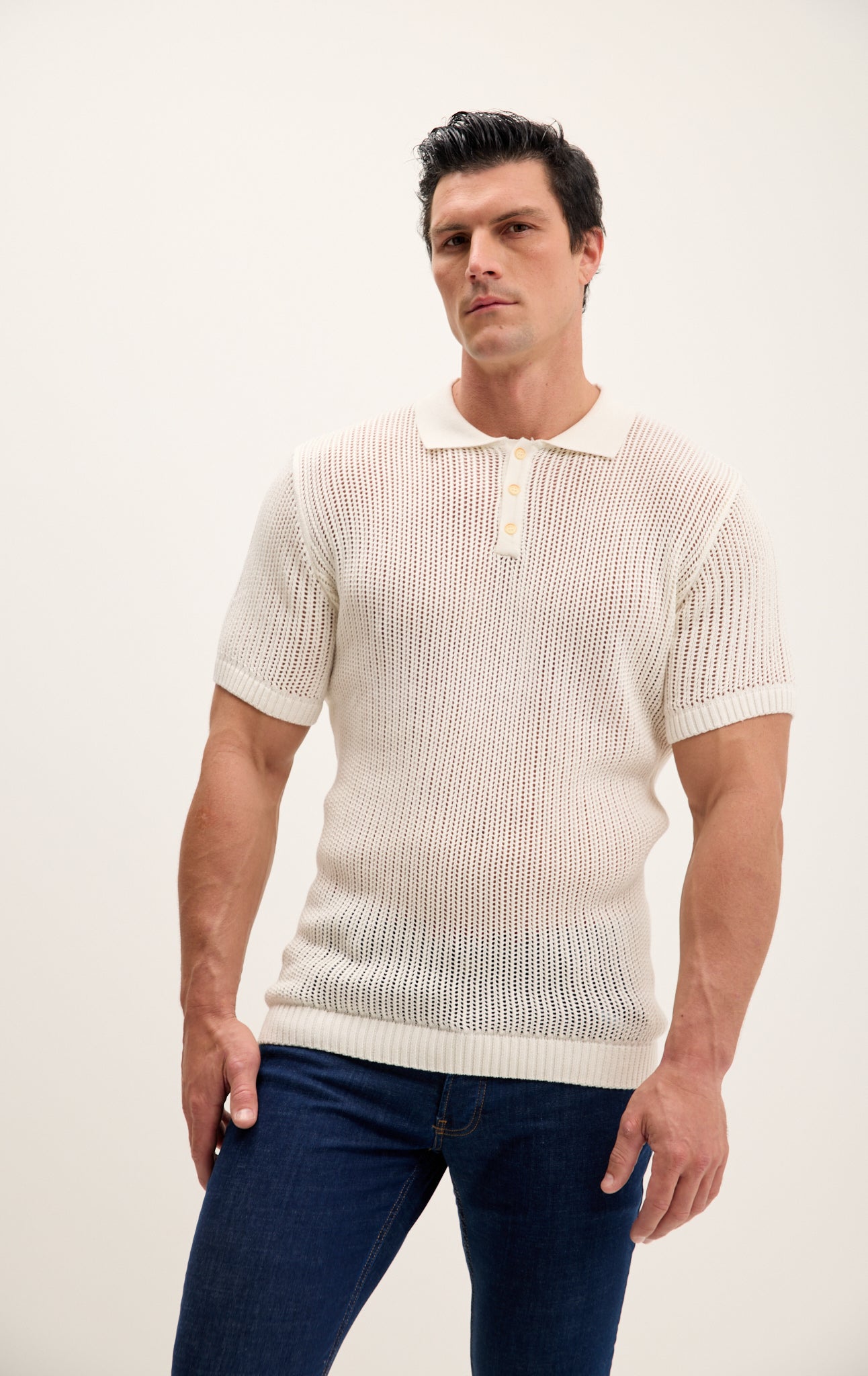 Das luftige Strickmuster sorgt für Atmungsaktivität und Tragekomfort und ist somit ideal für wärmere Tage. Der Polokragen verleiht dem Kleidungsstück eine elegante Note, während die kurzen Ärmel Vielseitigkeit und Bewegungsfreiheit bieten.