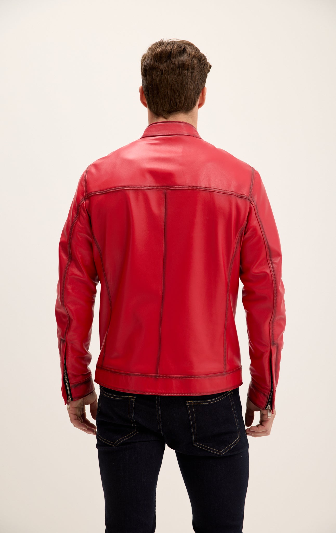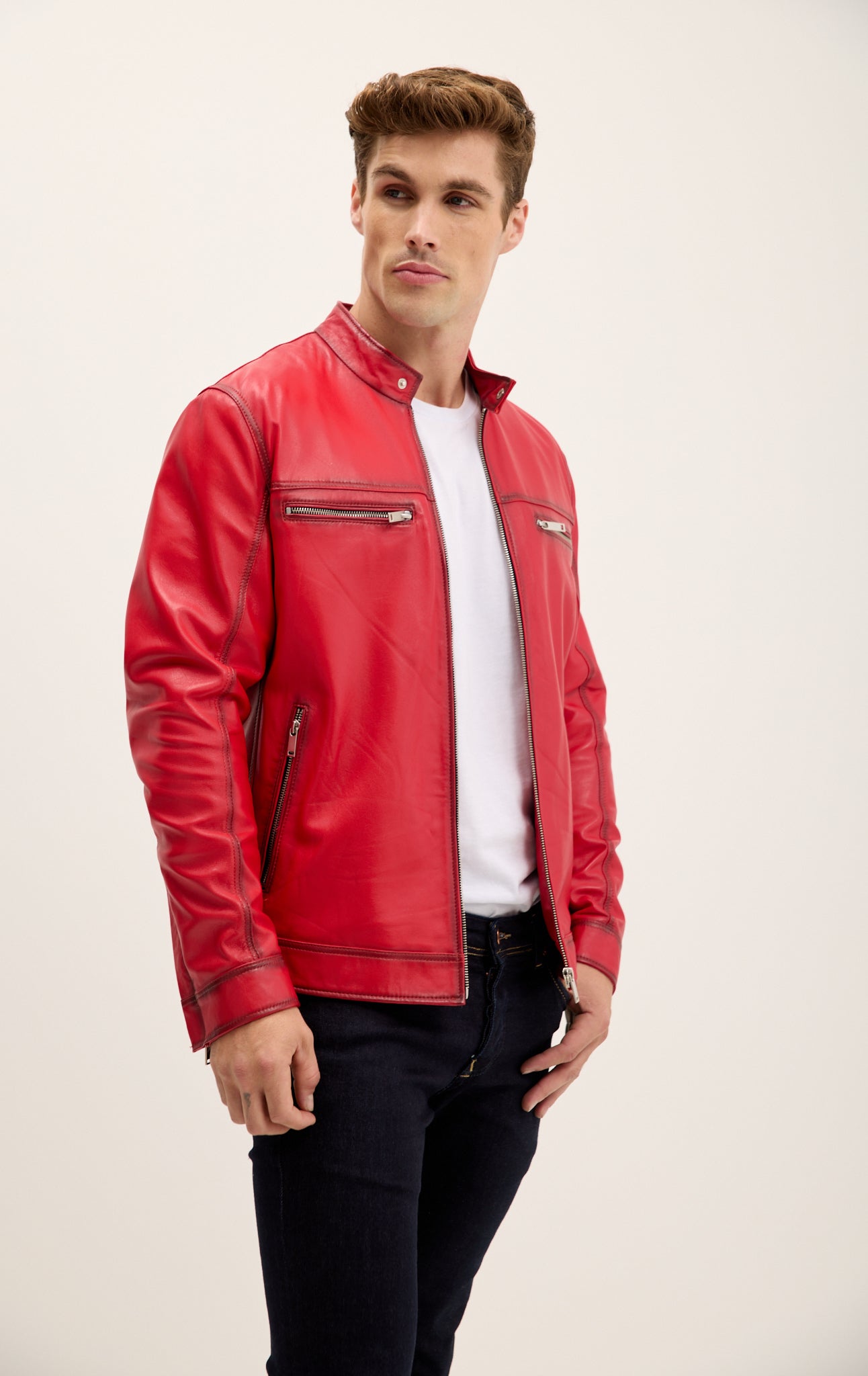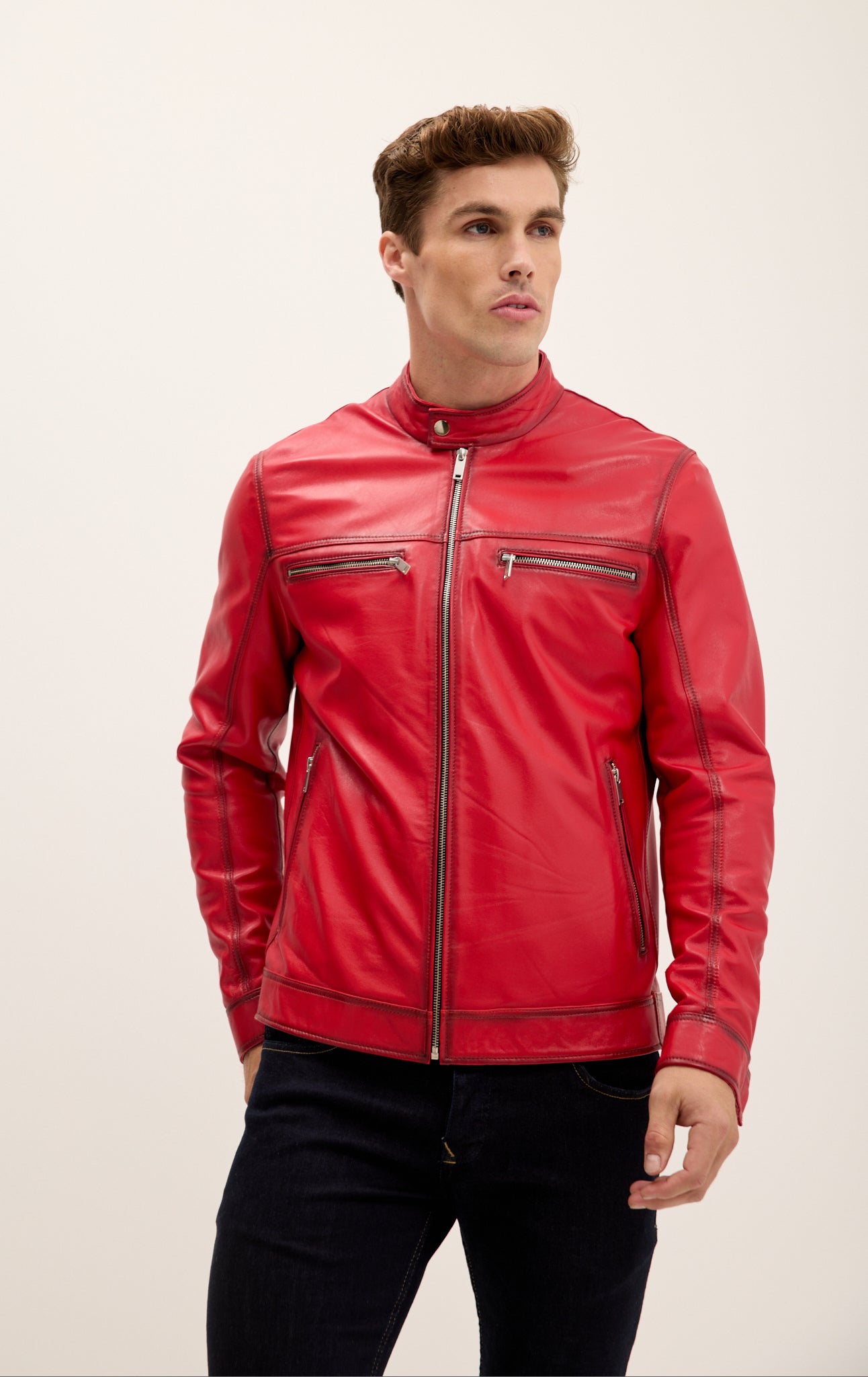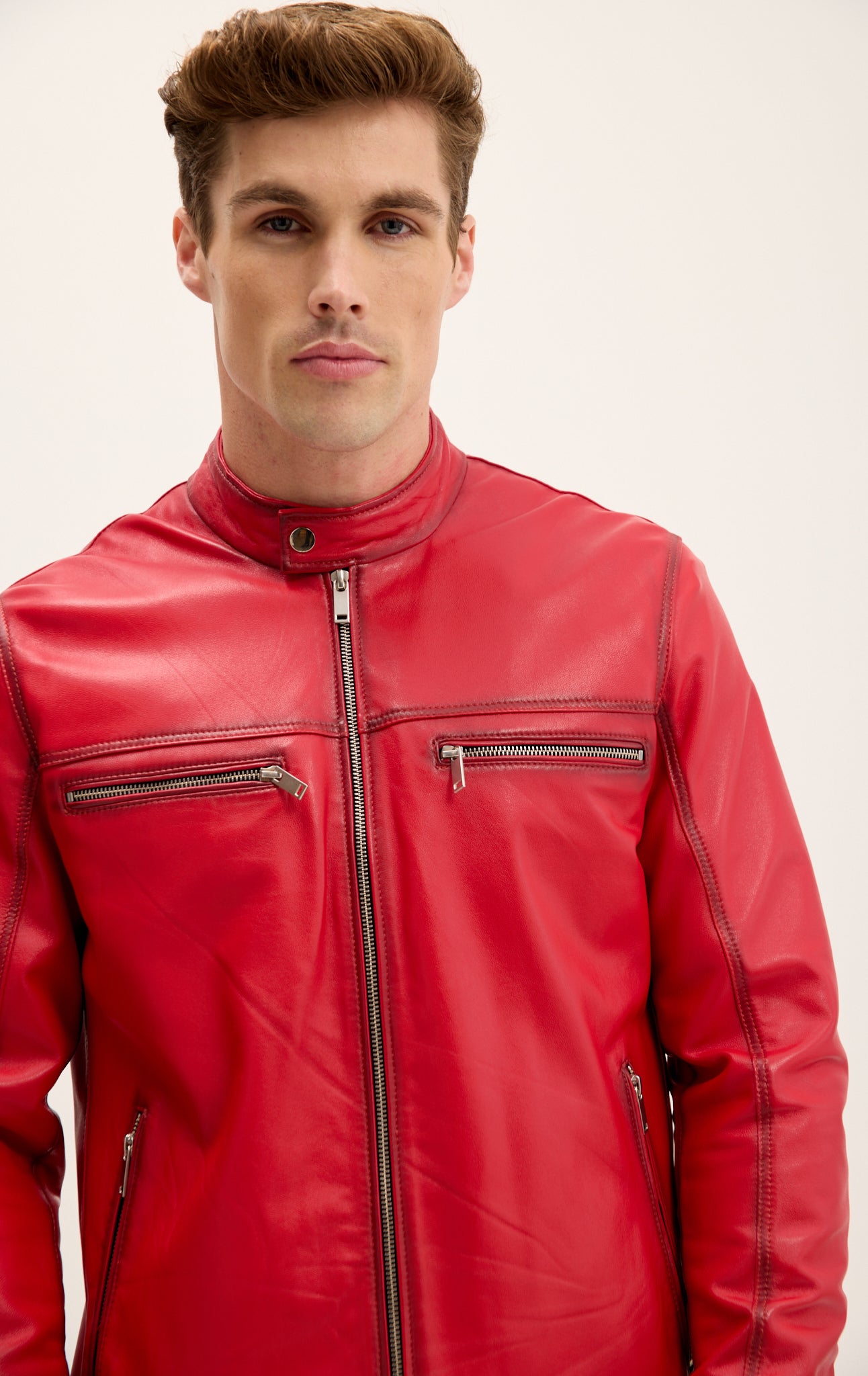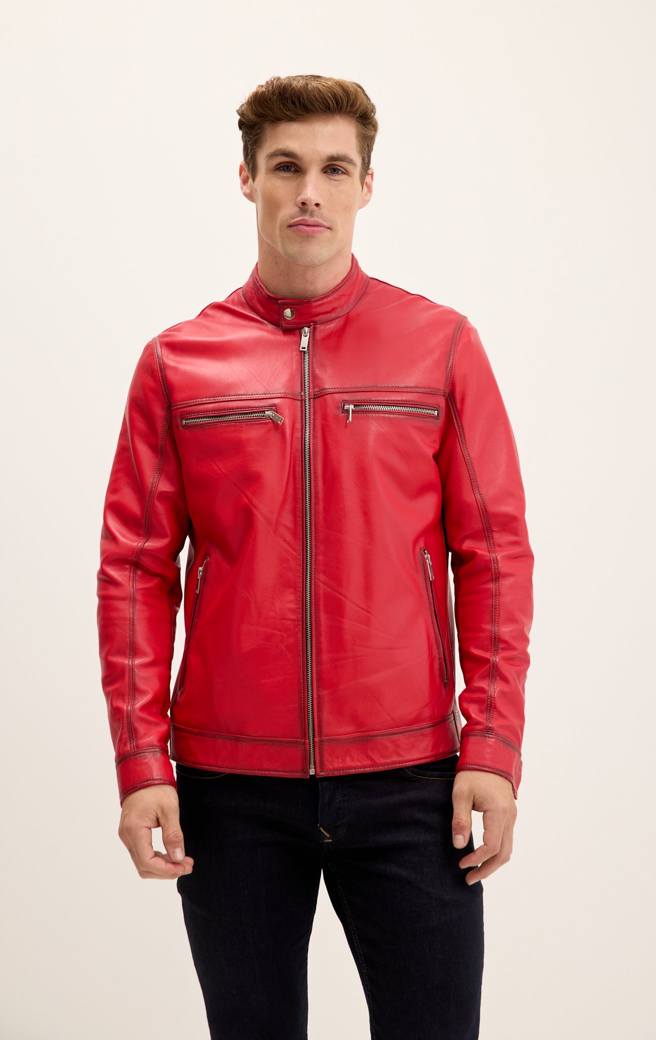 Verleihen Sie jedem Outfit sofort das gewisse Etwas mit unserer klassischen Lederjacke mit Reißverschluss vorne, die exklusiv für Ron Tomson aus weichem, luxuriösem Echtleder handgefertigt wird. Dezente Details, doppelte Brusttaschen mit Reißverschluss, silberne Beschläge und ein Stehkragen mit Druckknopfverschluss am Hals. Verstellbare Druckknopfmanschetten an den Ärmeln und vertikale Leistentaschen runden diesen zeitlosen Look ab.