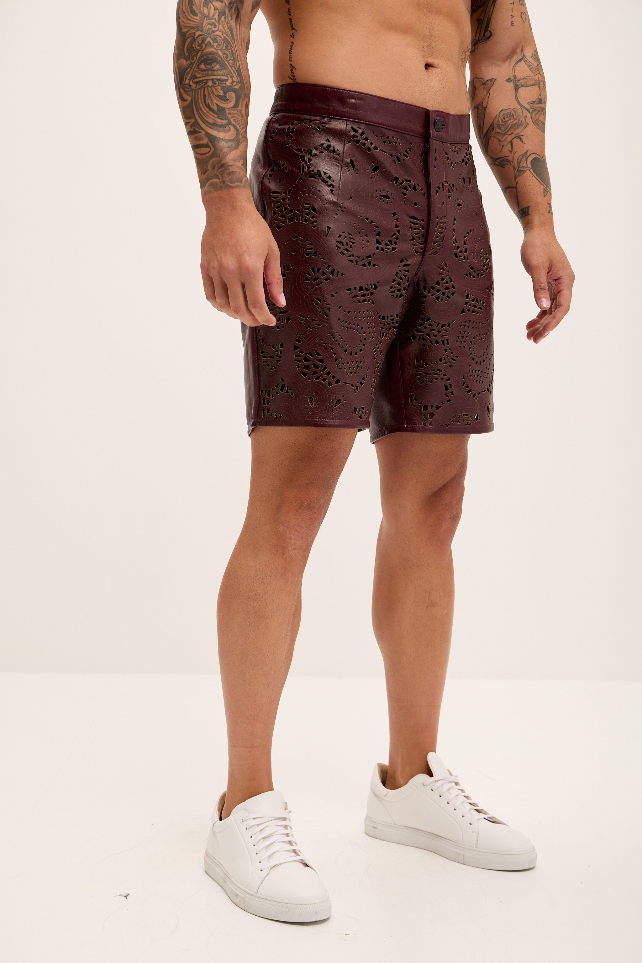 Cut-out-Shorts aus figurbetontem Leder – Weinrot