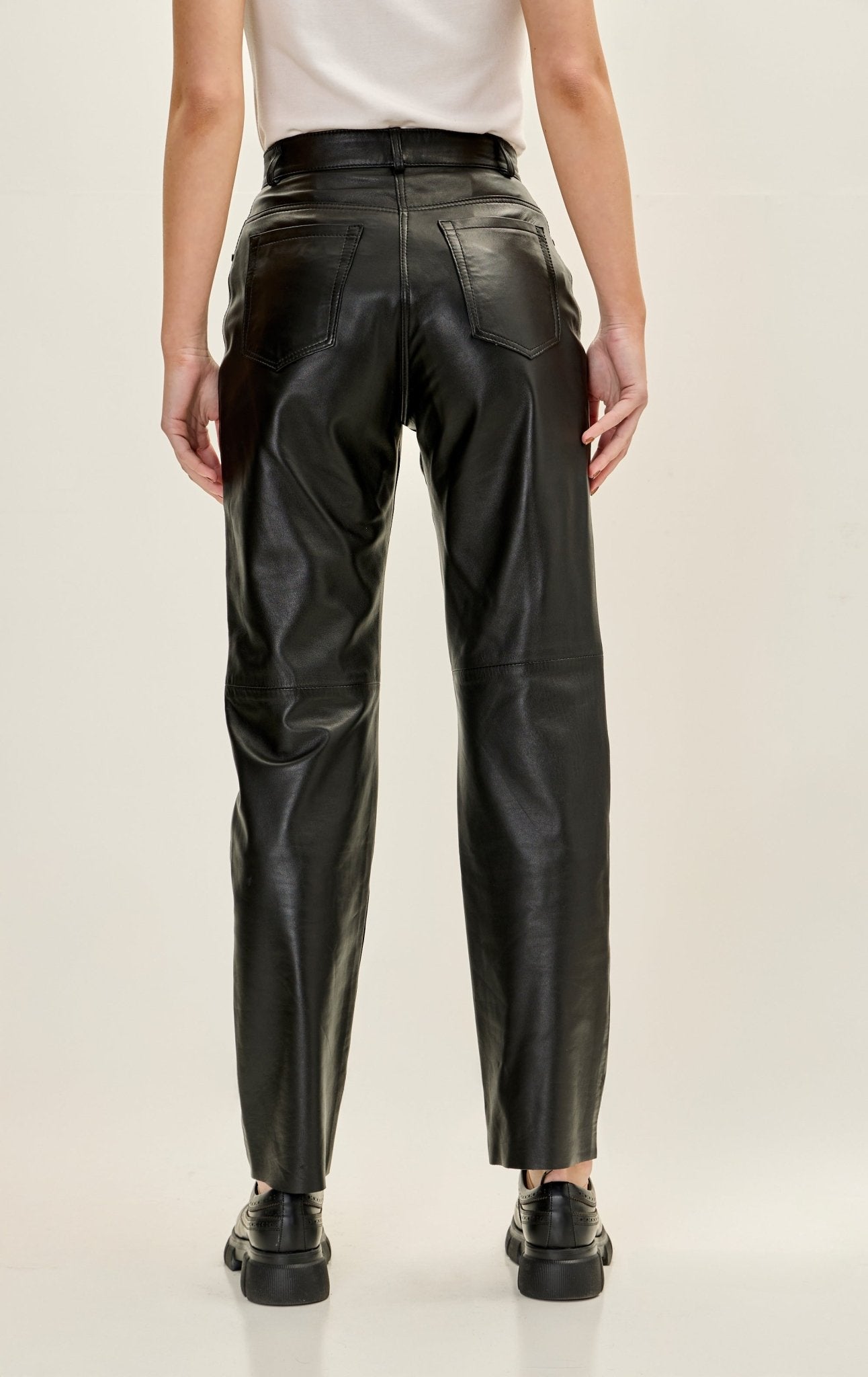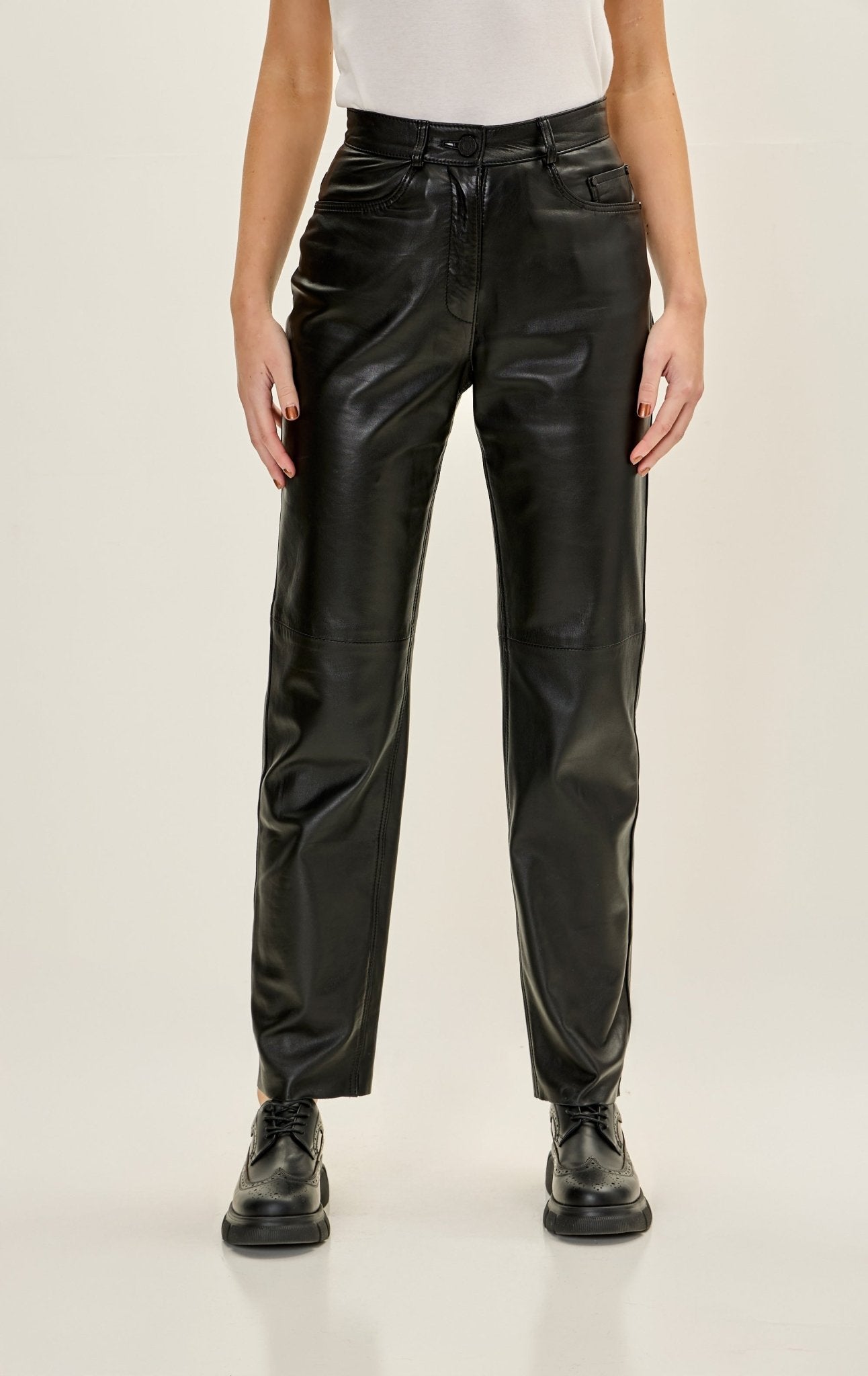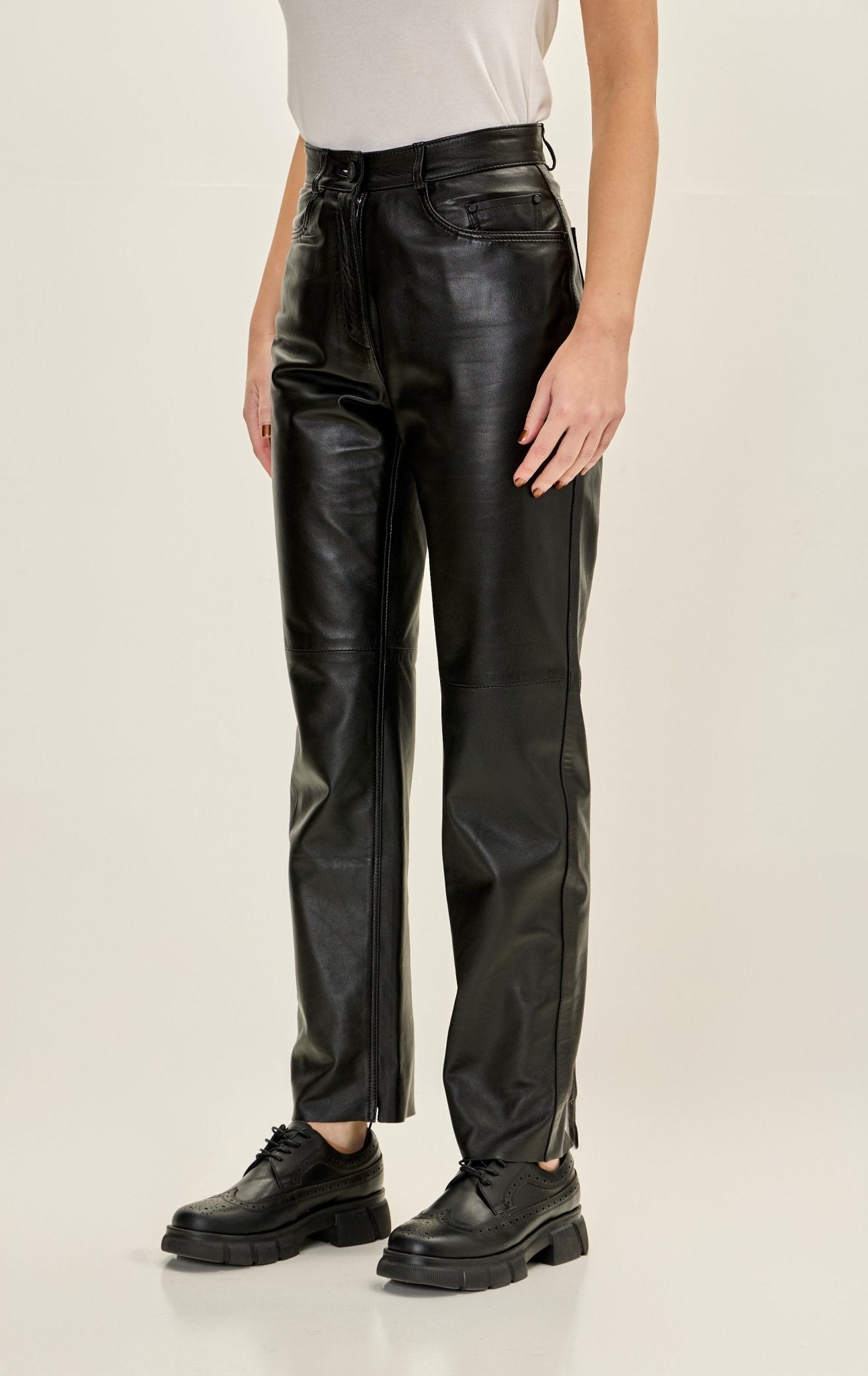 Unsere klassische Lederhose mit 5 Taschen Diese Jeans haben einen geraden, figurbetonten Schnitt mit langer Innenbeinlänge für eine besonders schmeichelhafte Passform. Gefertigt aus superweichem, butterweichem Lammleder, mit klassischen Jeanstaschen und farblich abgestimmten Beschlägen. Ein unverzichtbares Basic für jede Garderobe.