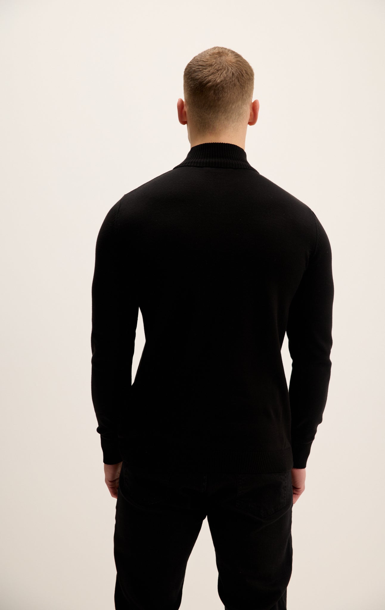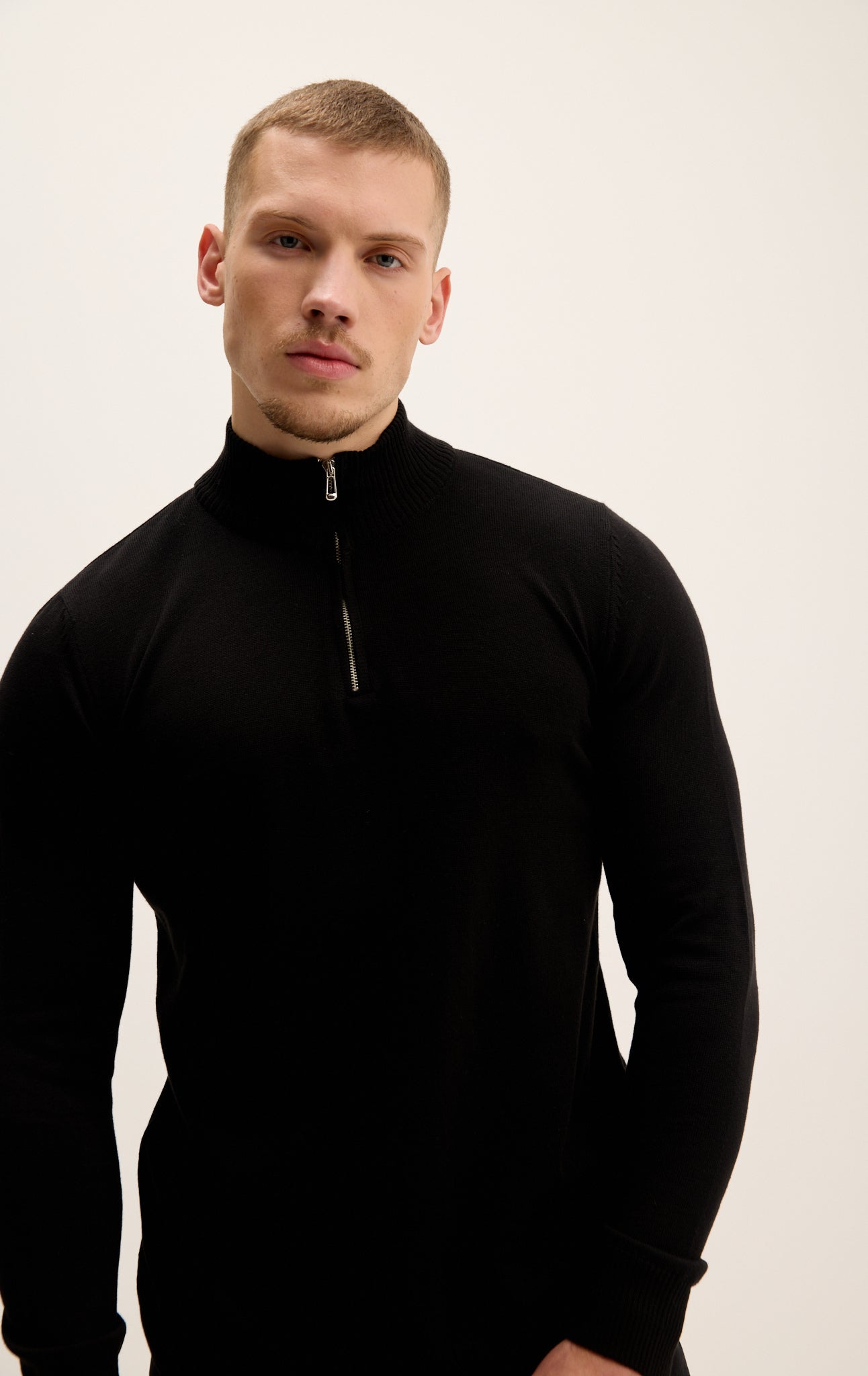 Quarter Zipper Mock Neck Ribbed Sweater - Black