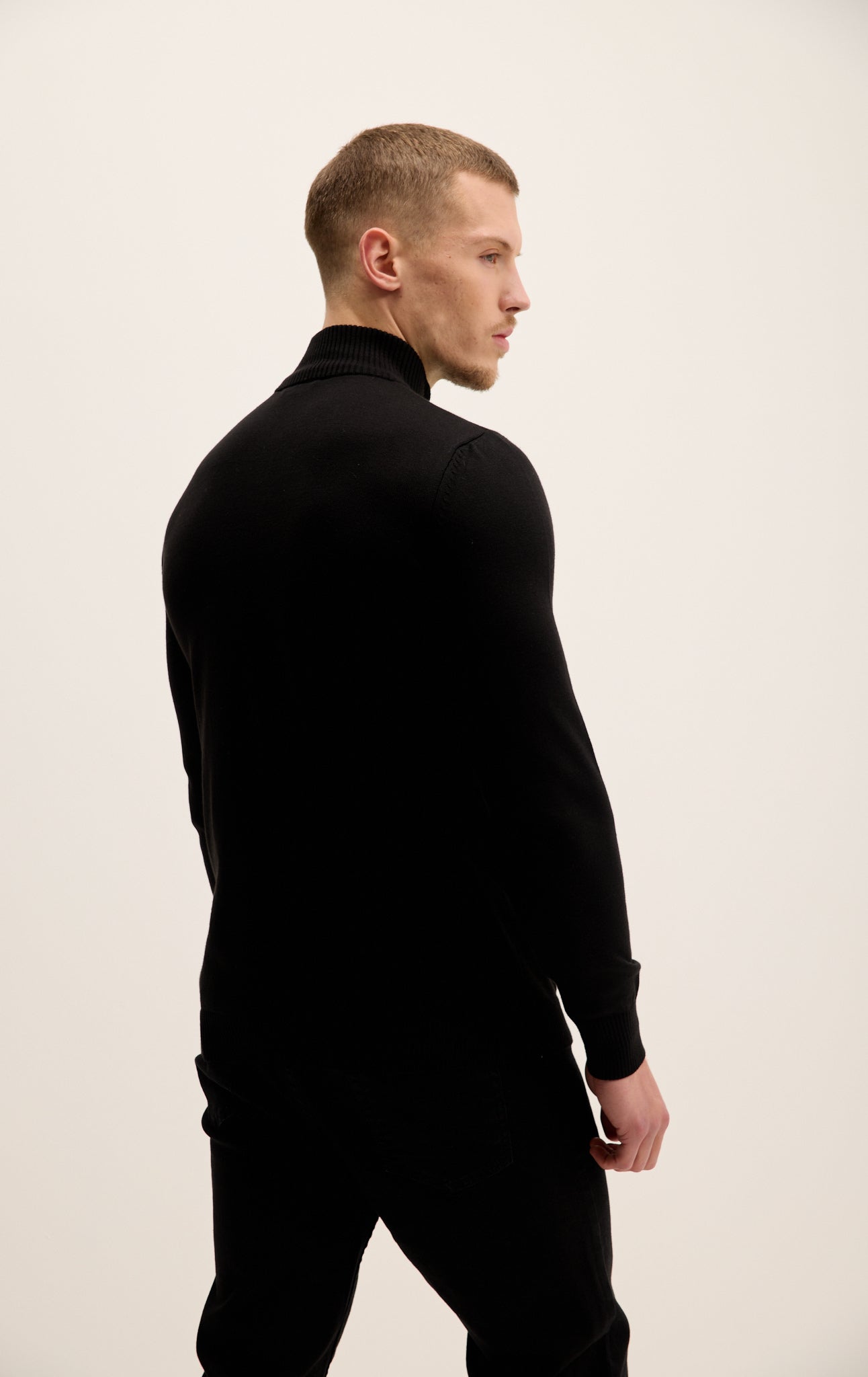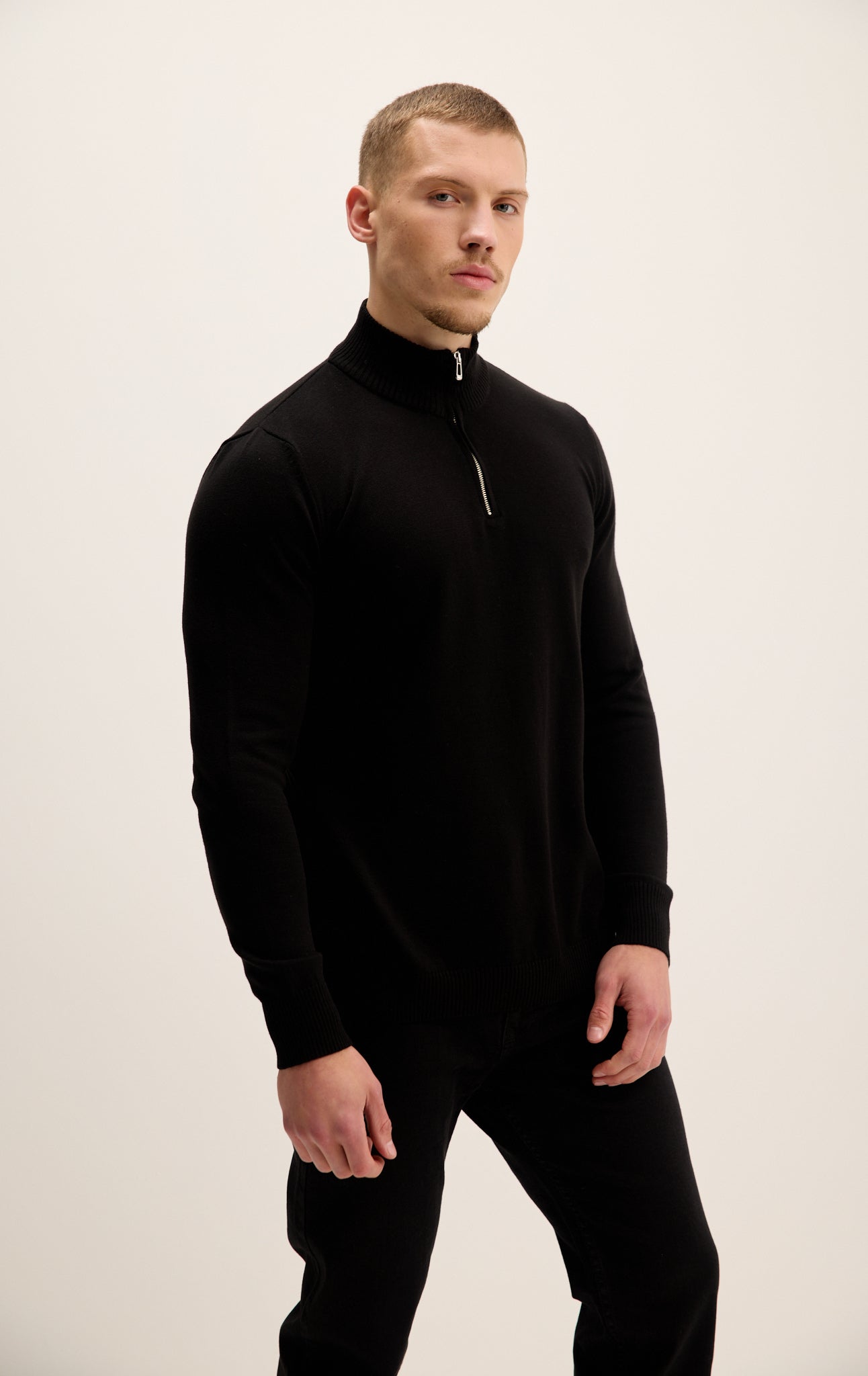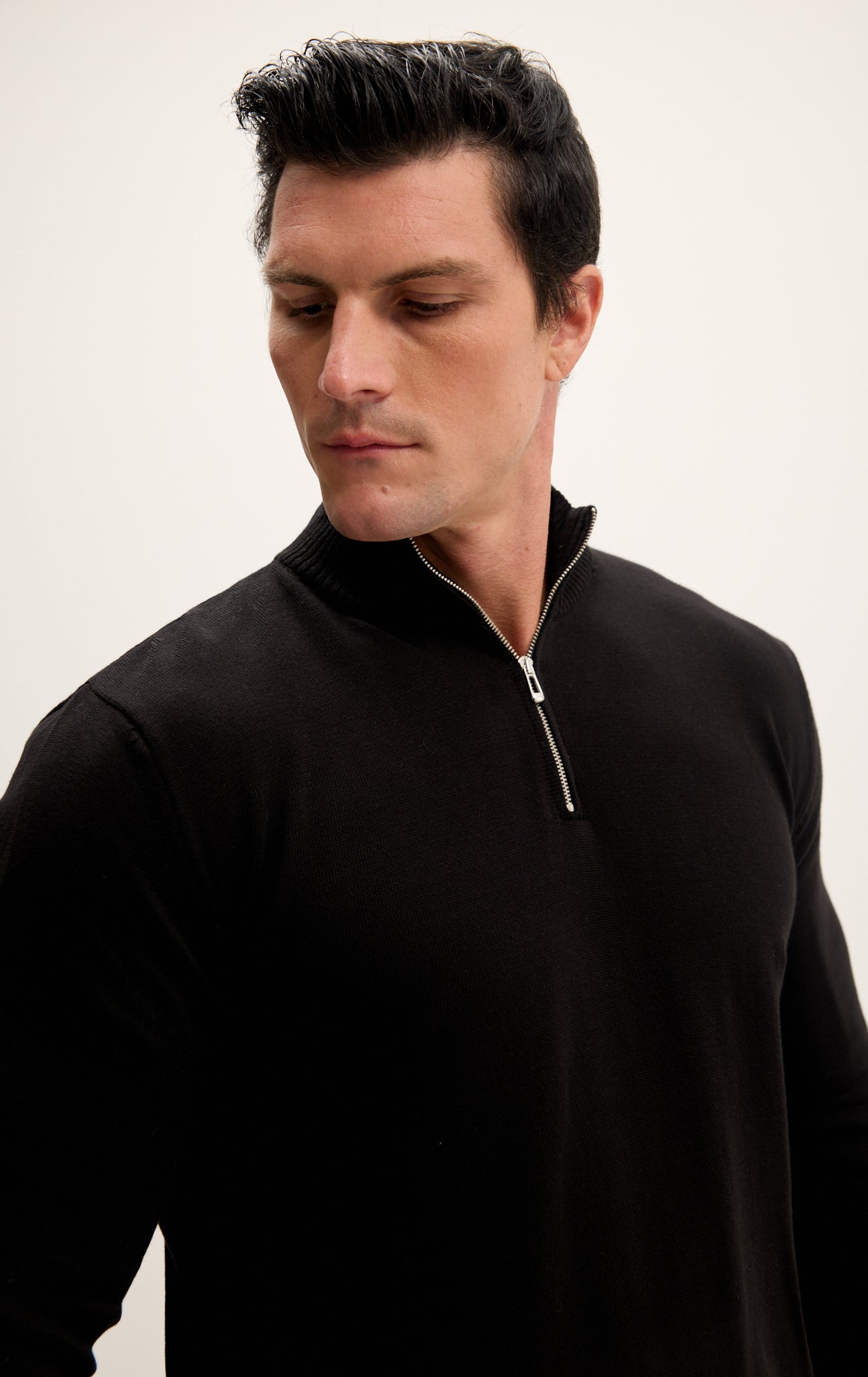 Elevate your style with our clean knit sweater, crafted from a finely textured cotton acrylic blend. Featuring a close-fitting mock neck and a convenient quarter zipper, this sweater is a must-have for the modern man's wardrobe. It's both cozy and versatile, perfect for layering with any of our wool suits to achieve a modern and polished look. Stay sharp and sophisticated effortlessly.