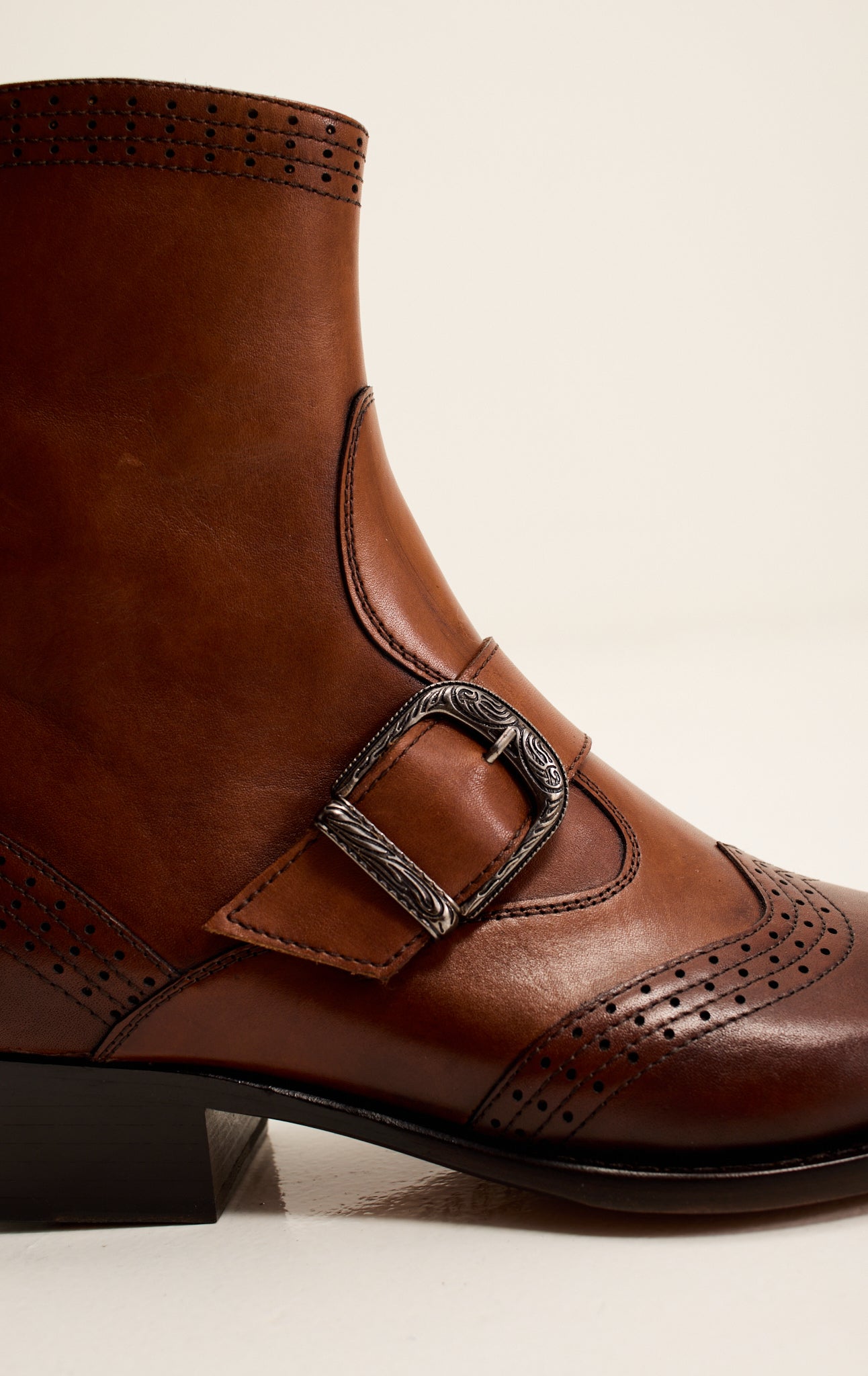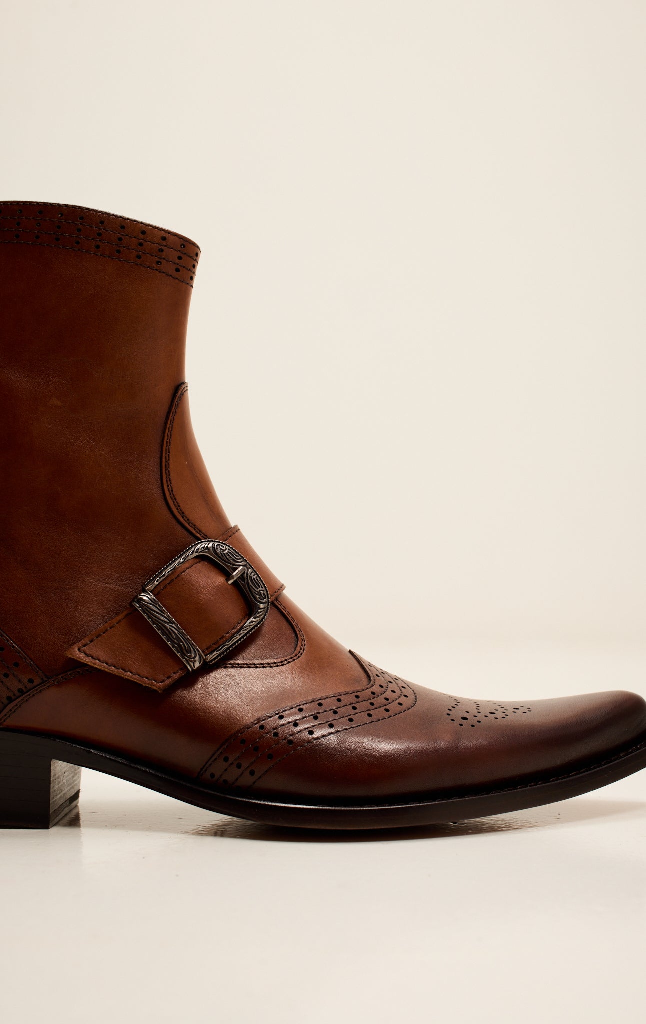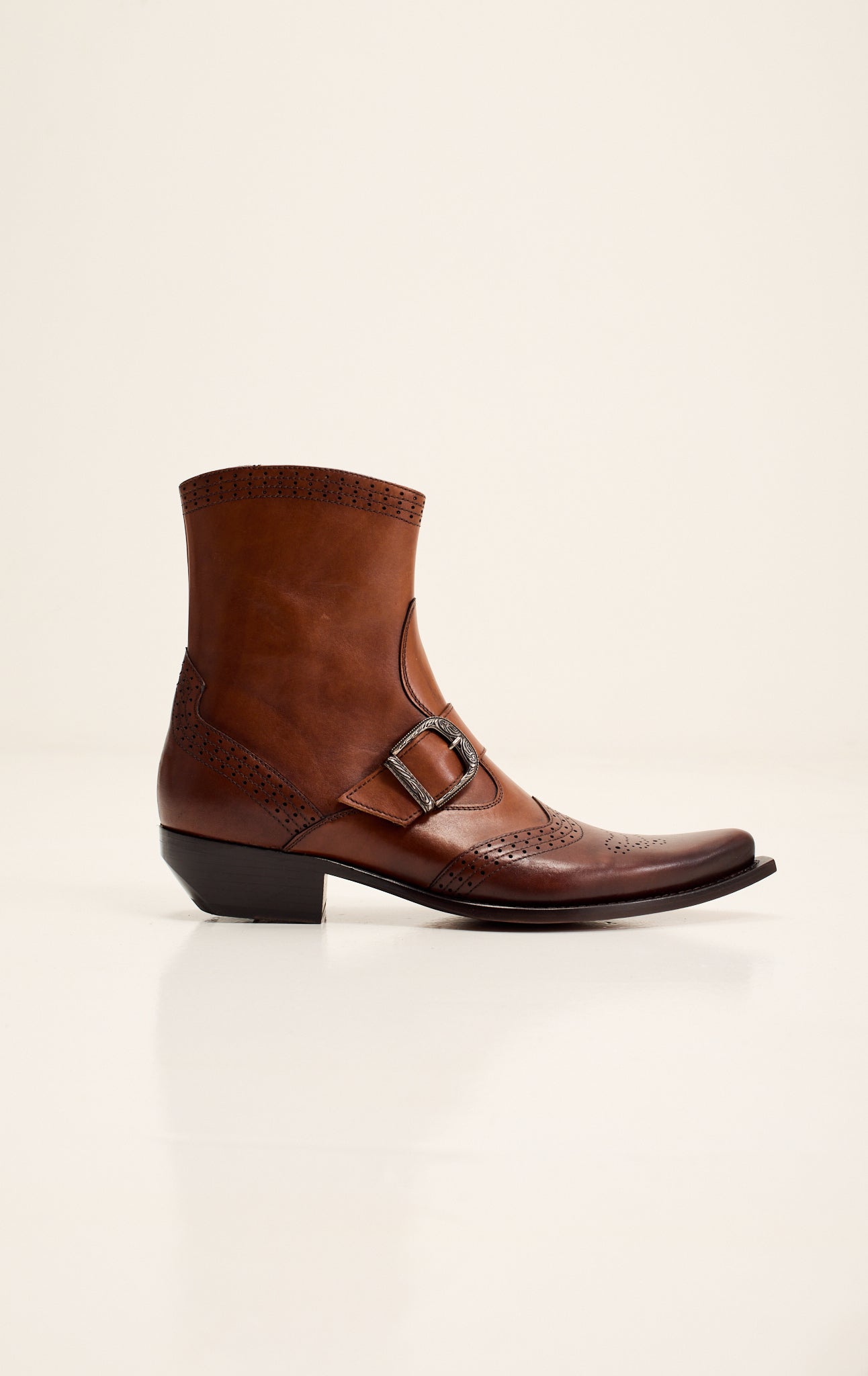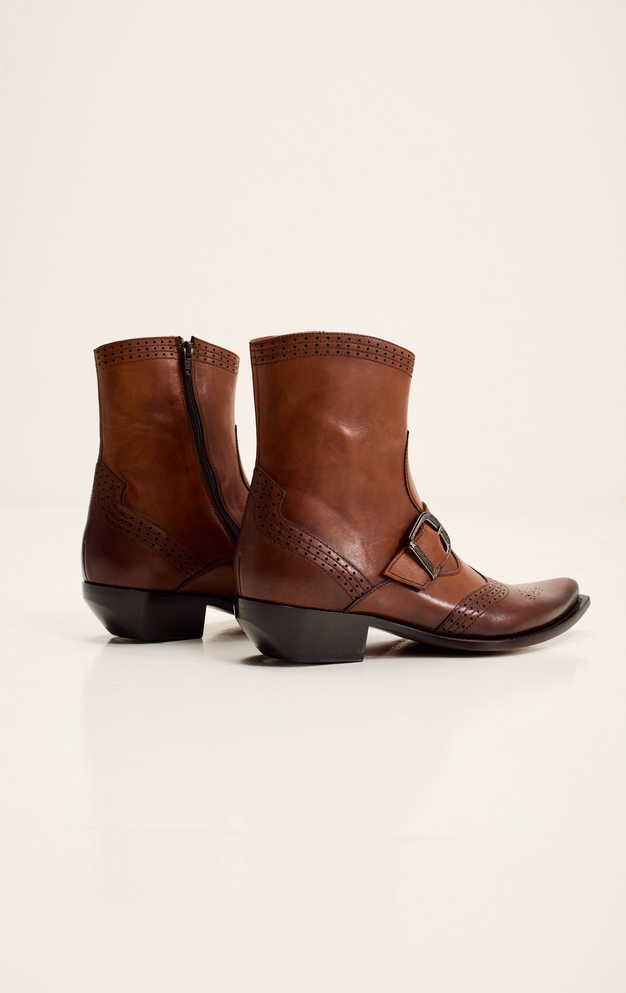 Step into authentic Western style with these rich brown leather boots, featuring side buckles, a bold cowboy heel, and a pointed toe for a striking silhouette. Crafted with a sturdy sole and cushioned insole, these boots deliver durability and comfort for all-day wear. Perfect for casual outings or country-inspired events, they embody rugged elegance and traditional craftsmanship.