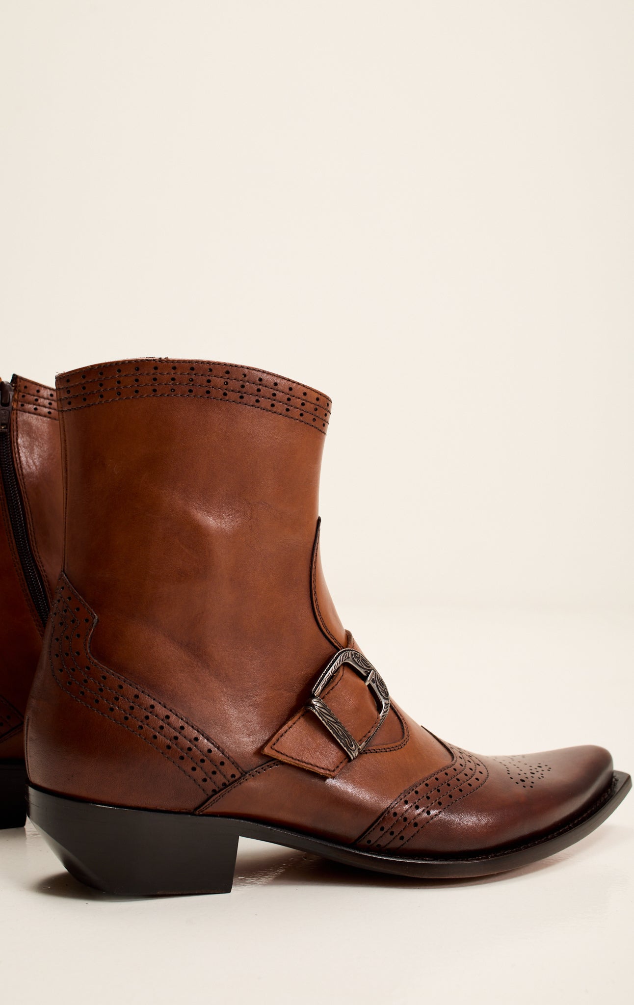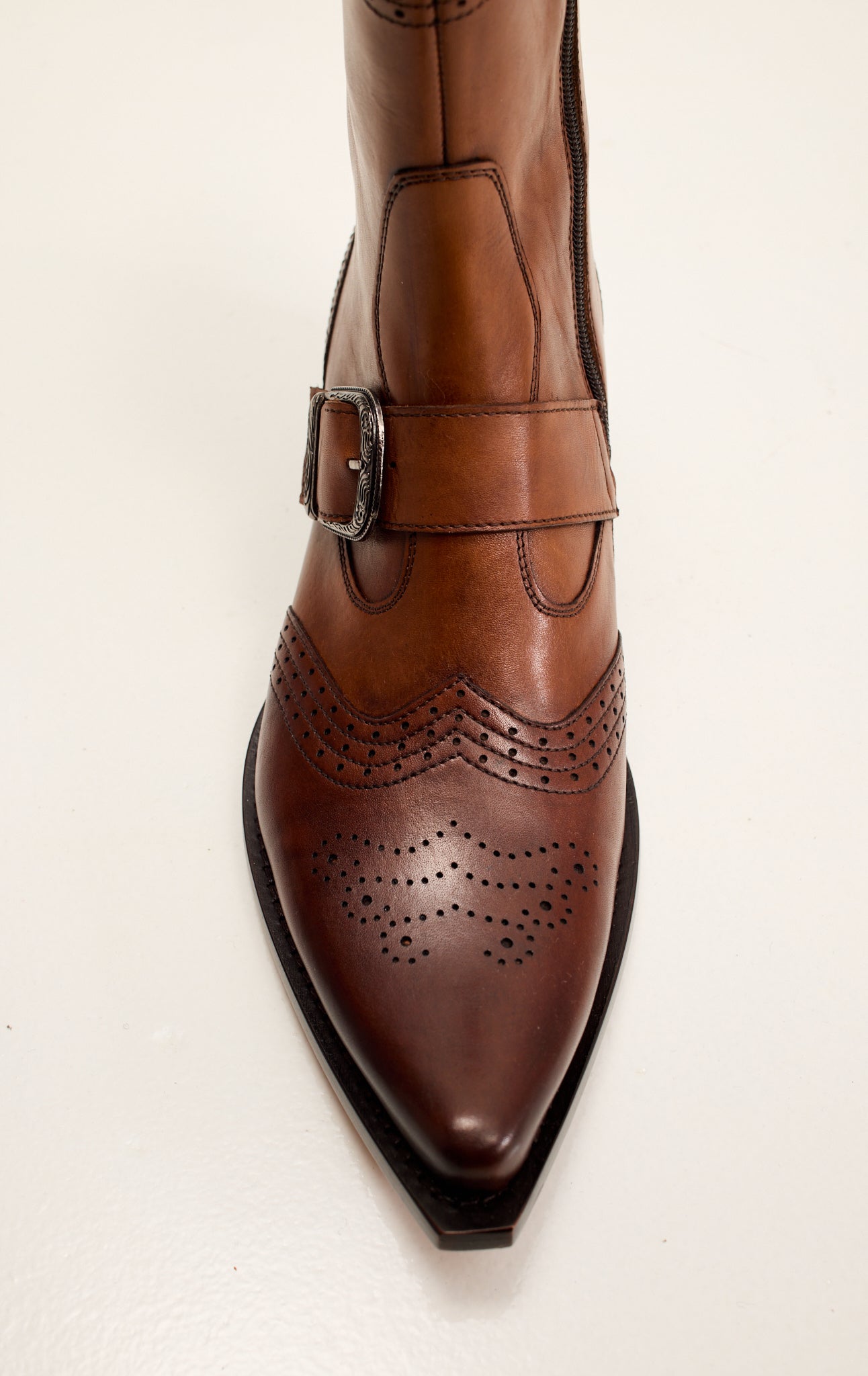 Western Side Buckle Leather Boots with Cowboy Heel and Pointed Toe - Brown