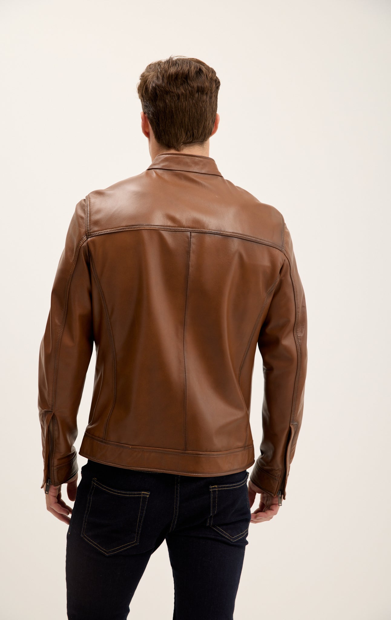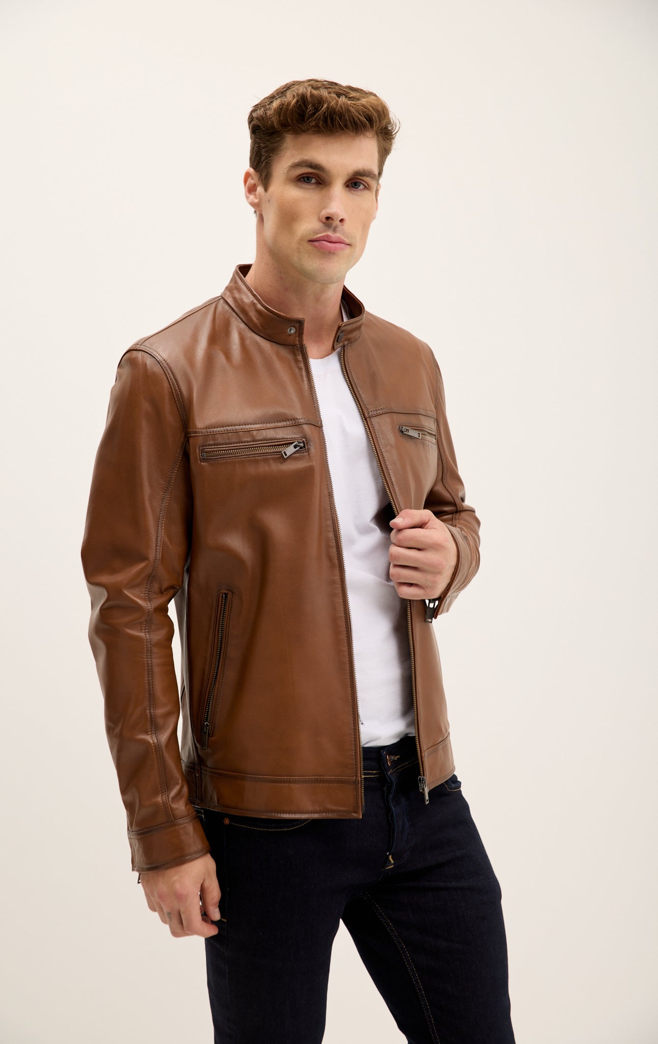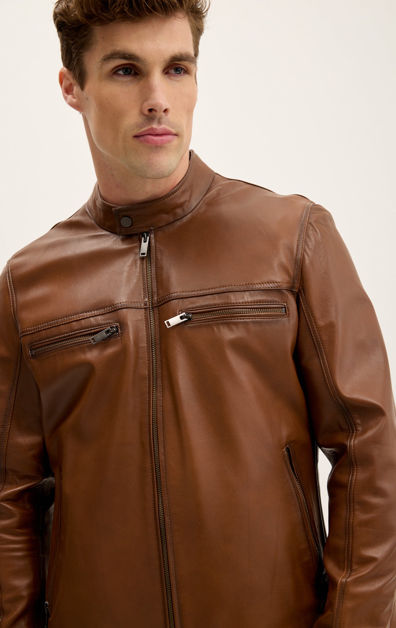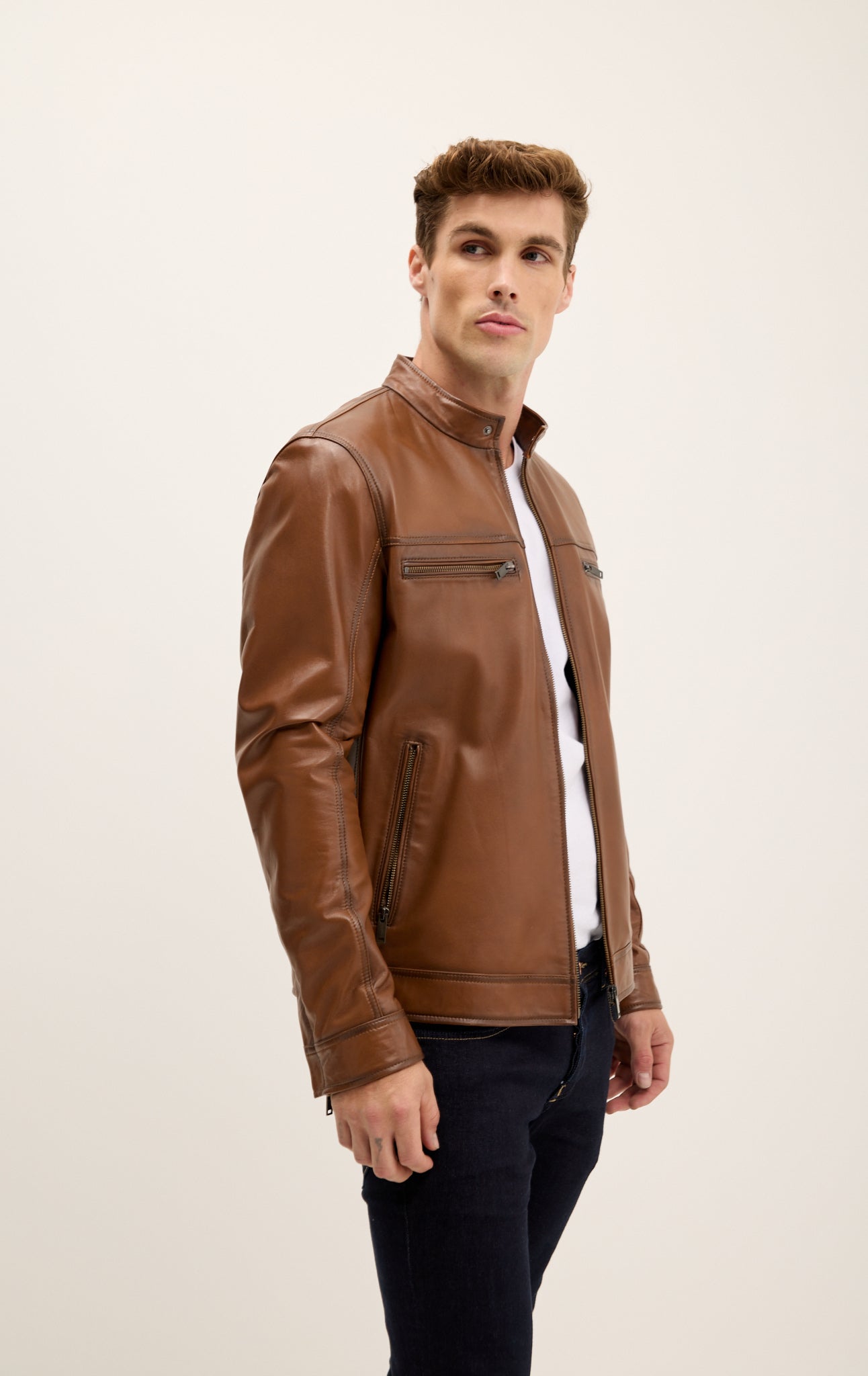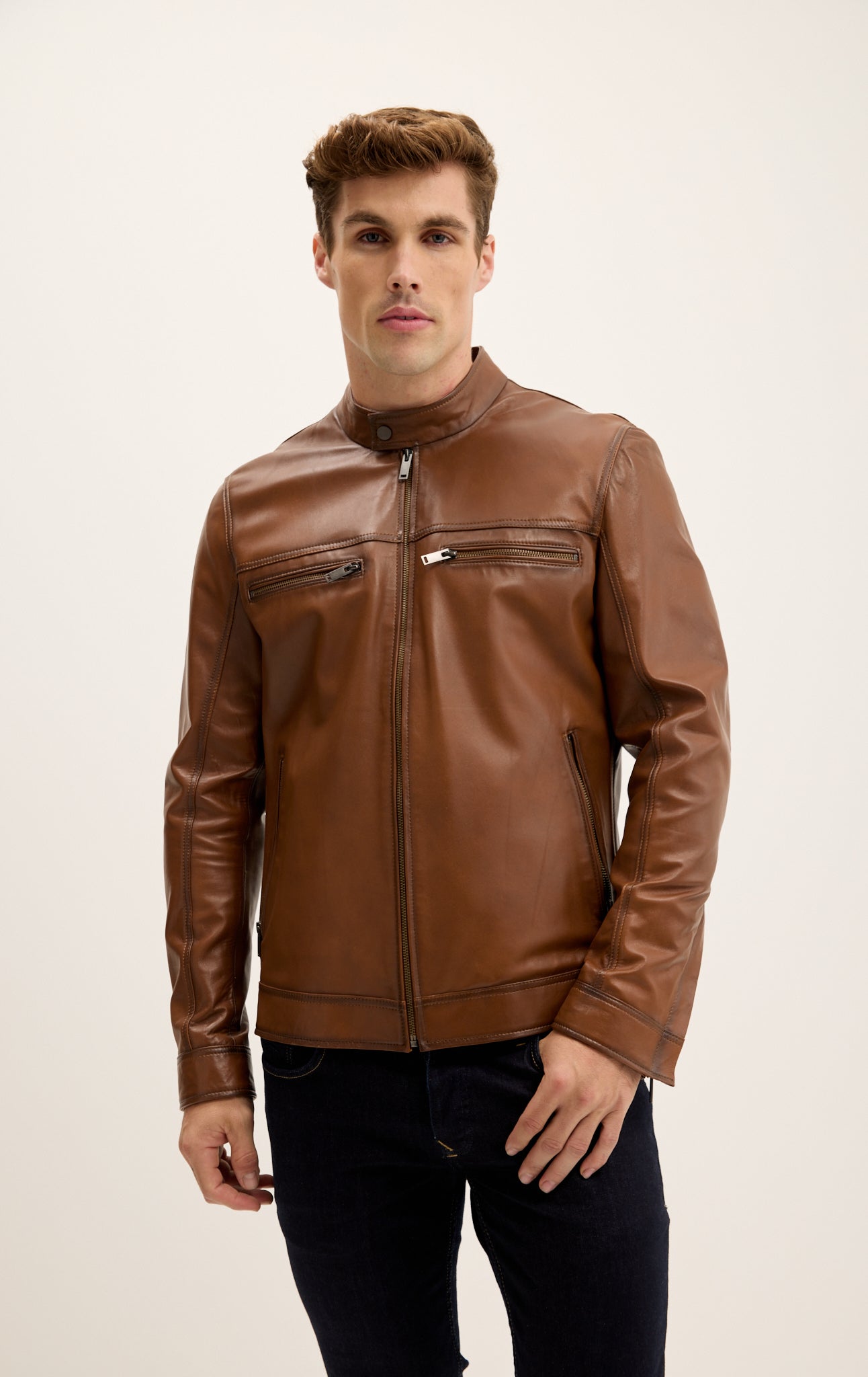 With a clean, traditional cut, our leather jacket features a point collar, a zippered front closure, and adjustable cuffs. The jacket also boasts multiple pockets, including two side pockets and two chest pockets for practical storage.