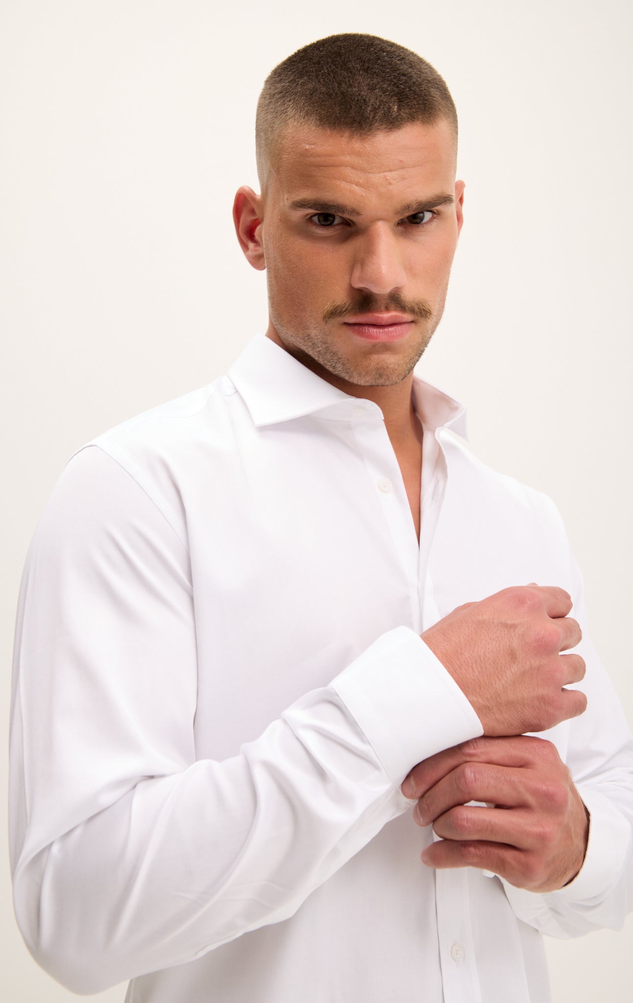 The cuffs are convertible to single-ply french cuffs, just push the button in.