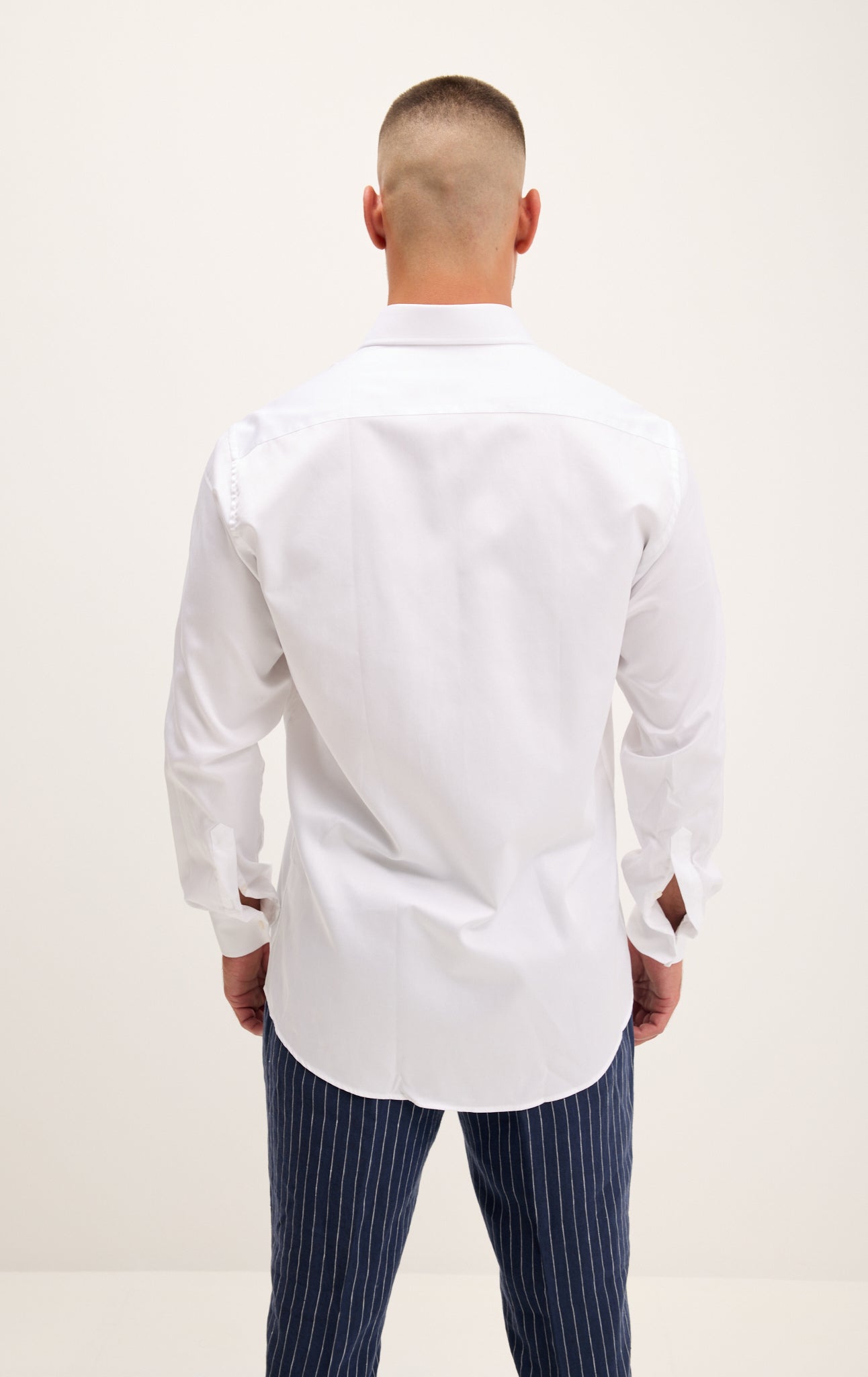 Made with European pure cotton premium 50s single-ply sateen fabric. It is silky and refined.  This high thread count makes a shirt that looks great with denim casually or a clean-suited look.
