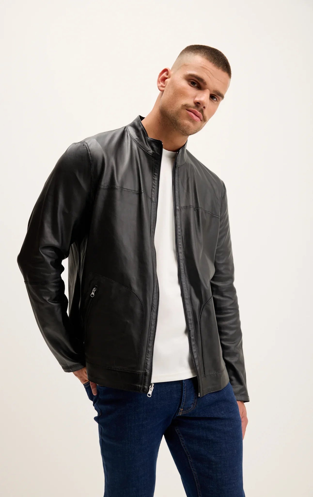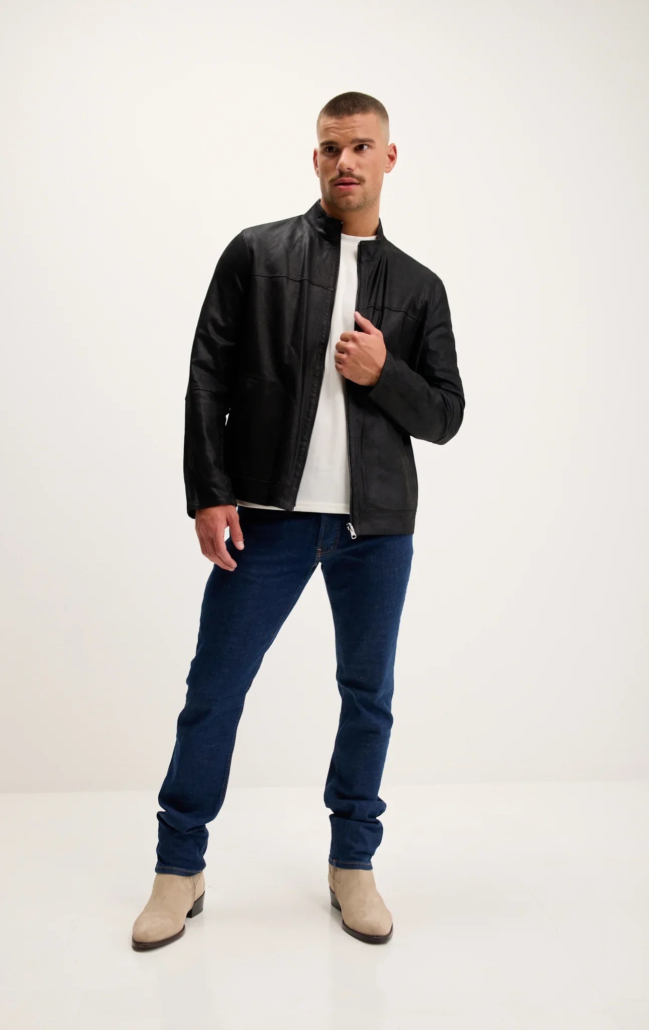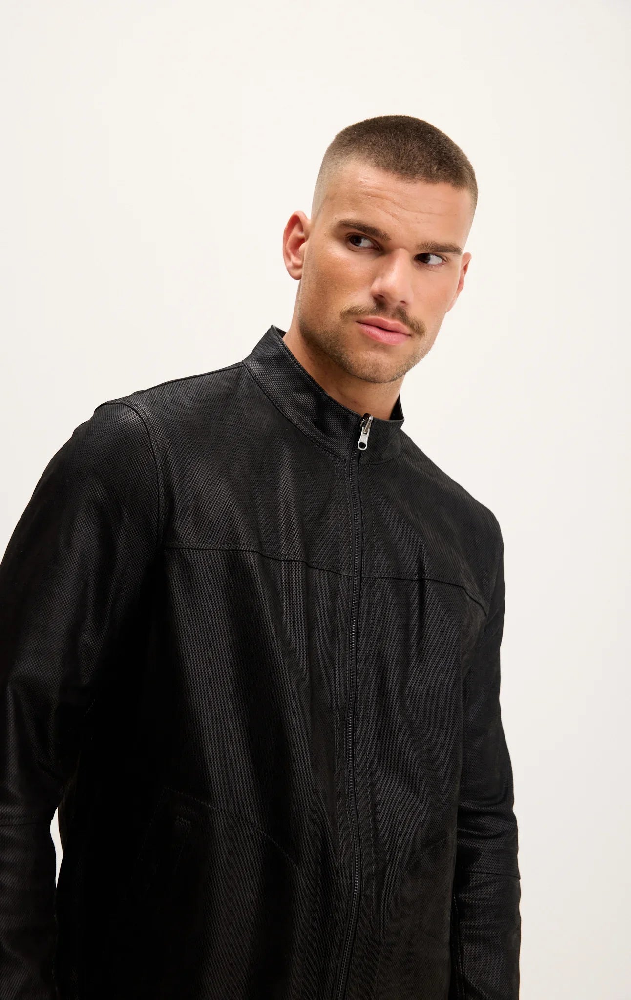 Cut close for a tapered, streamlined fit, this jacket provides a lightweight supple feel for year-round wear. With a zipper closure that runs the length of the jacket, this edgy design pairs well with just about any outfit for an added statement.
