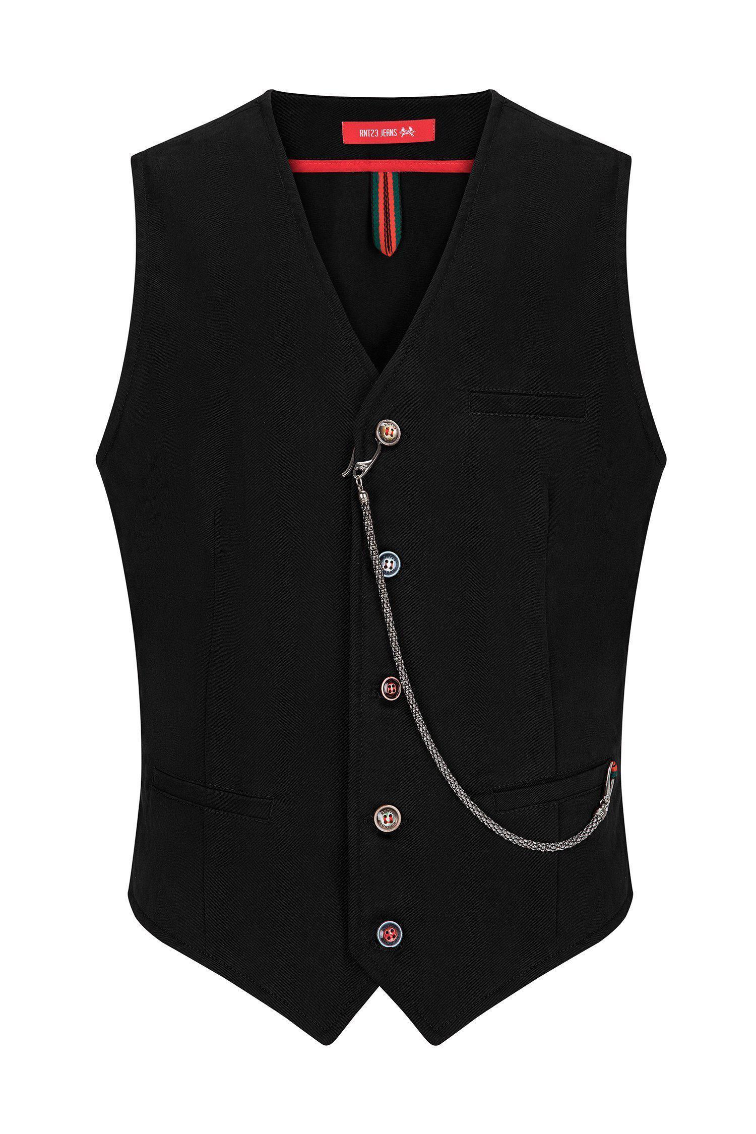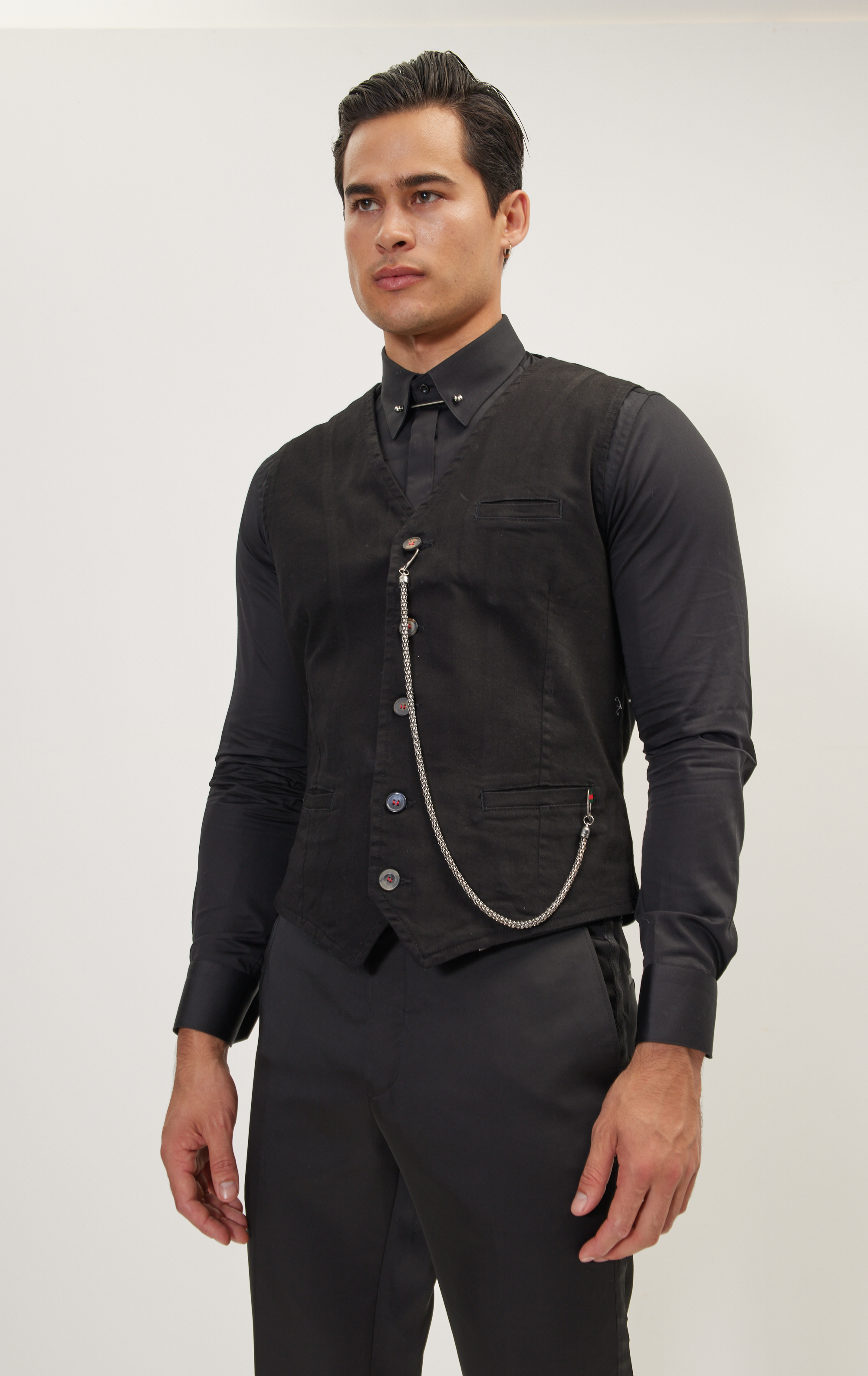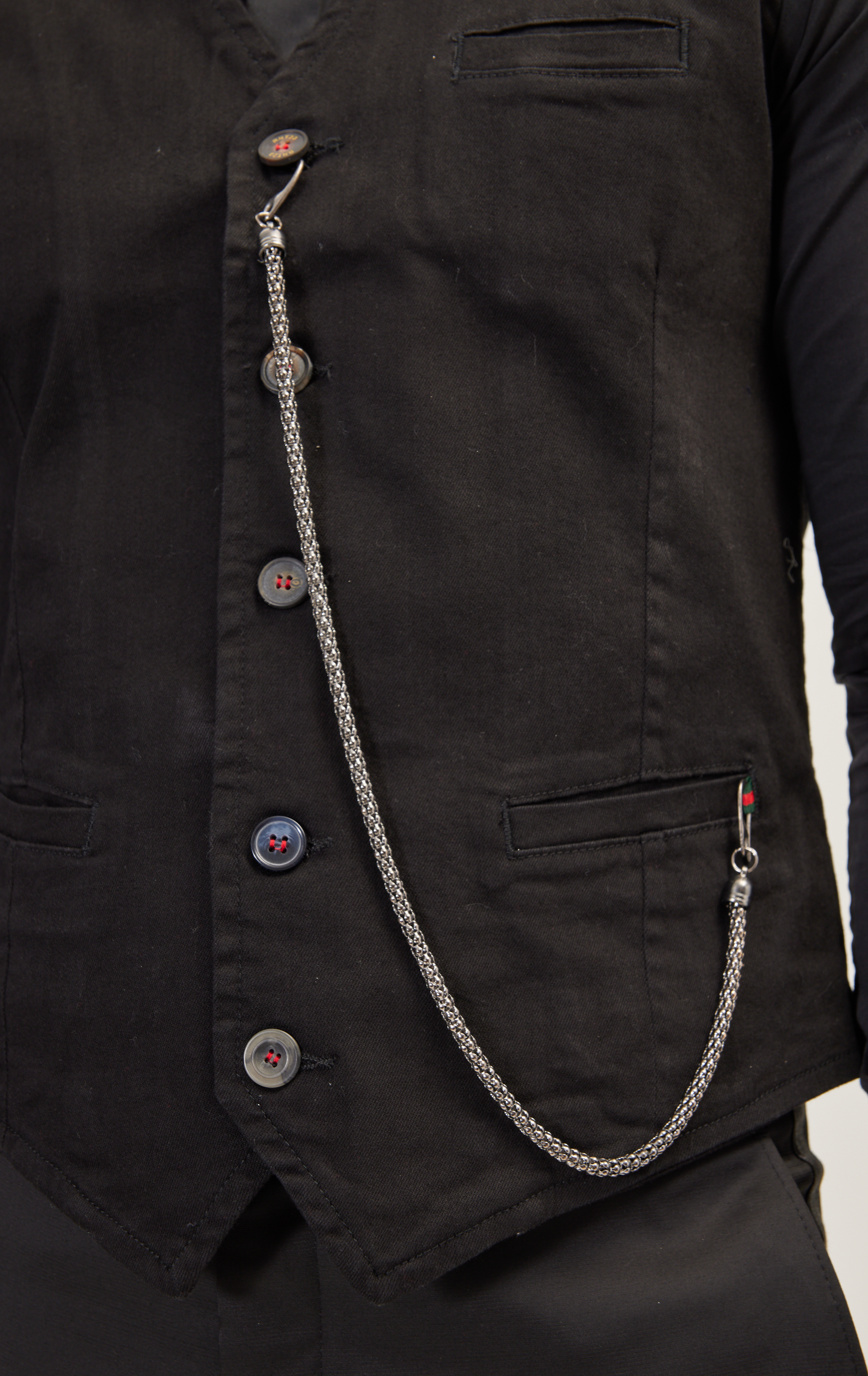 This dense cotton vest is a classic upgrade for any outfit. It makes a statement on its own, detailed with contrasting buttons. Chain is not included.