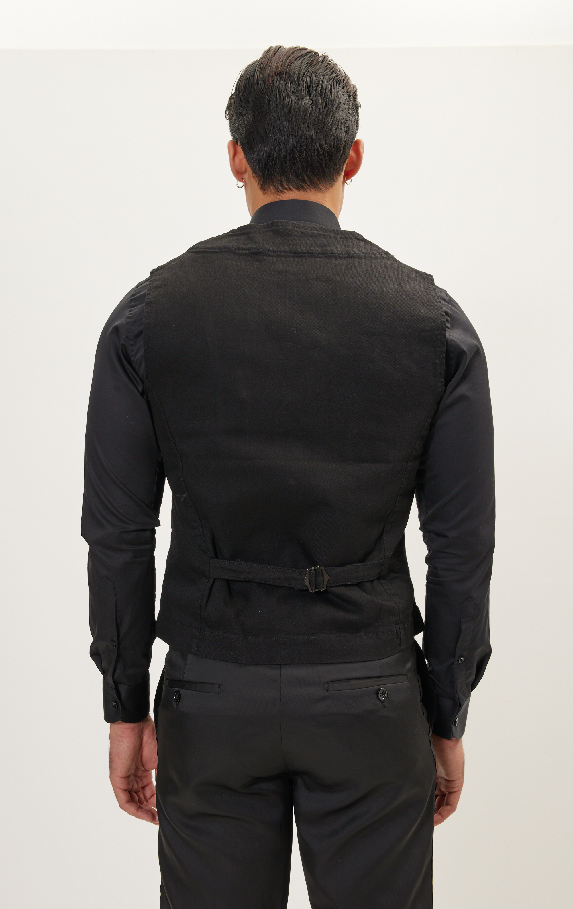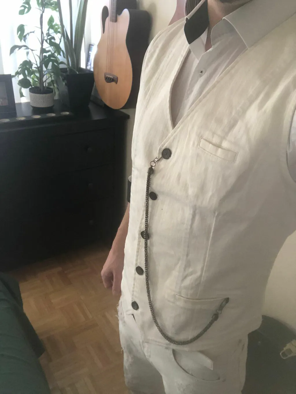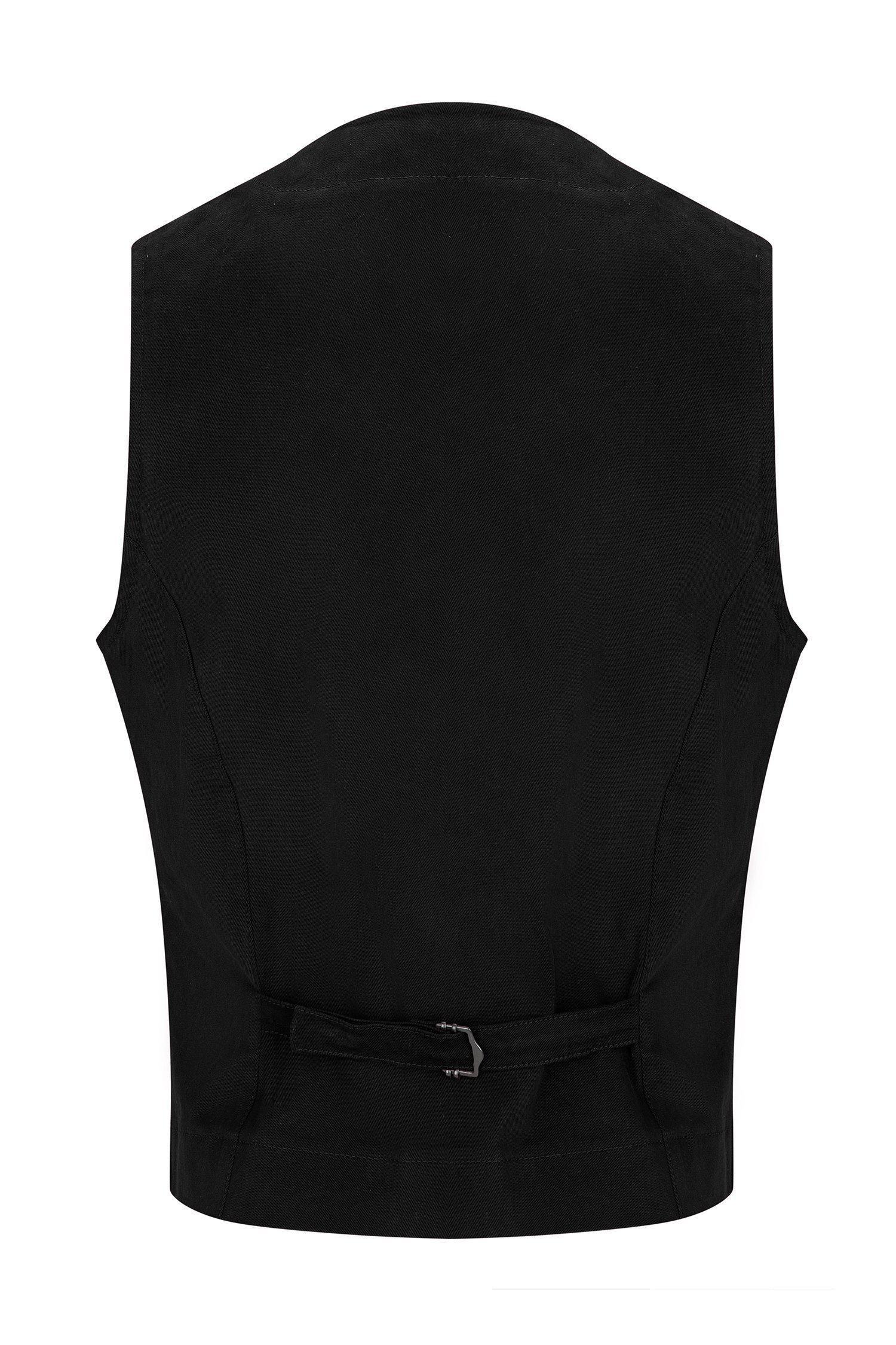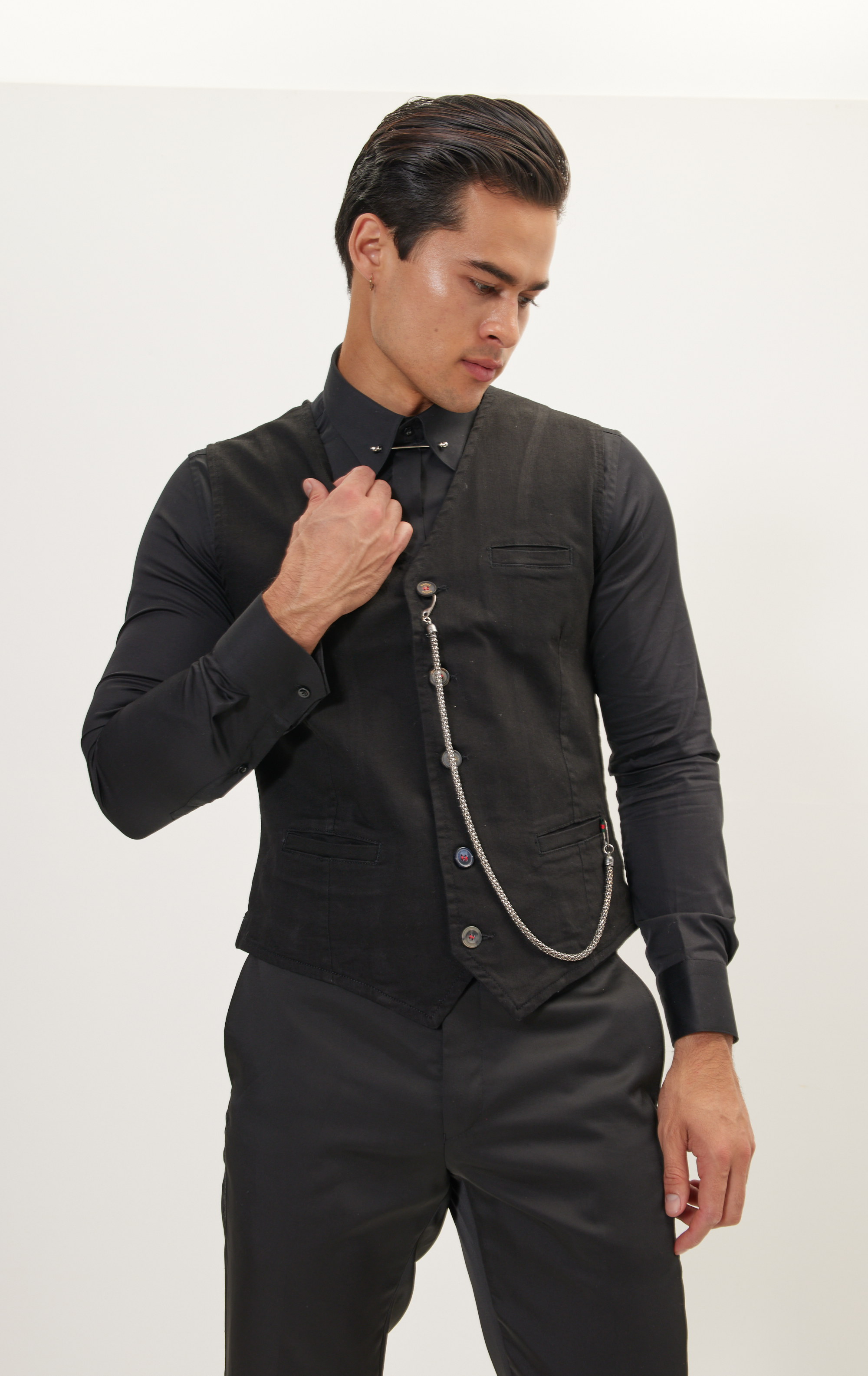 This dense cotton vest is a classic upgrade for any outfit. It makes a statement on its own, detailed with contrasting buttons. Chain is not included.