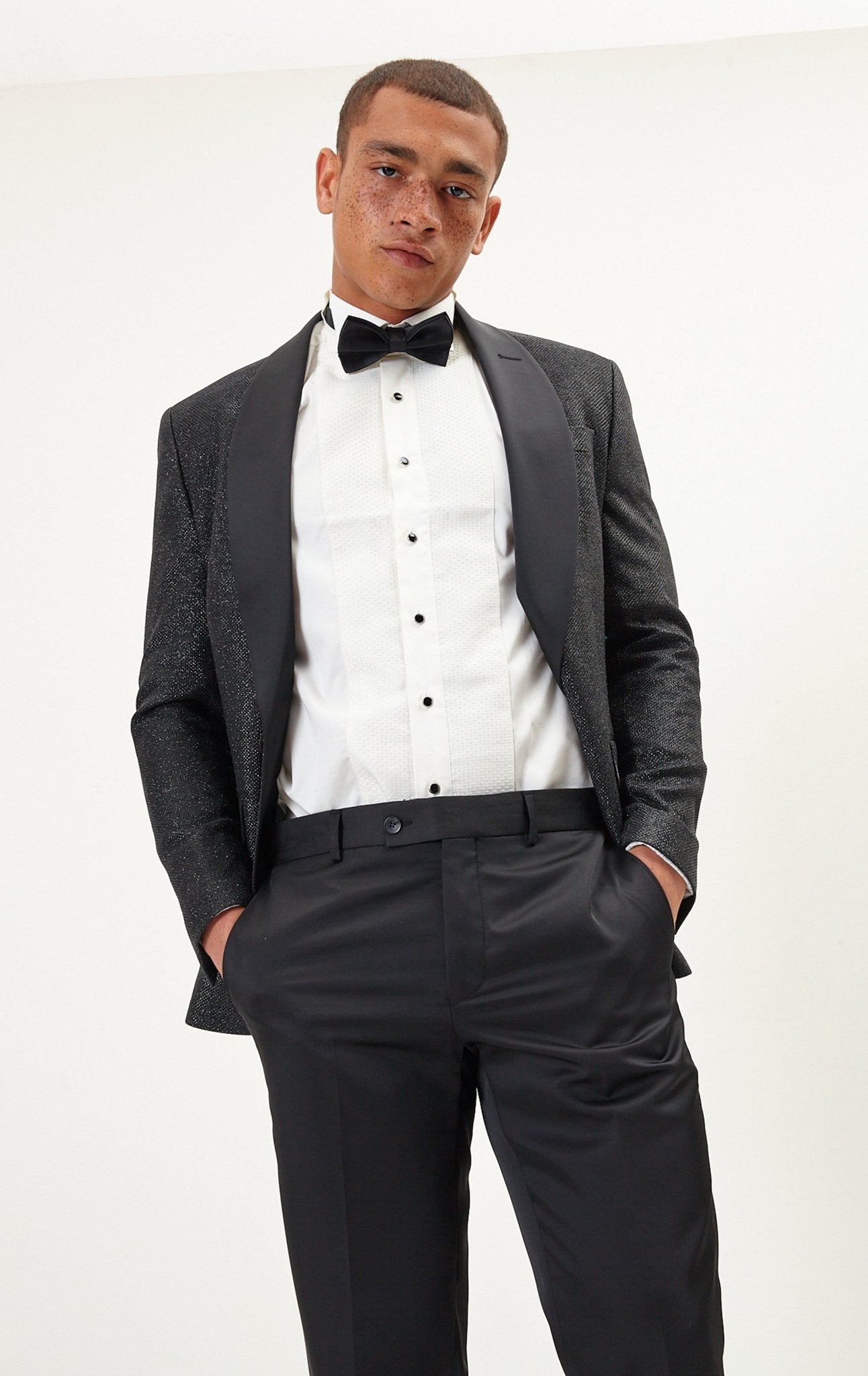 Esta chaqueta de esmoquin está confeccionada con una mezcla equilibrada de viscosa y poliéster, tejida con brillo cristalino en negro intenso. Tiene solapas de chal que alargan su marco y discretos bolsillos con solapa para limpiar el perfil. Complementa el tuyo con una de nuestras camisas blancas crujientes.