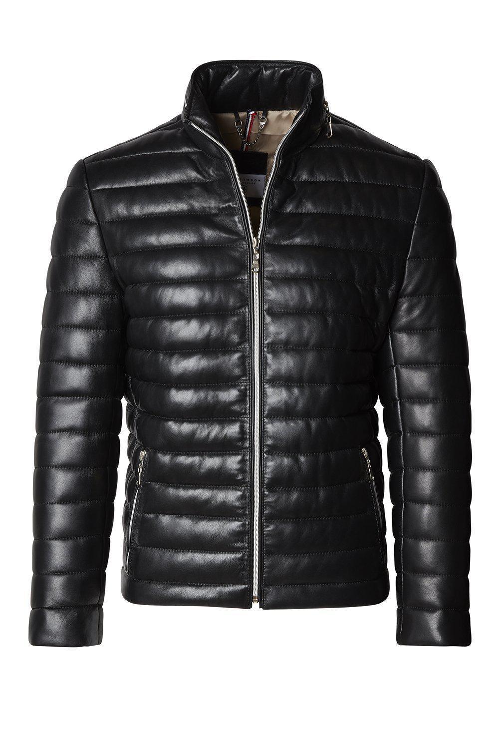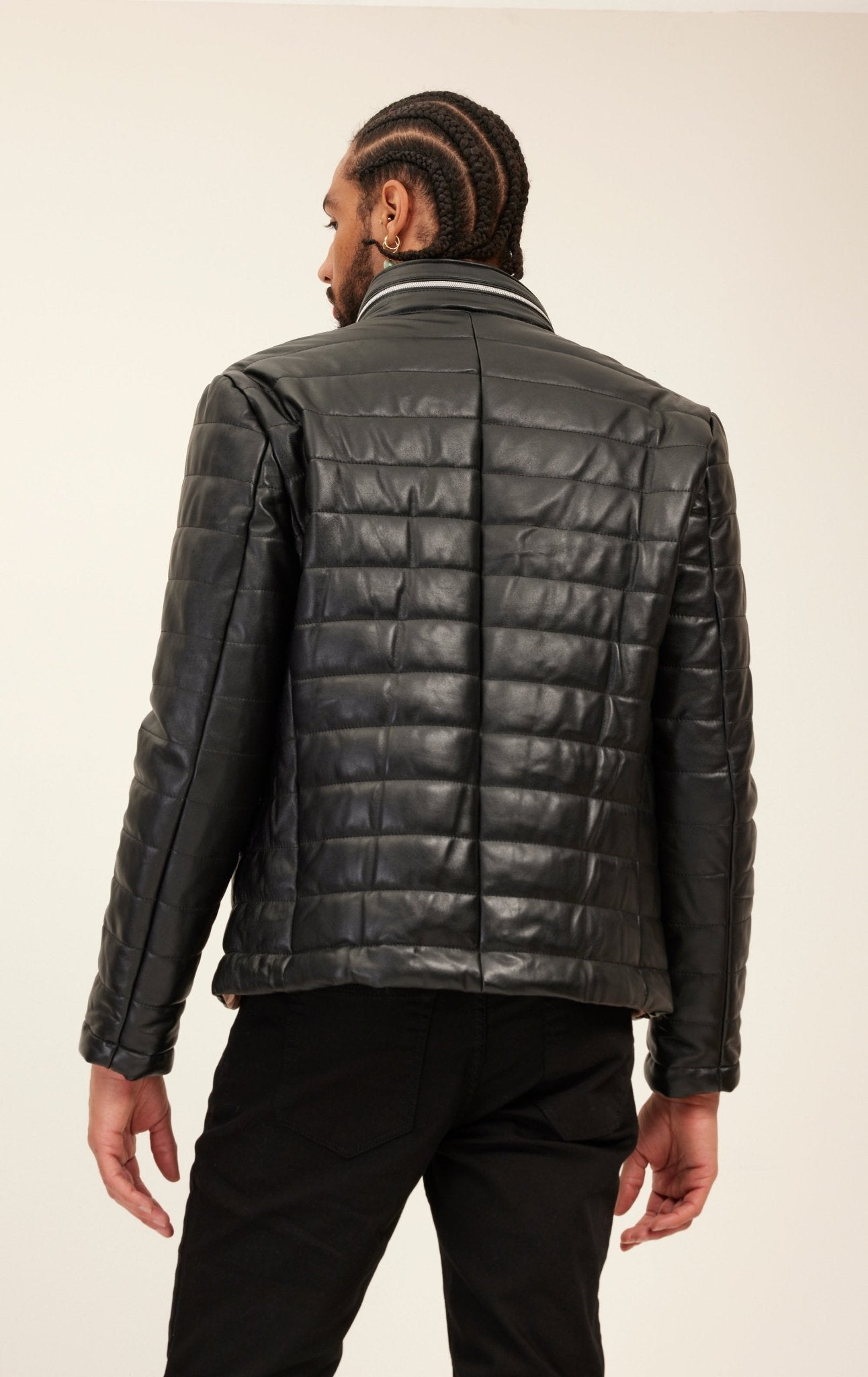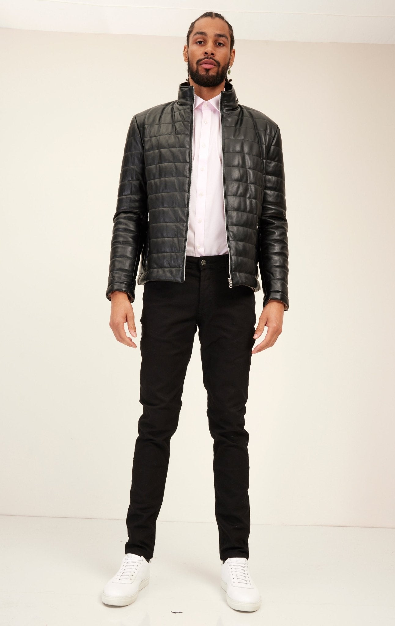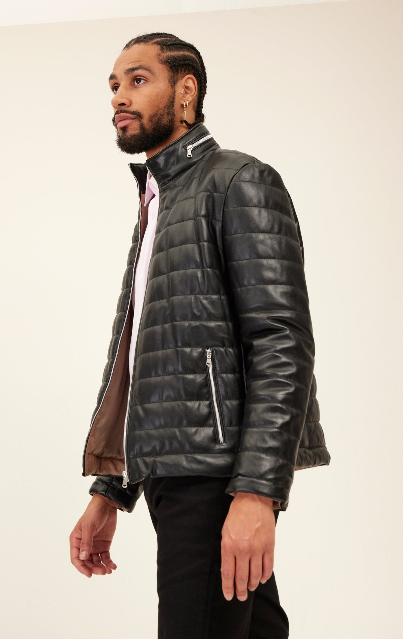 La elegante chaqueta acolchada está hecha de cuero negro flexible, por lo que es más inteligente que las versiones deportivas de nylon. El forro completo y el relleno aseguran el calor durante todo el invierno, mientras que el ajuste cuadrado deja mucho espacio para colocar sobre suéteres gruesos.