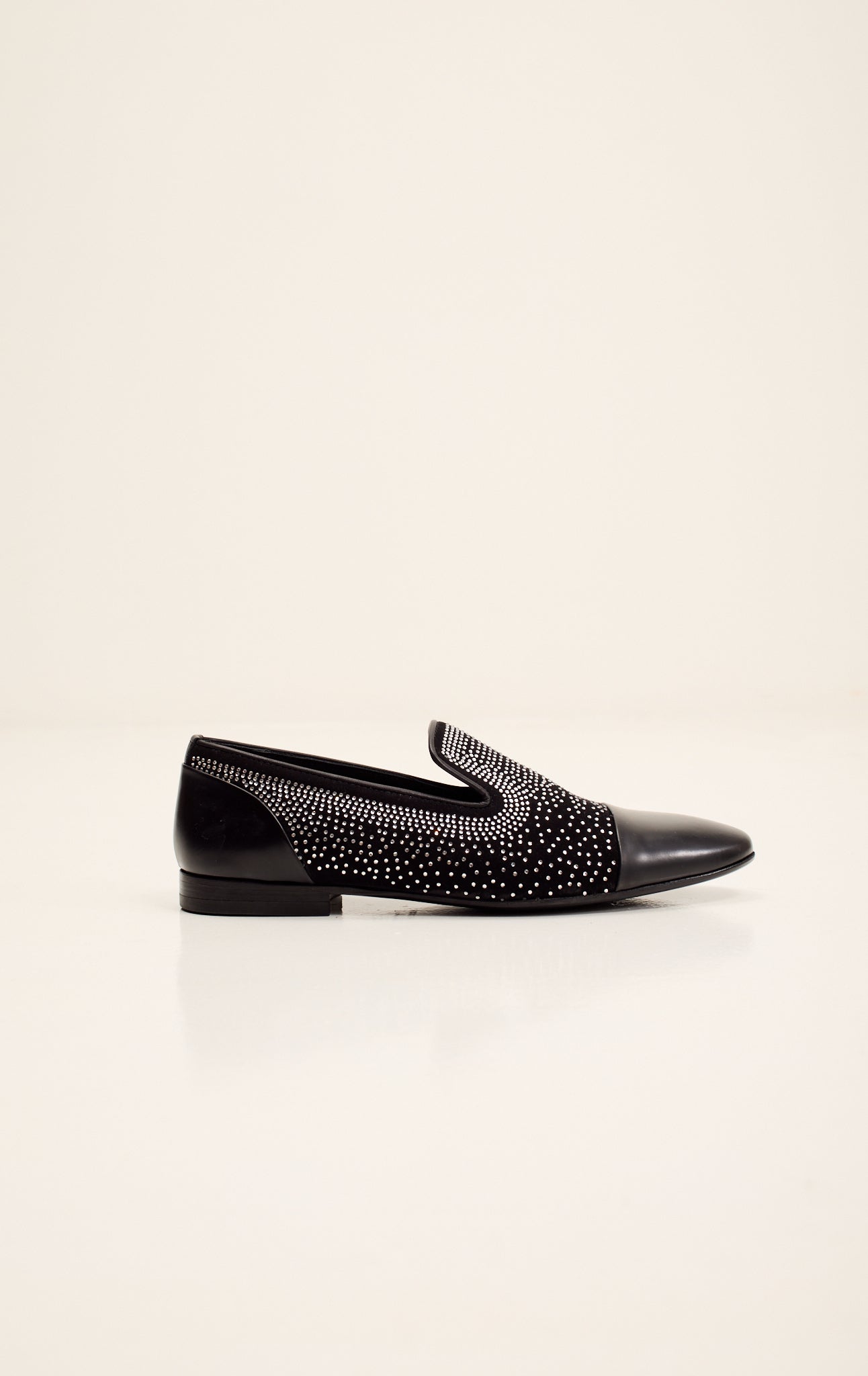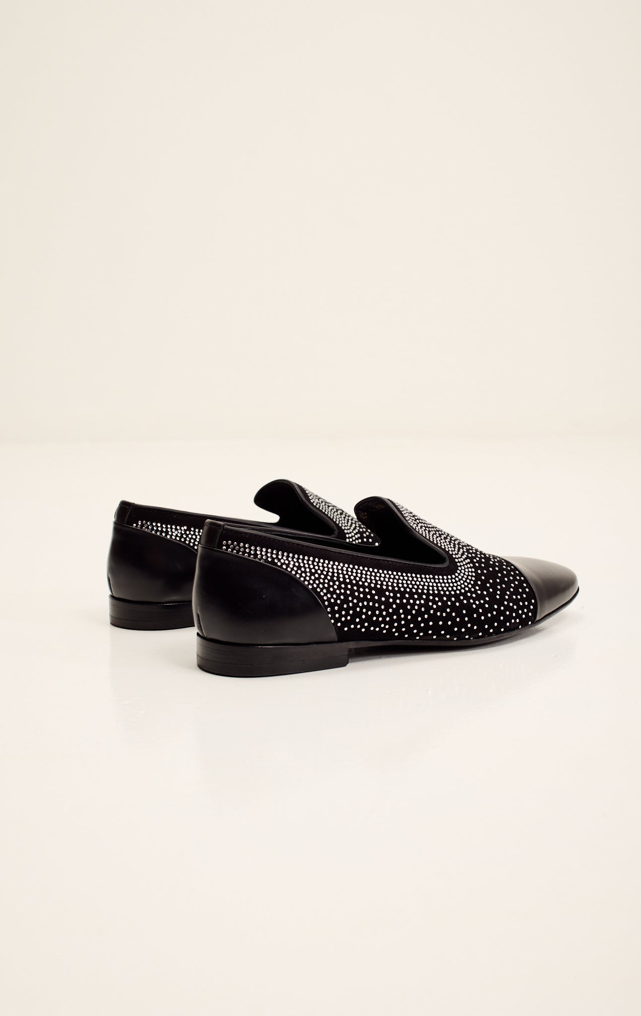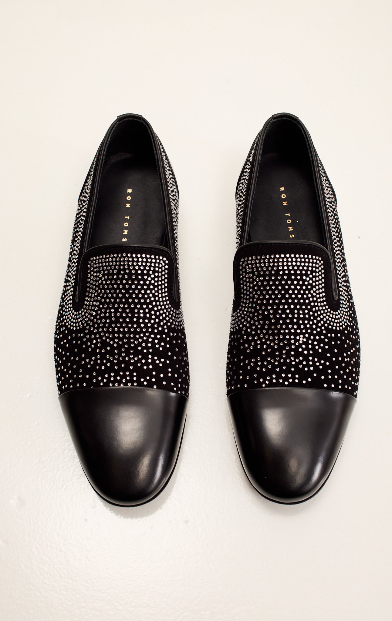 The Ron Tomson Crystal Embellished Formal Suede Loafer combines luxurious suede leather with dazzling crystal embellishments, offering a perfect blend of refined elegance and bold sophistication. This slip-on loafer, featuring a polished leather cap toe for added contrast, ensures a comfortable fit with its Italian-made insole and durable construction.
