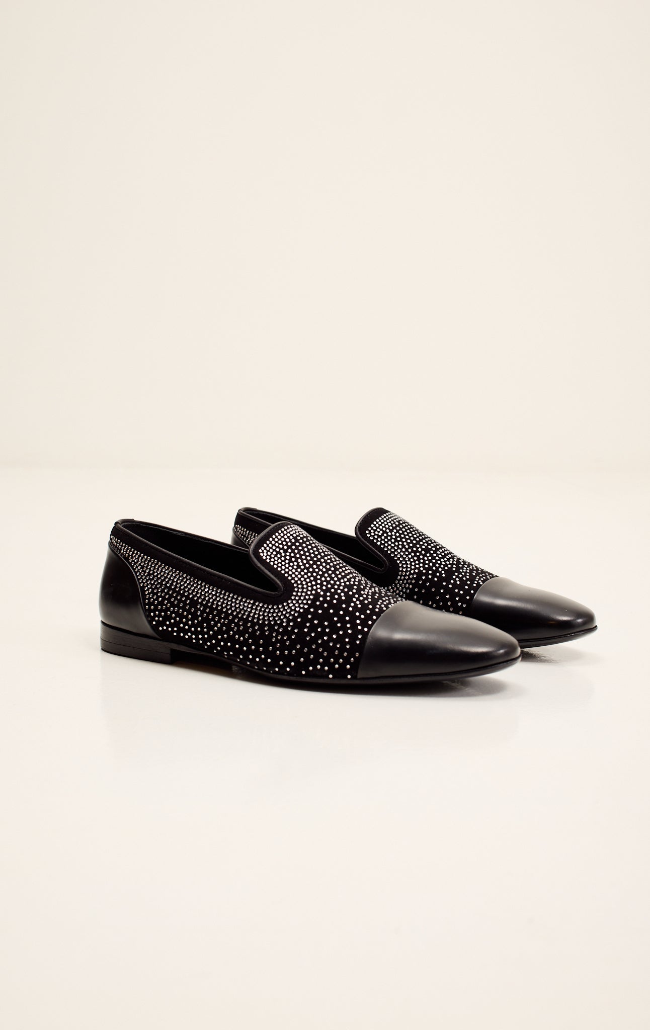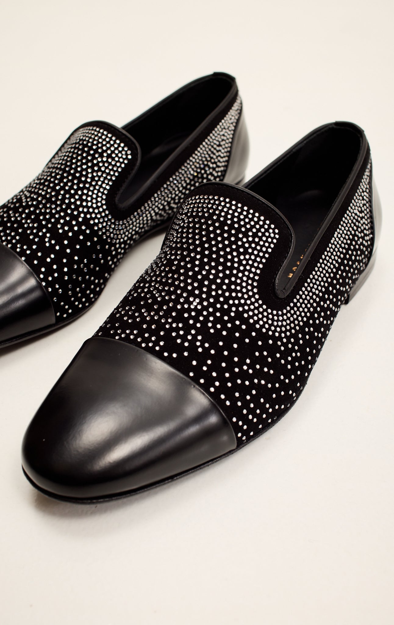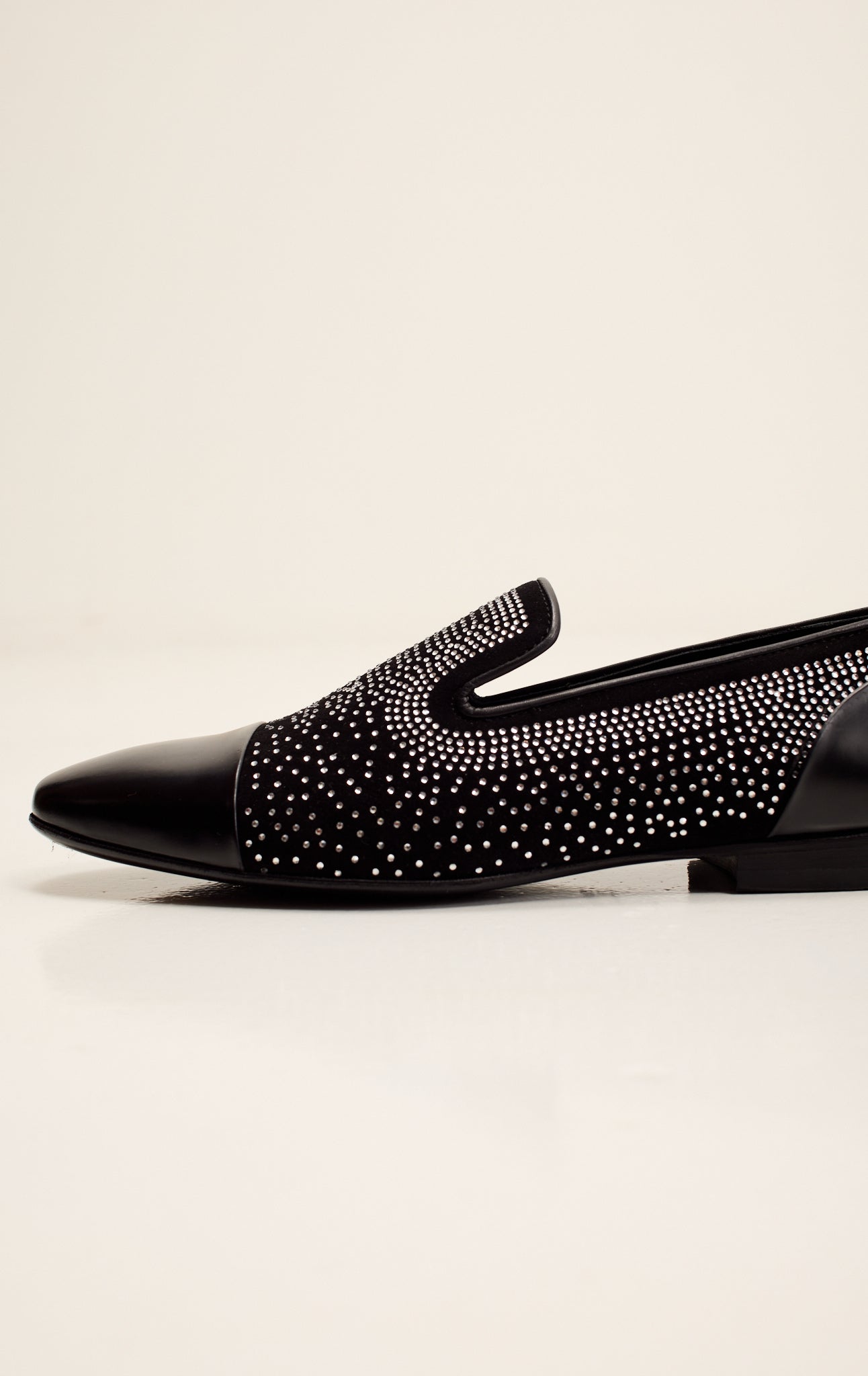 The Ron Tomson Crystal Embellished Formal Suede Loafer combines luxurious suede leather with dazzling crystal embellishments, offering a perfect blend of refined elegance and bold sophistication. This slip-on loafer, featuring a polished leather cap toe for added contrast, ensures a comfortable fit with its Italian-made insole and durable construction.