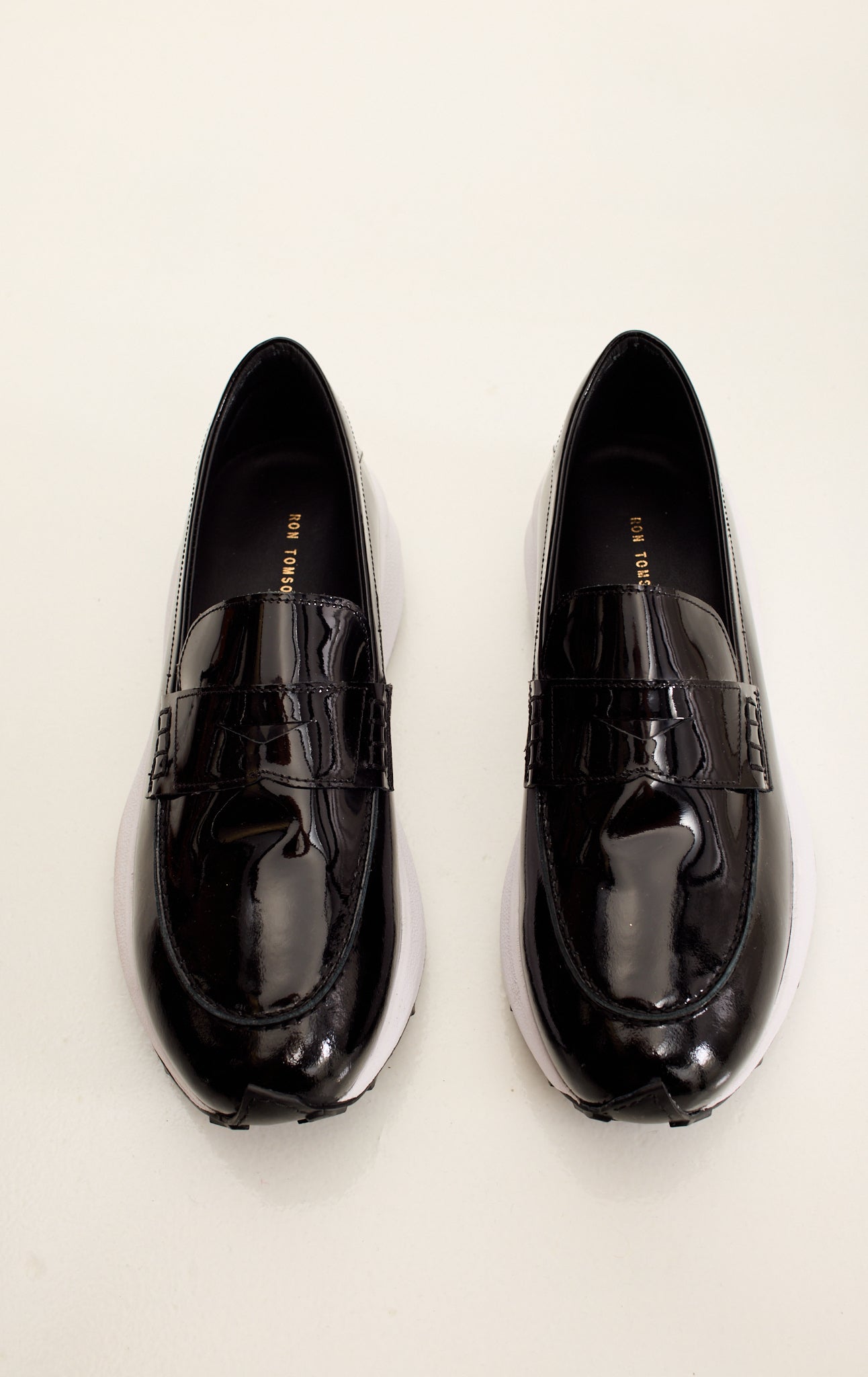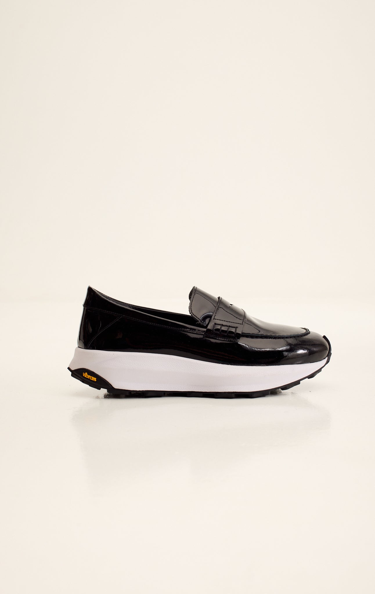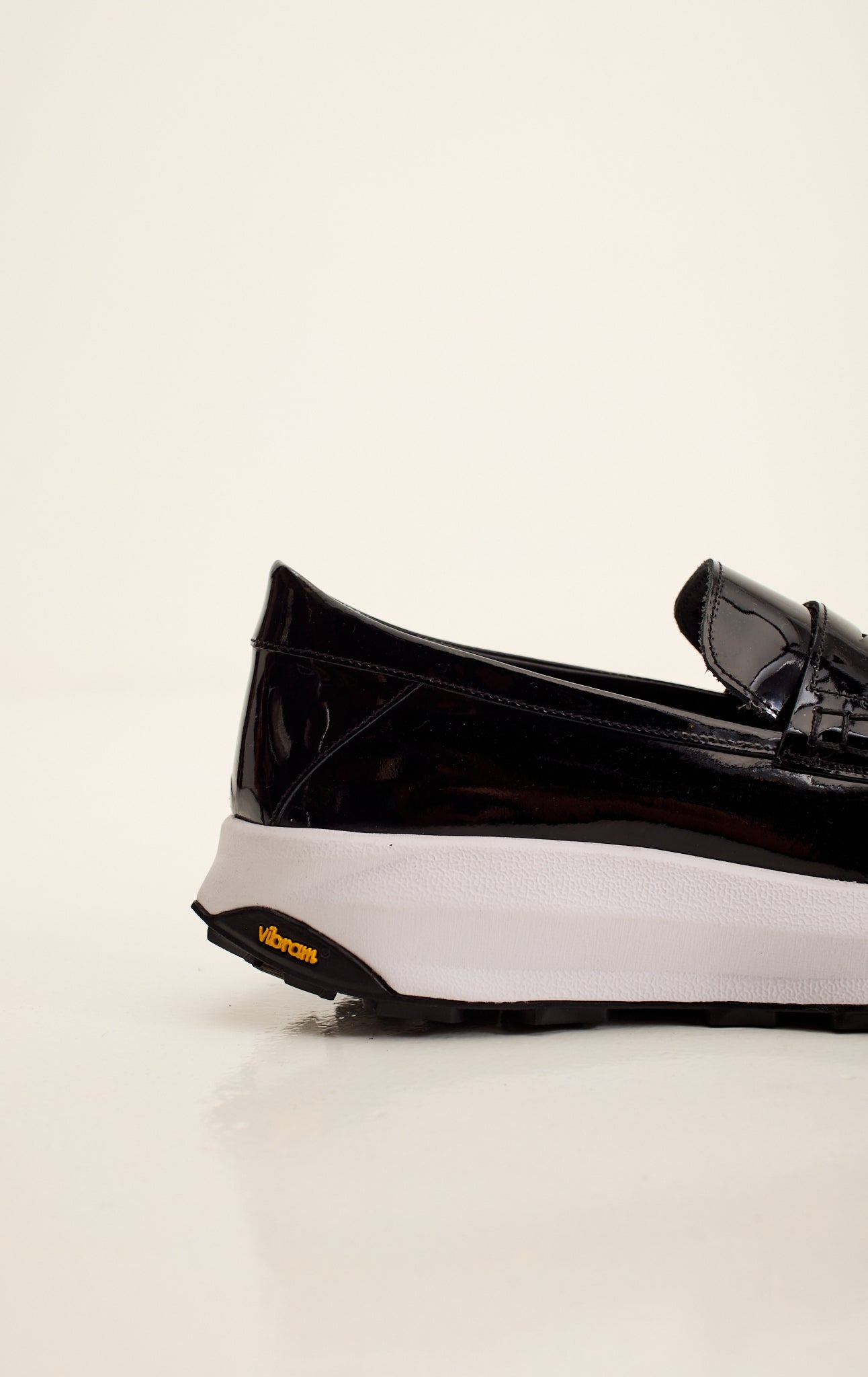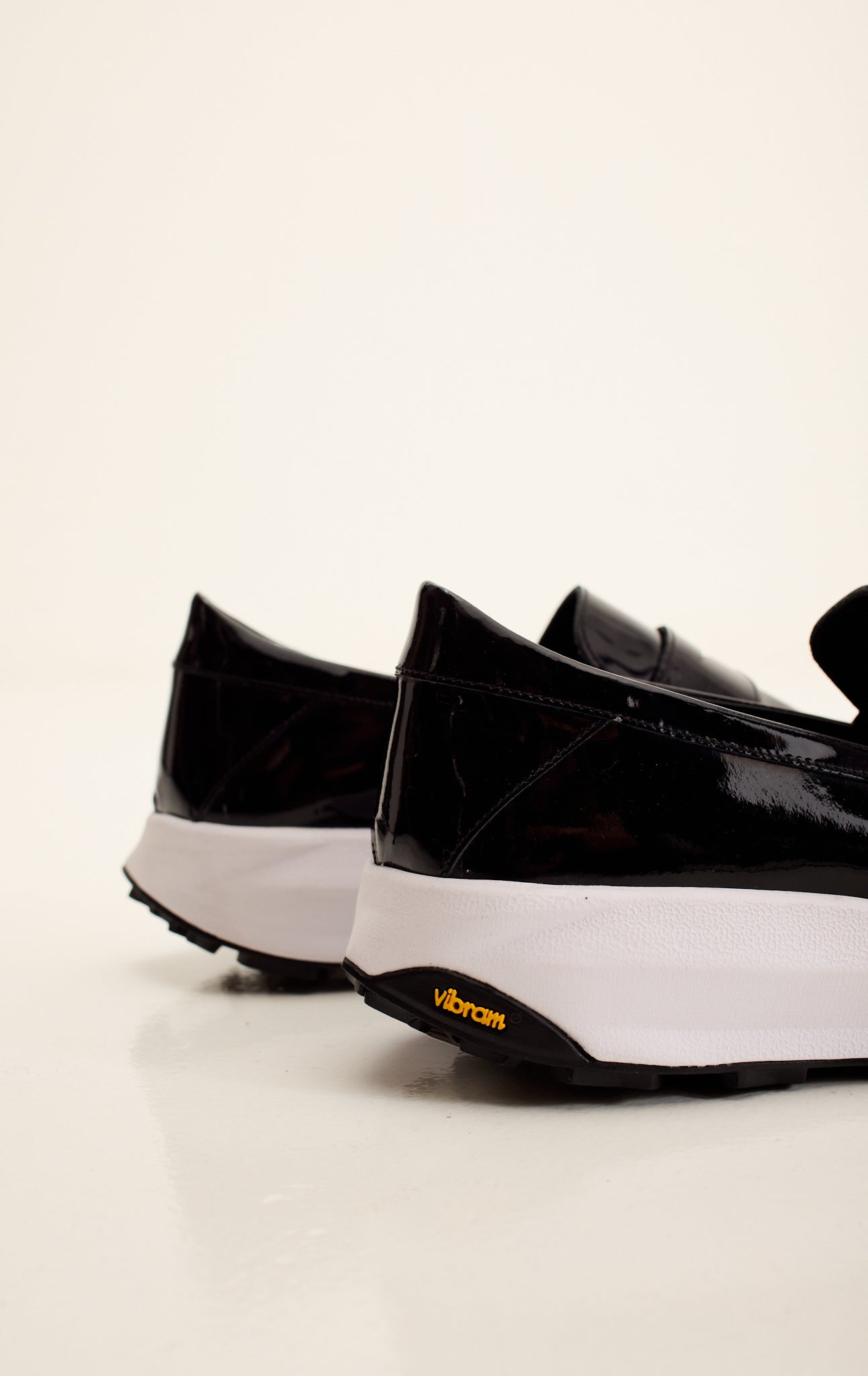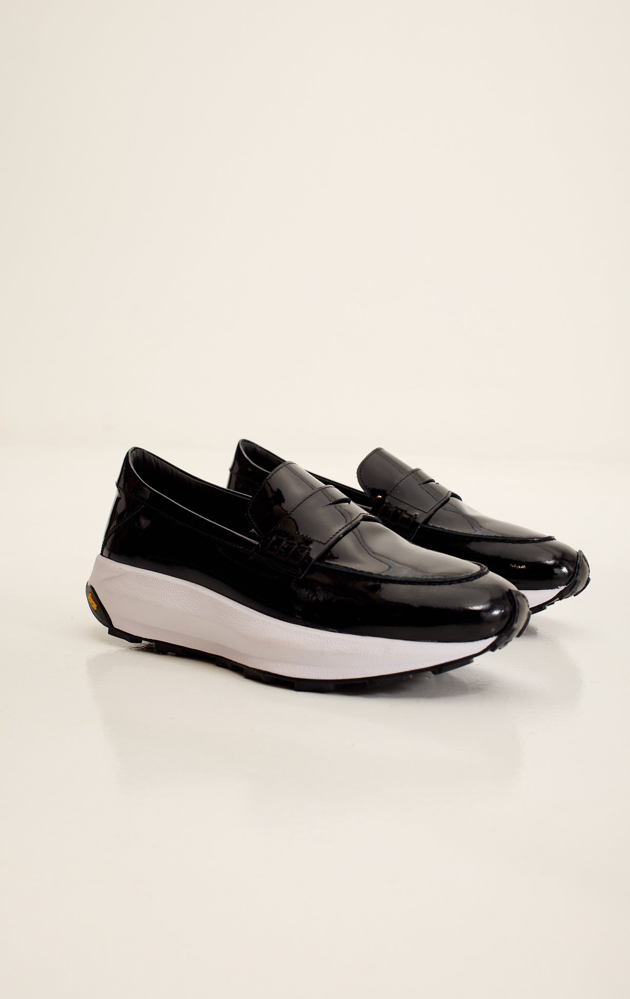 Make a bold statement with these striking black loafers, crafted from glossy patent leather. Featuring Italian Vibram soles for superior traction and durability, these shoes fuse high-shine elegance with modern comfort. The sleek design and cushioned sole make them perfect for elevating any outfit, from casual to formal occasions.