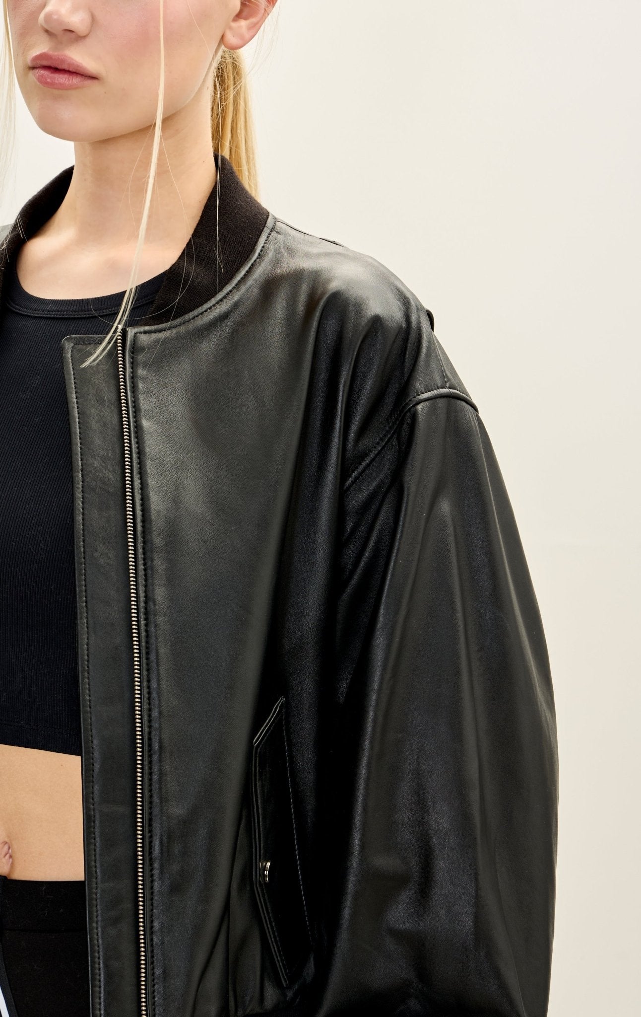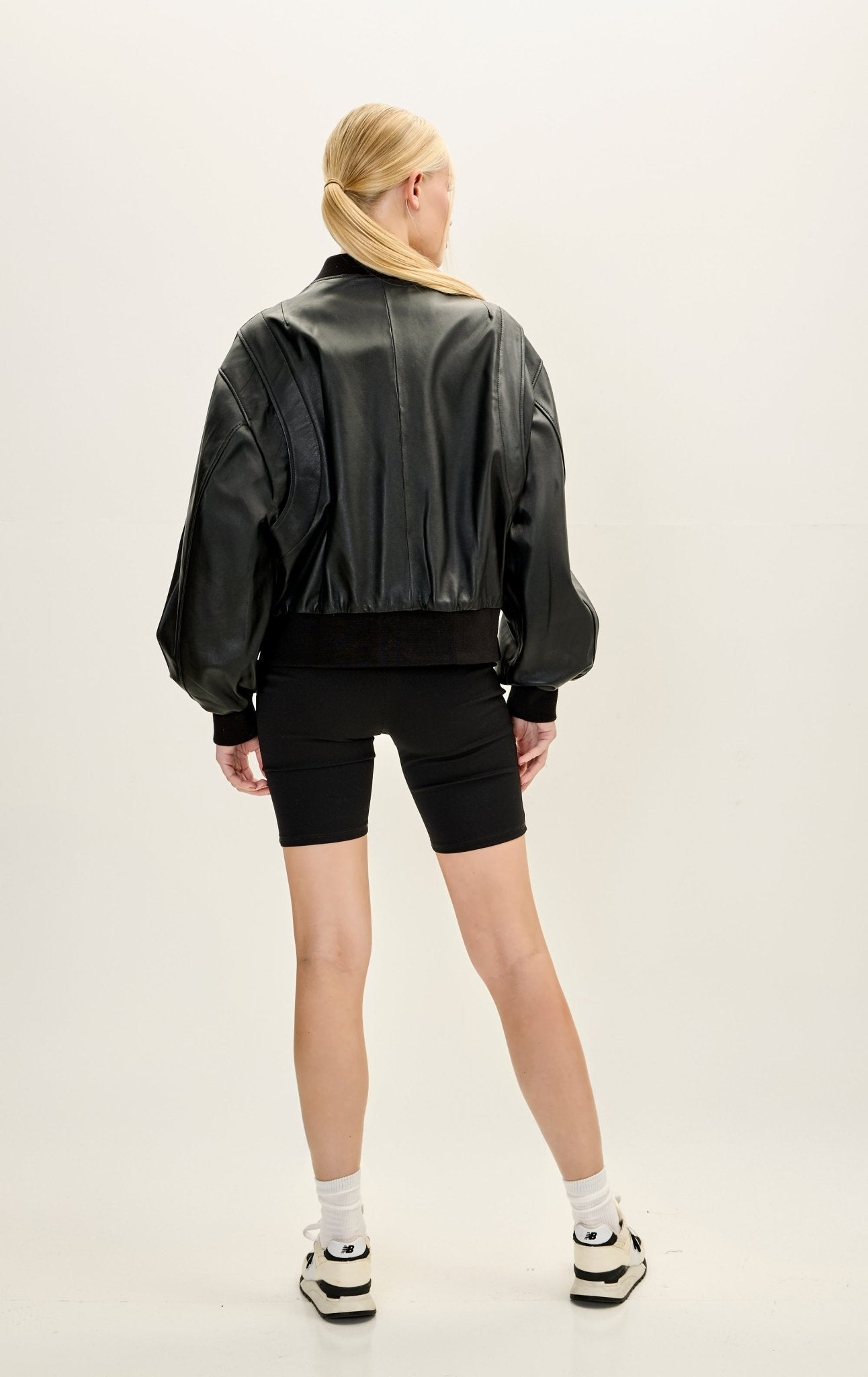 Our buttery soft lambskin jacket is designed with distinctive bubble sleeves and an elasticized hem, making it a truly eye-catching...