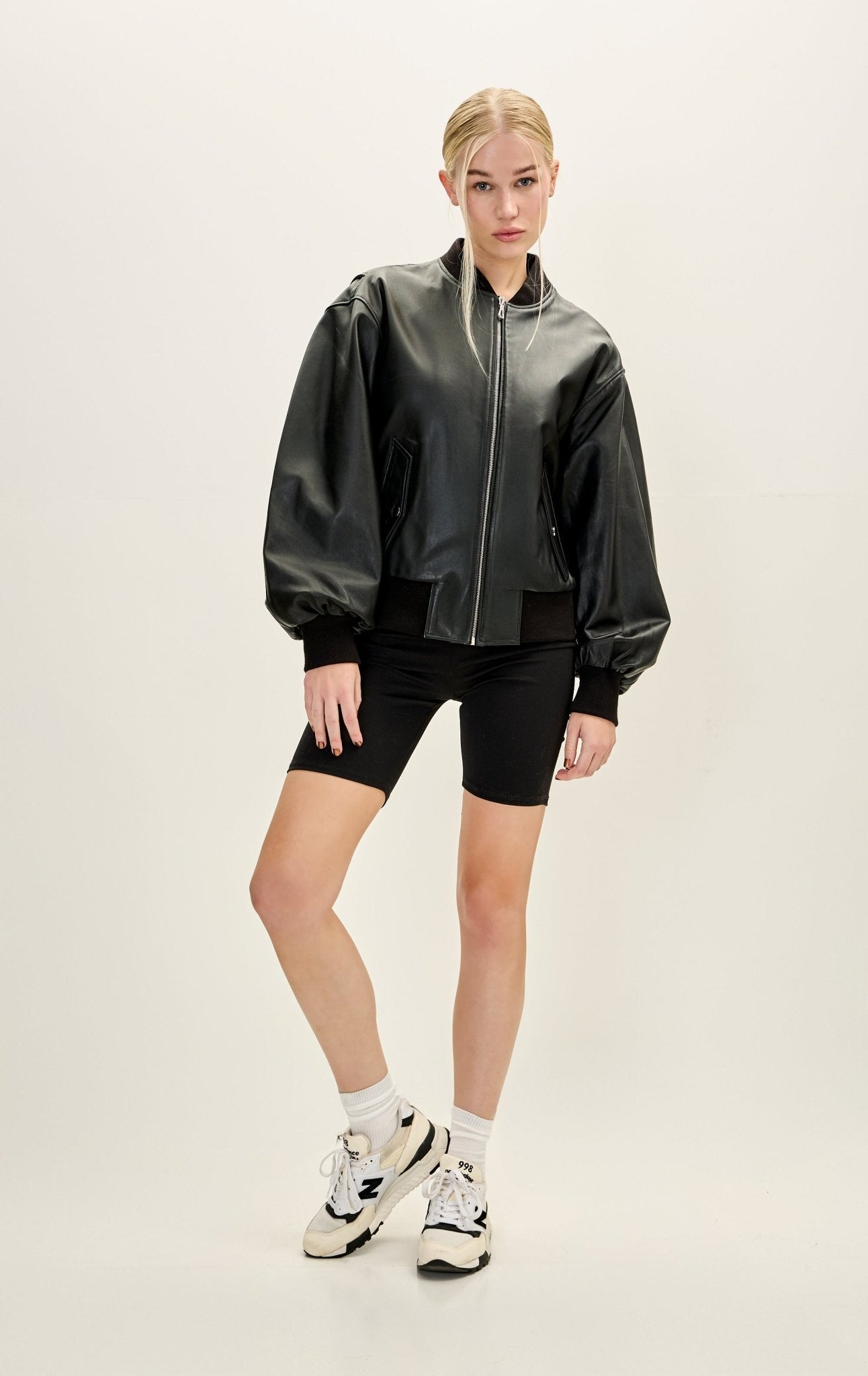 Our buttery soft lambskin jacket is designed with distinctive bubble sleeves and an elasticized hem, making it a truly eye-catching piece. Collarless design adds a modern touch while snap button side pockets ensure the functionality.