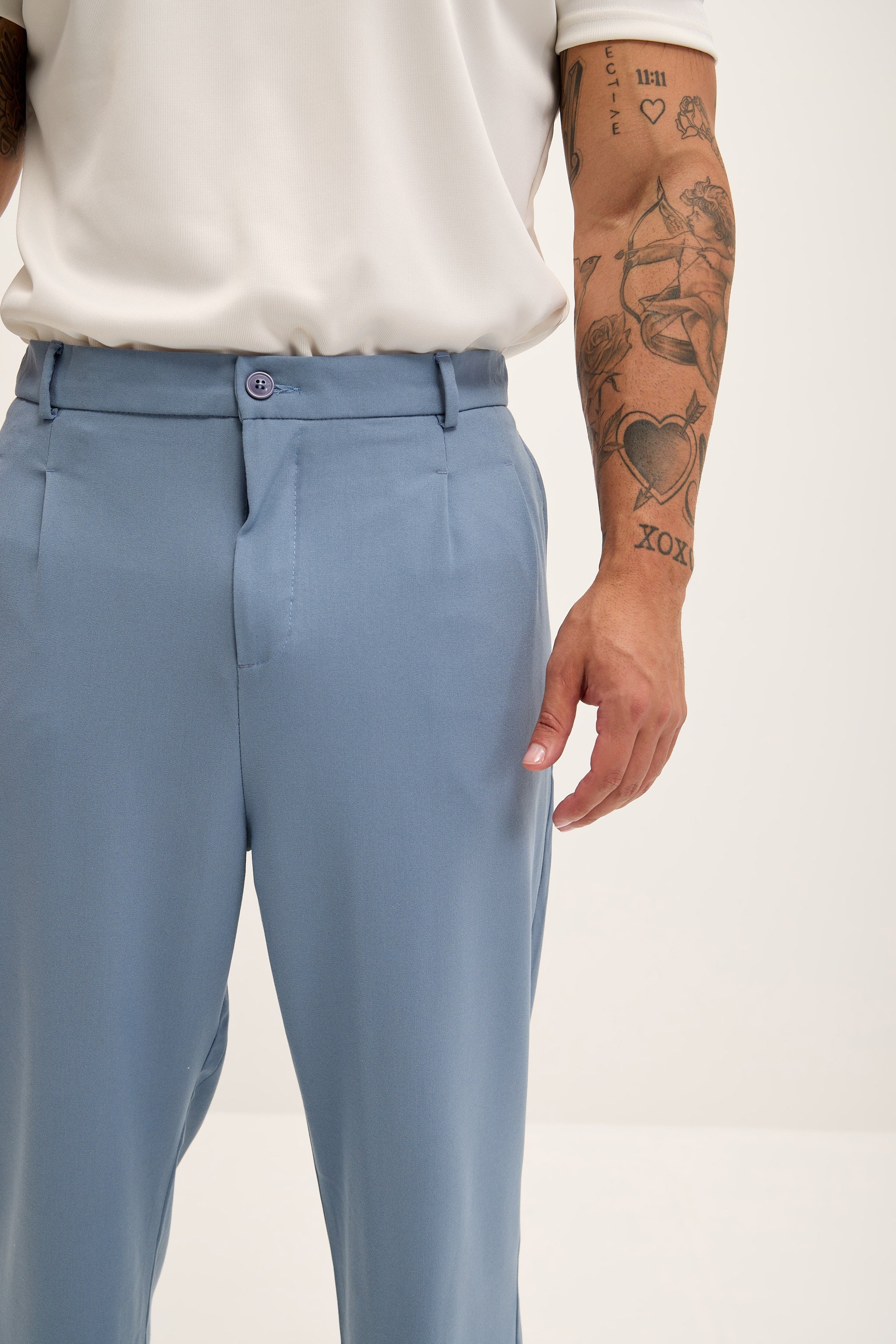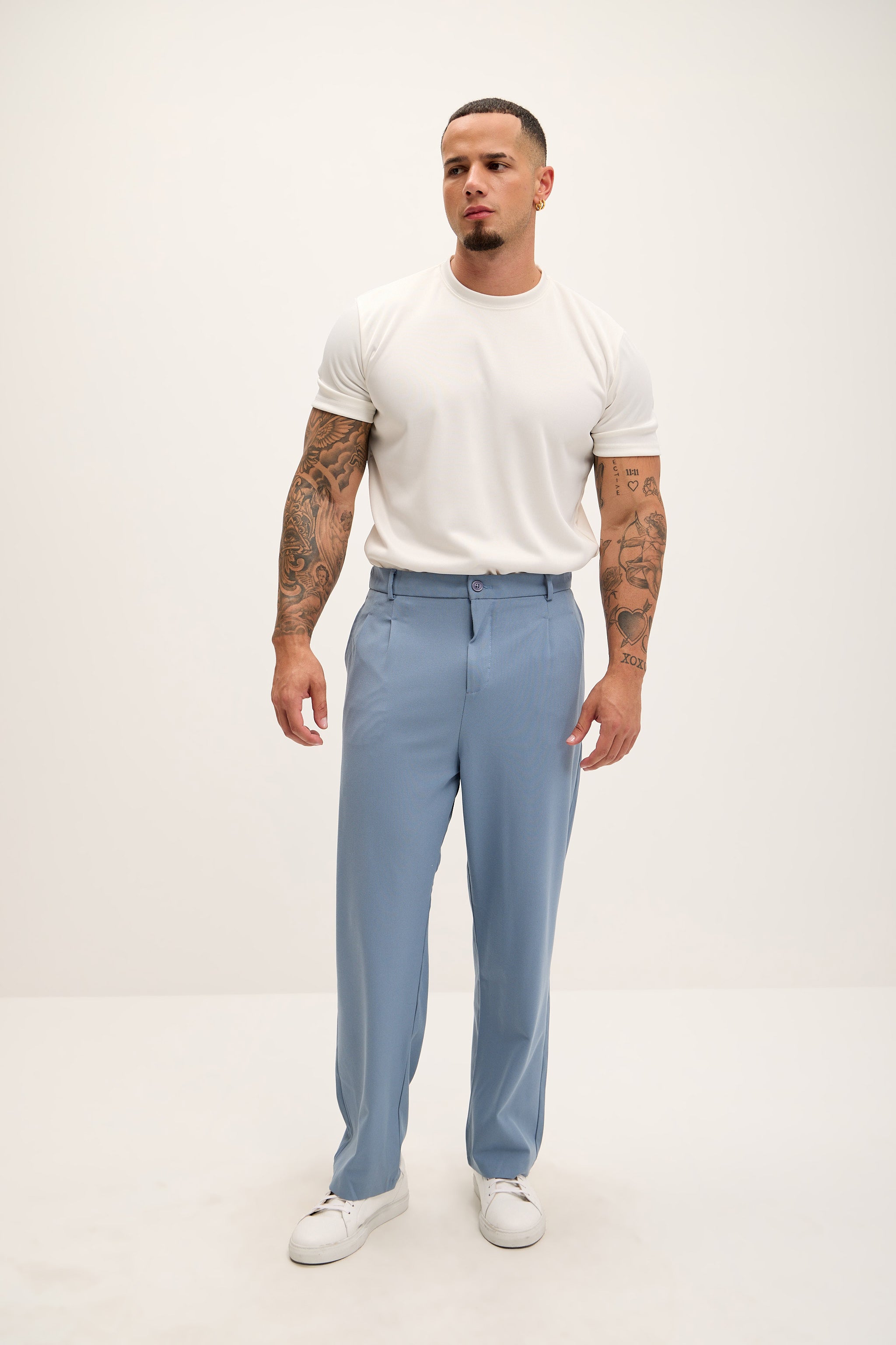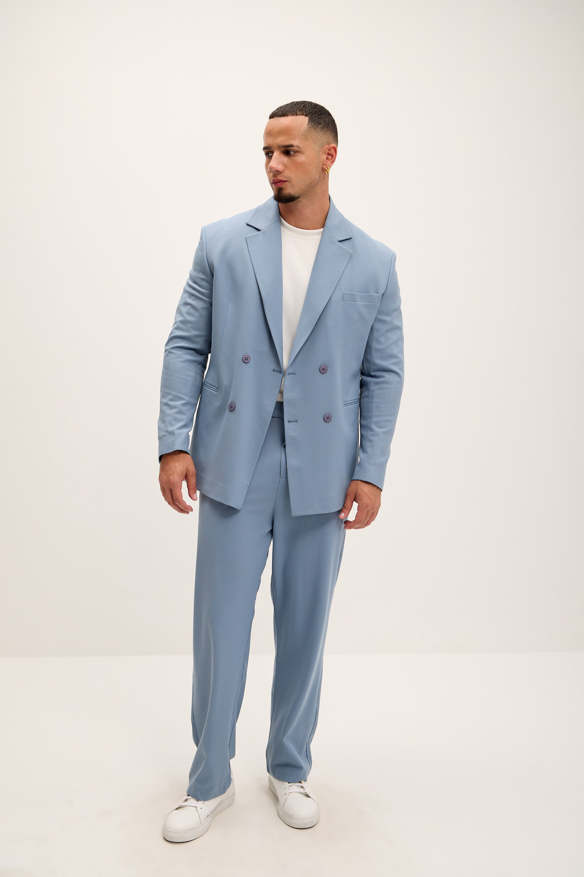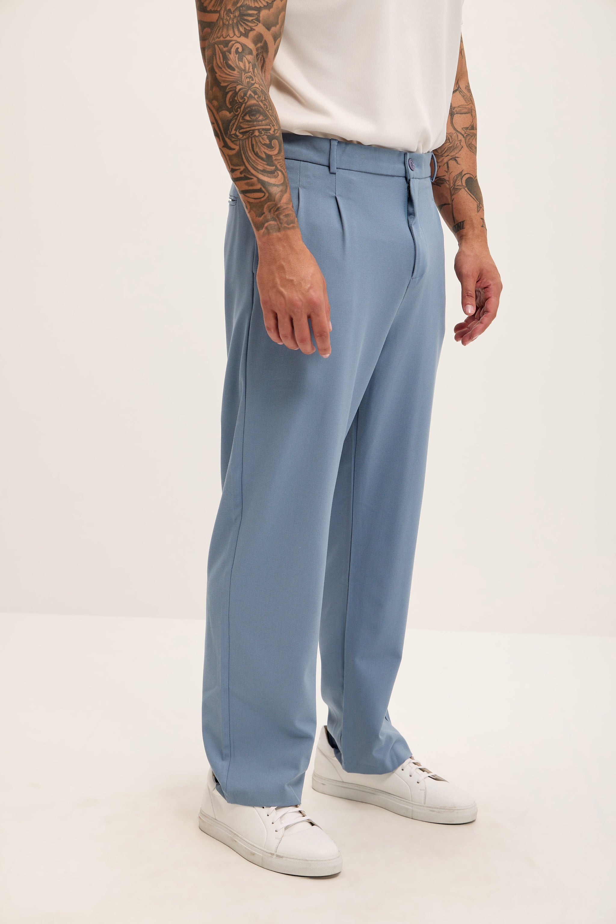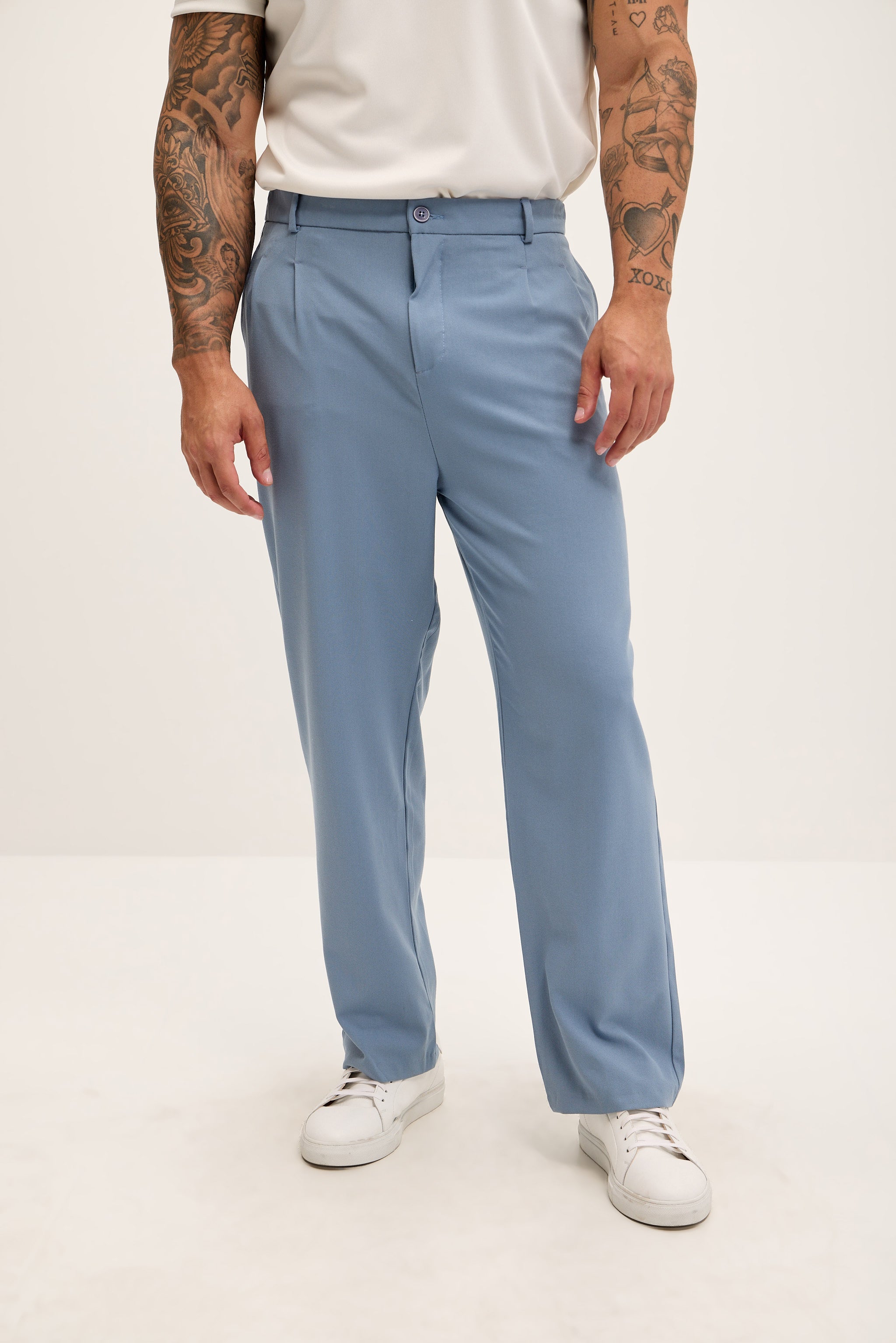 Ce pantalon décontracté présente une coupe ample et fluide, des plis simples, des passants de ceinture et de profondes poches latérales et arrière. Son ourlet non retroussé accentue son style décontracté. À porter avec la veste croisée assortie pour une allure coordonnée et élégante.