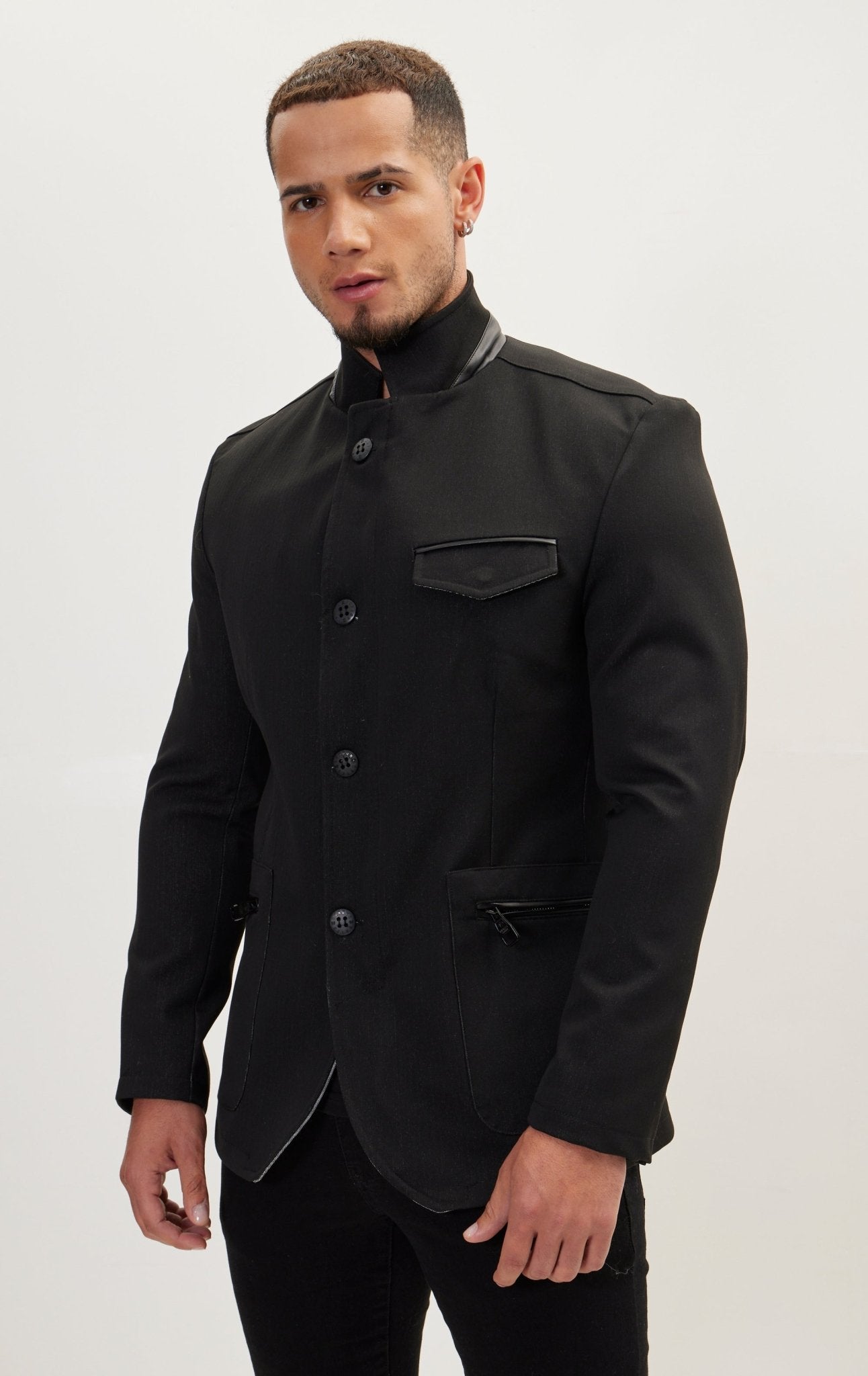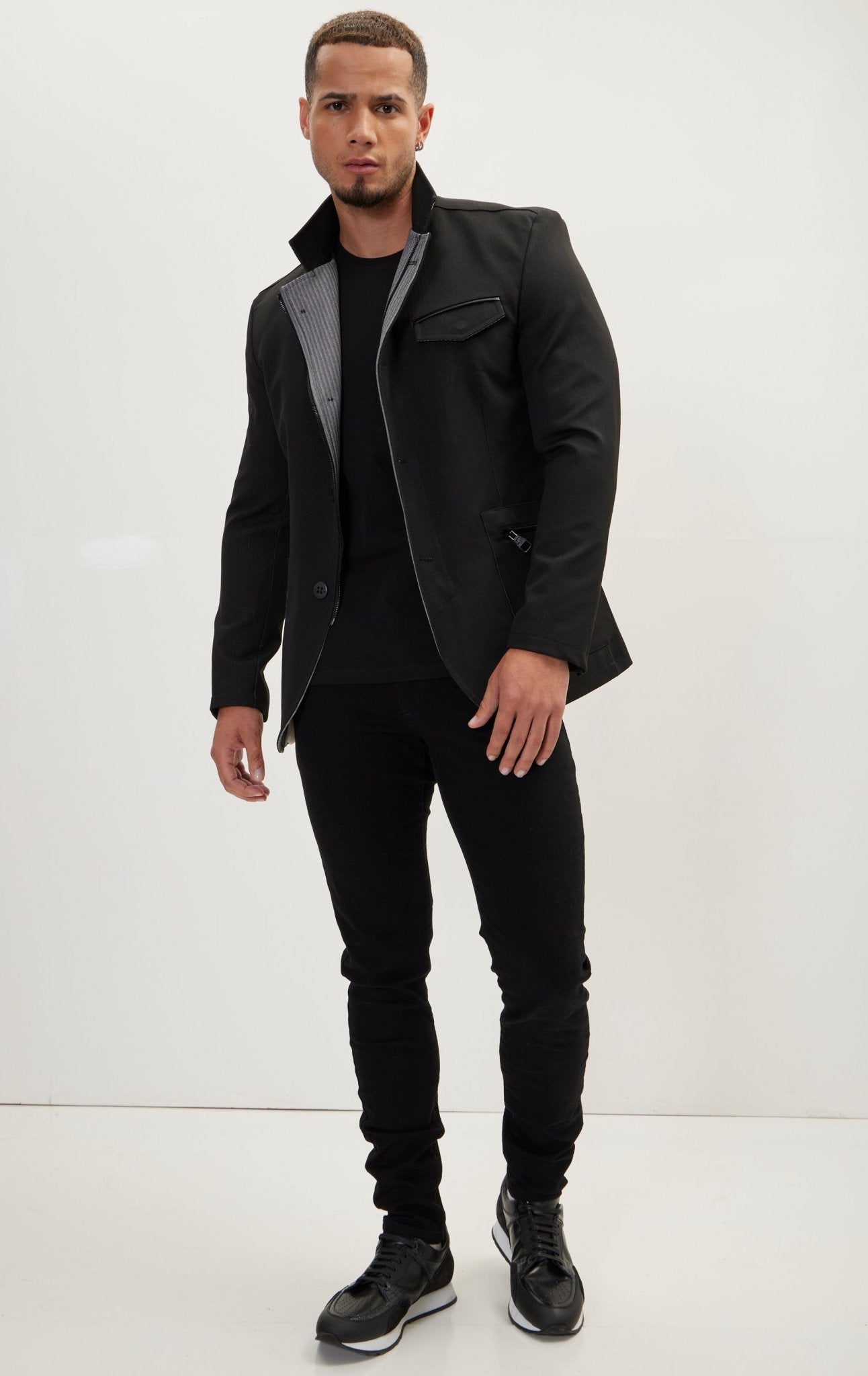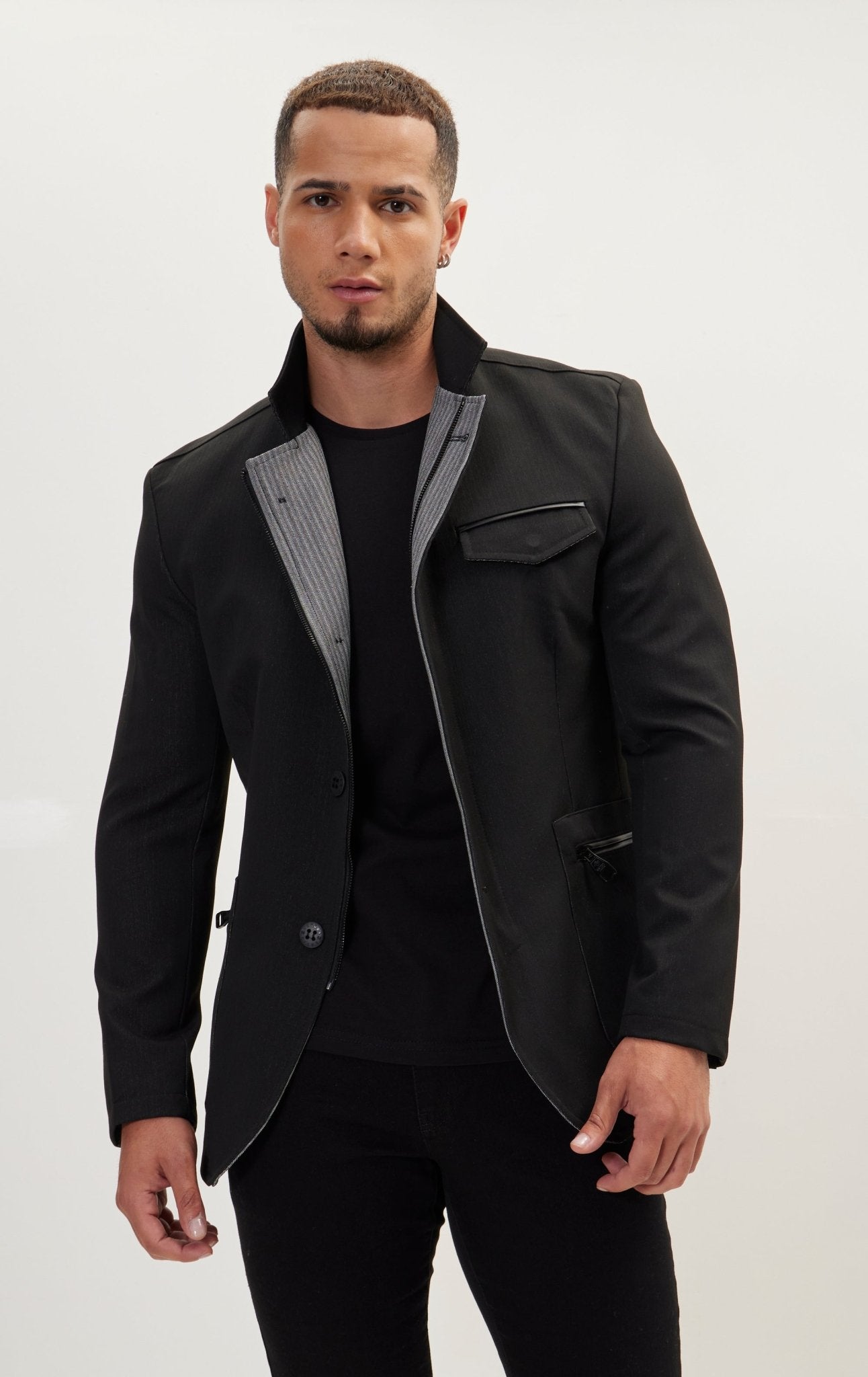 Veste à col montant et revers avec fermeture à glissière et bouton. Une patte intérieure contrastée, une poche poitrine et deux poches latérales zippées.