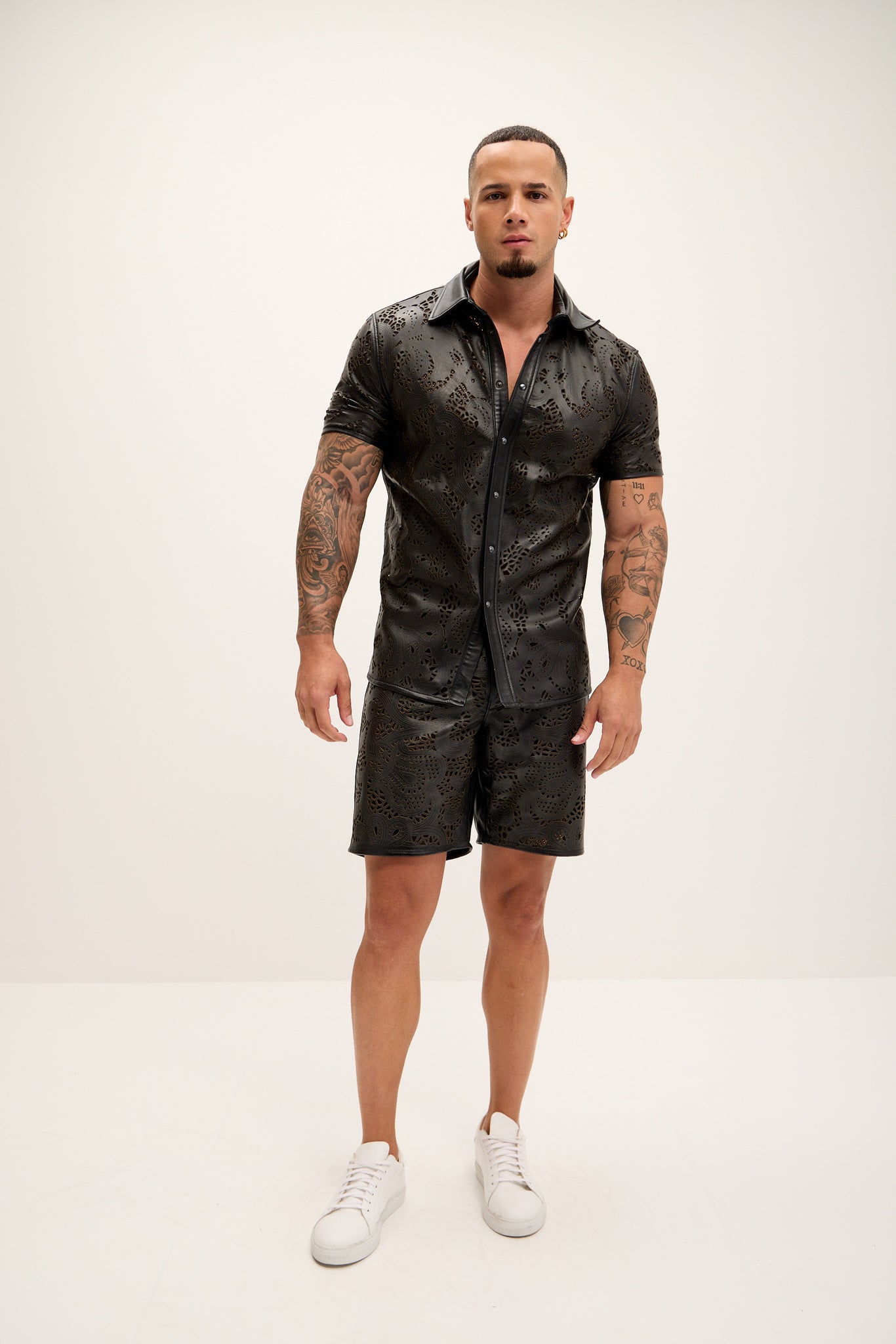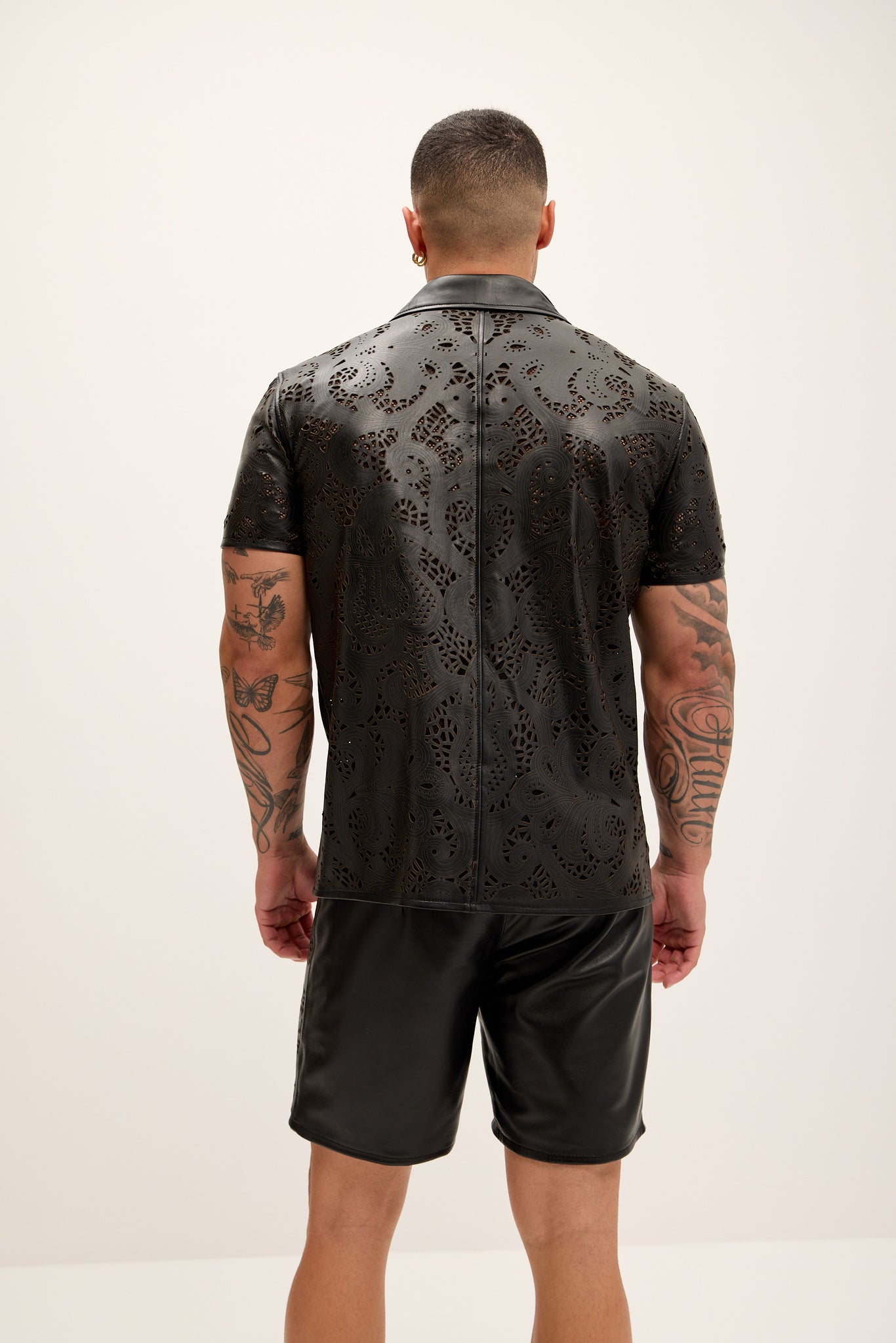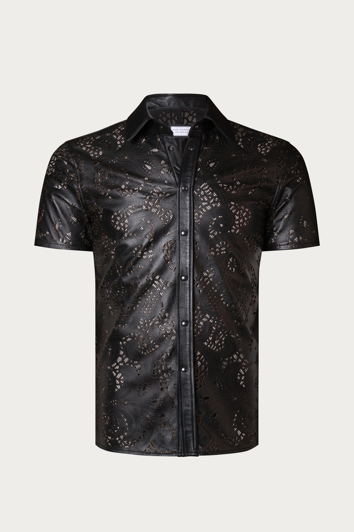 Chemise en cuir véritable à découpes intégrales. Entièrement transparente et non doublée. Coupe ajustée. Surpiqûres apparentes sur le col italien pointu et la patte de boutonnage. Fermeture à boutons-pression.