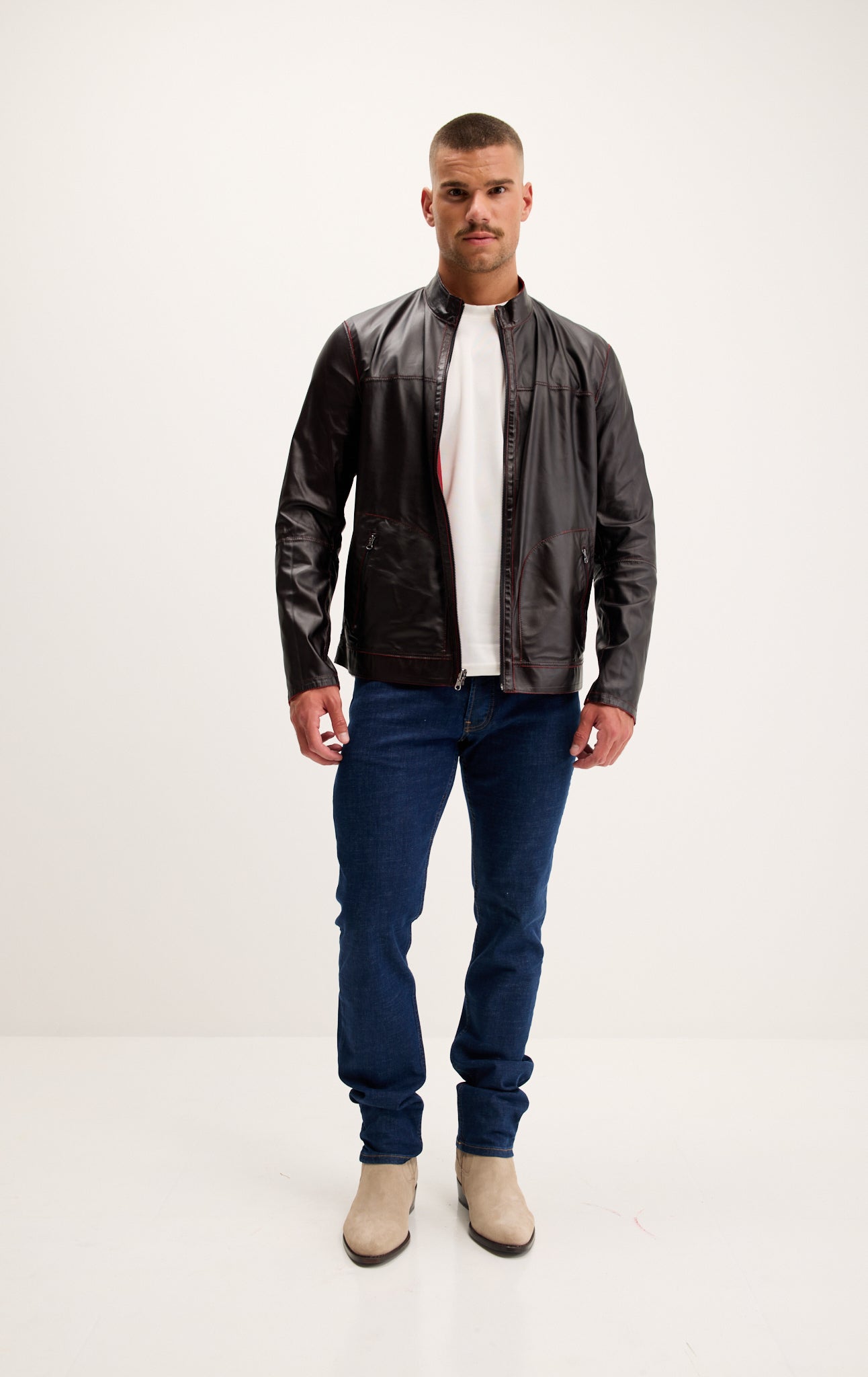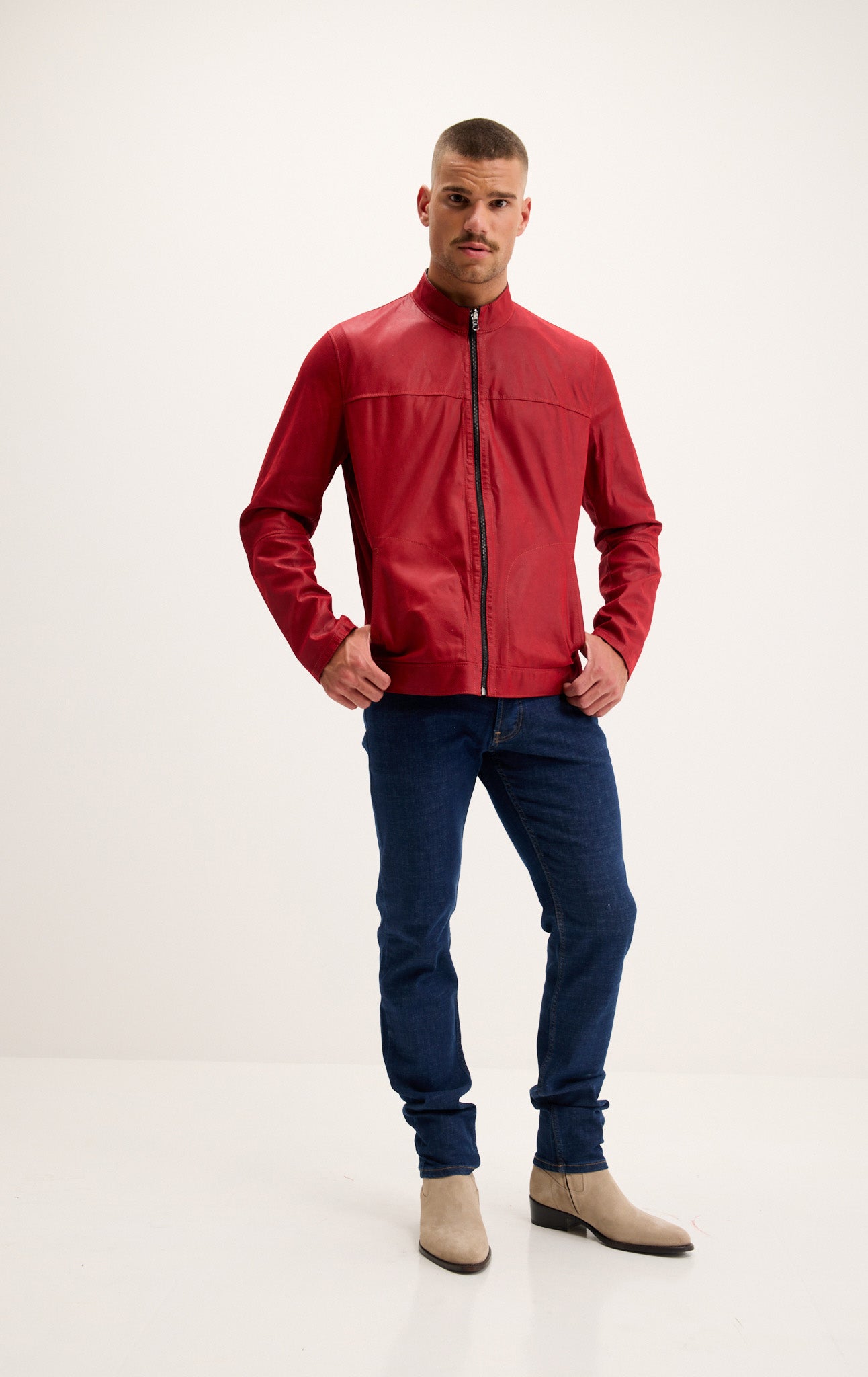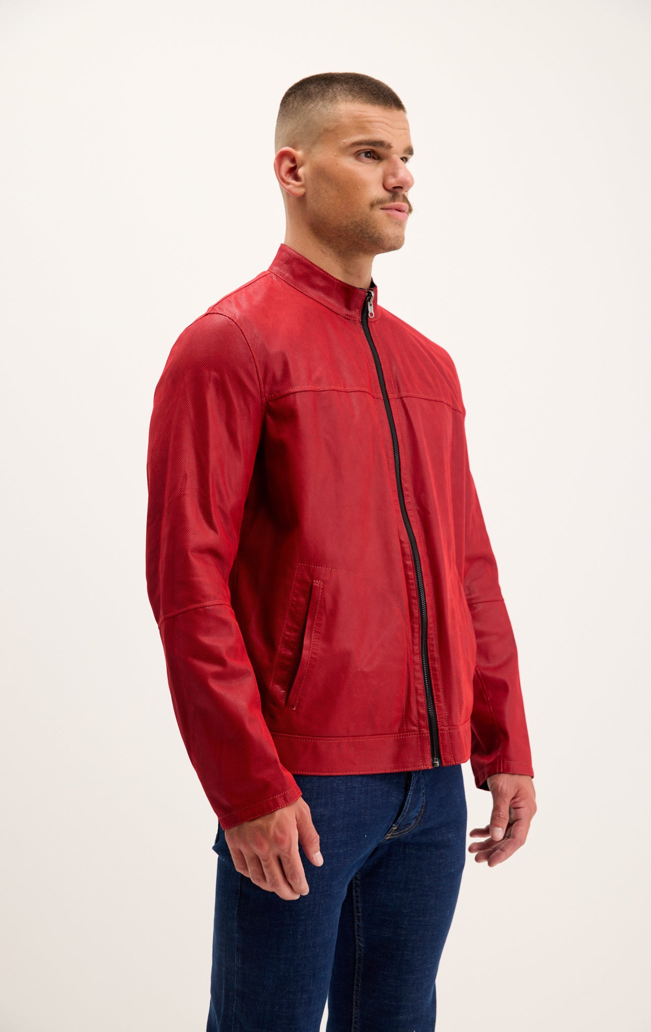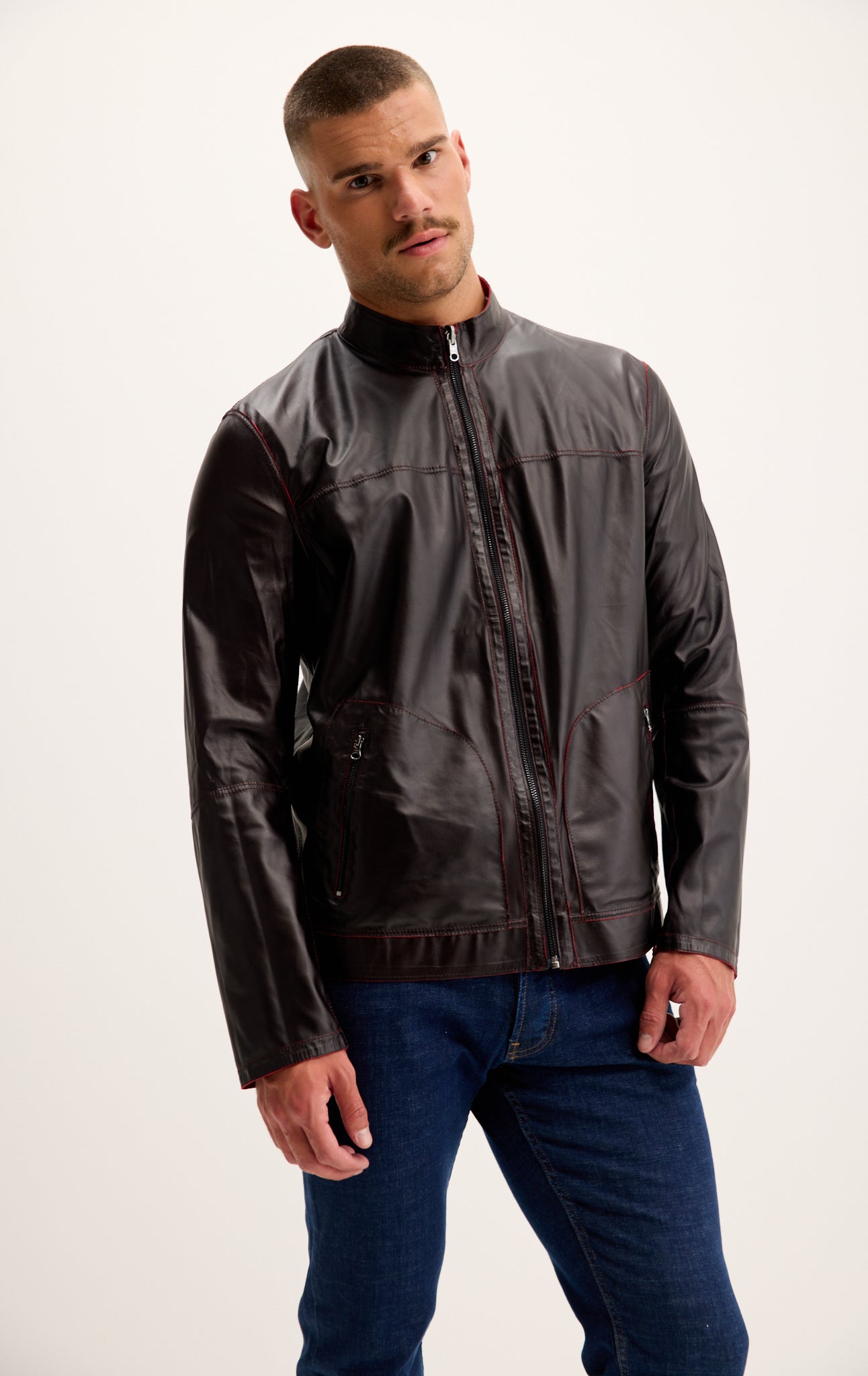 Cut close for a tapered, streamlined fit, this jacket provides a lightweight supple feel for year-round wear. With a zipper closure that runs the length of the jacket, this edgy design pairs well with just about any outfit for an added statement.
