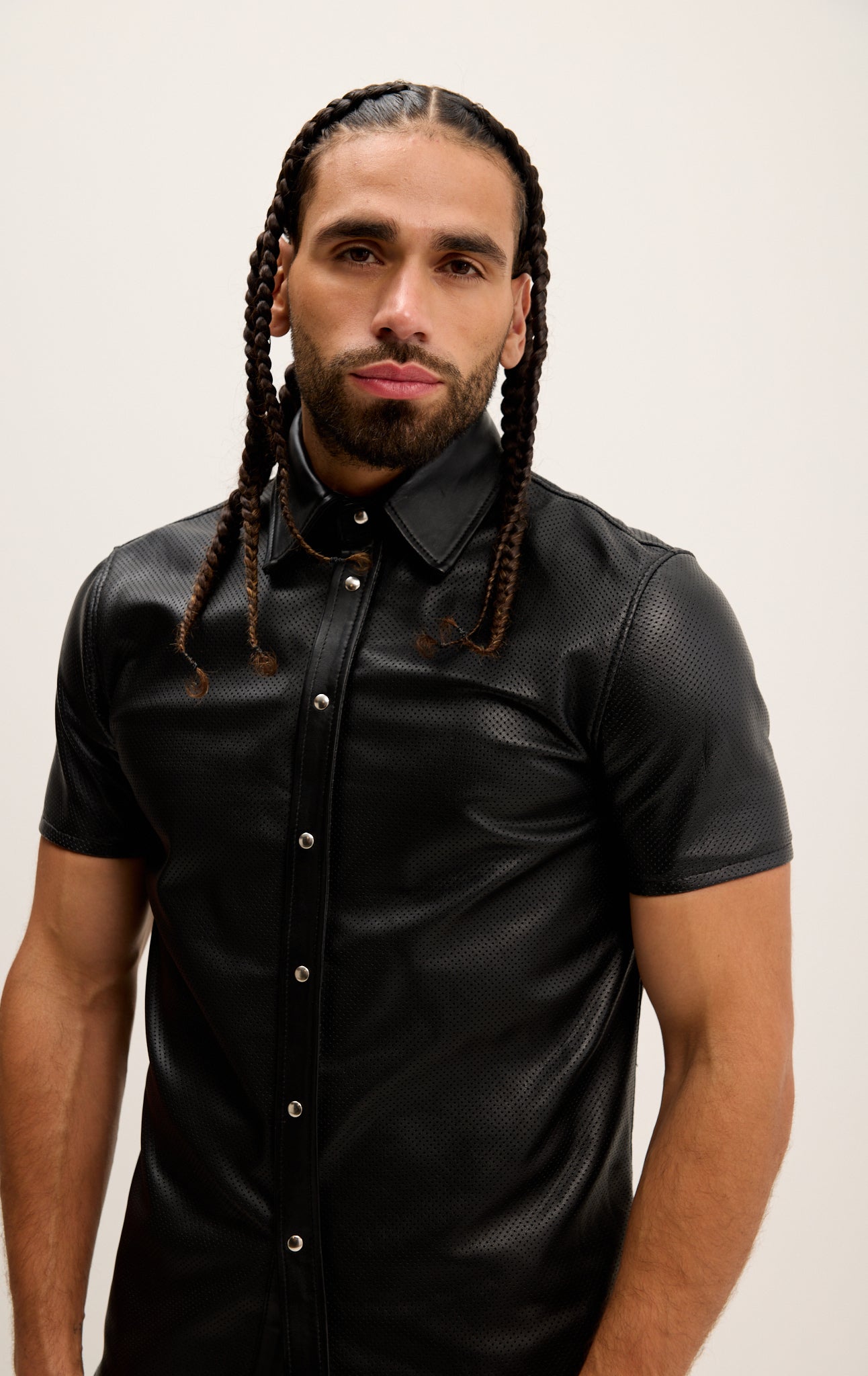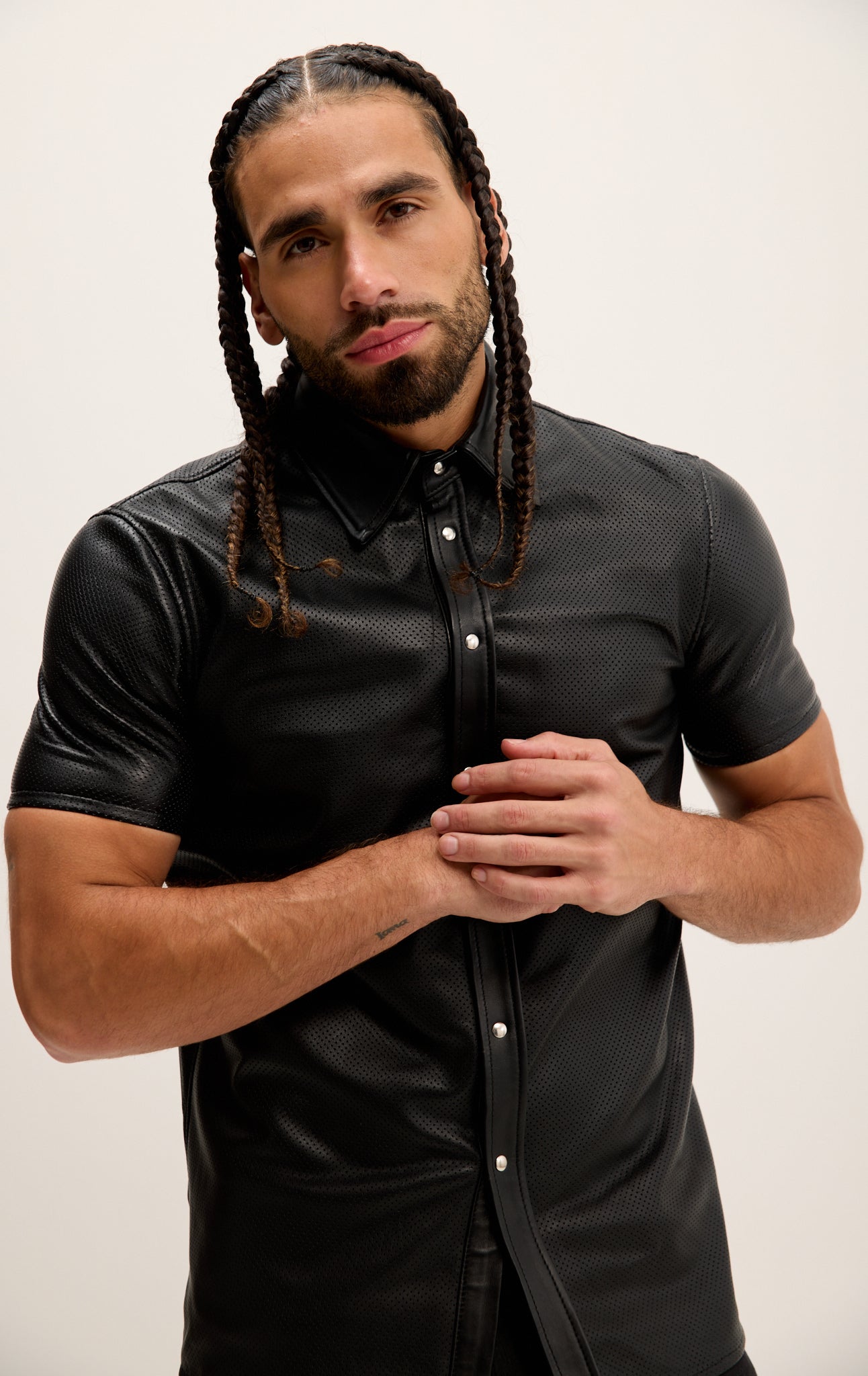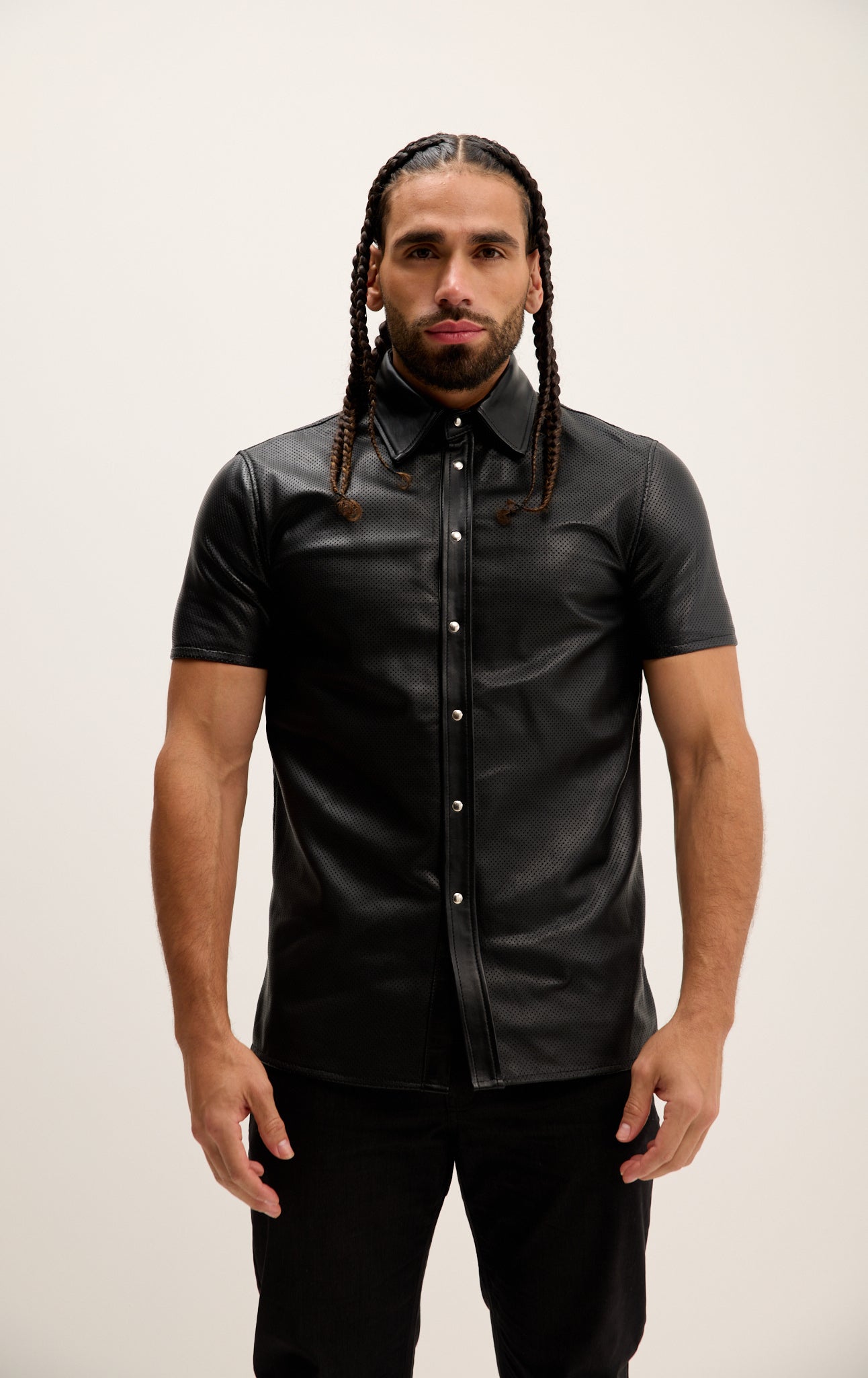 Genuine leather shirt with allover perforated design. Unlined. Fitted construction. Allover stitching throughout the pointy Italian collar and the placket. Snap button closure.