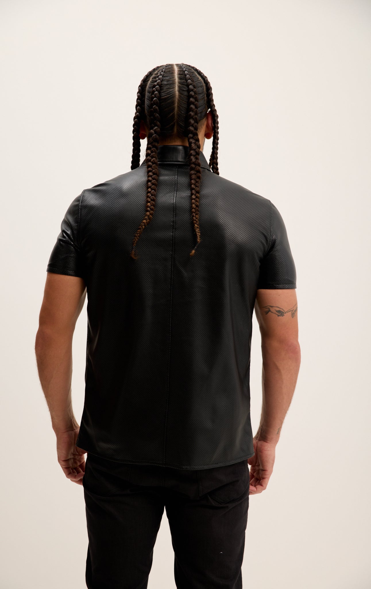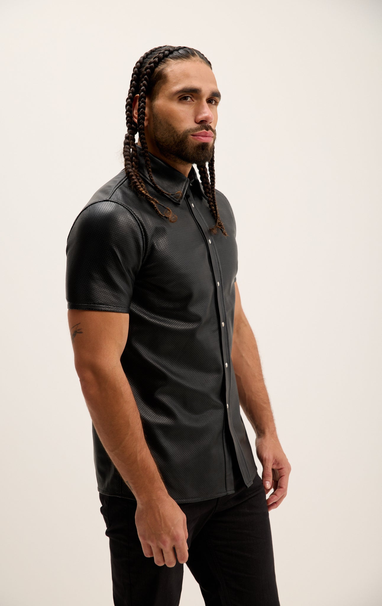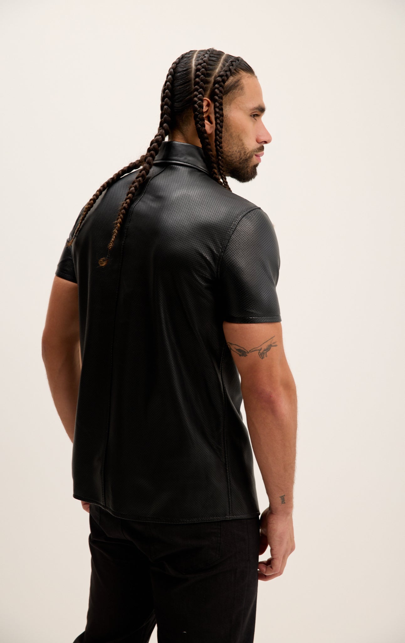 Genuine leather shirt with allover perforated design. Unlined. Fitted construction. Allover stitching throughout the pointy Italian collar and the placket. Snap button closure.