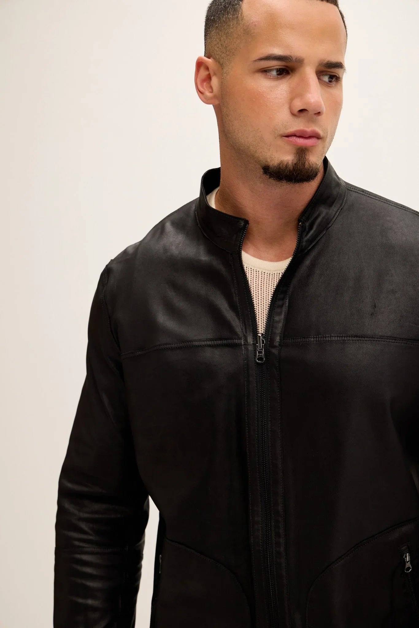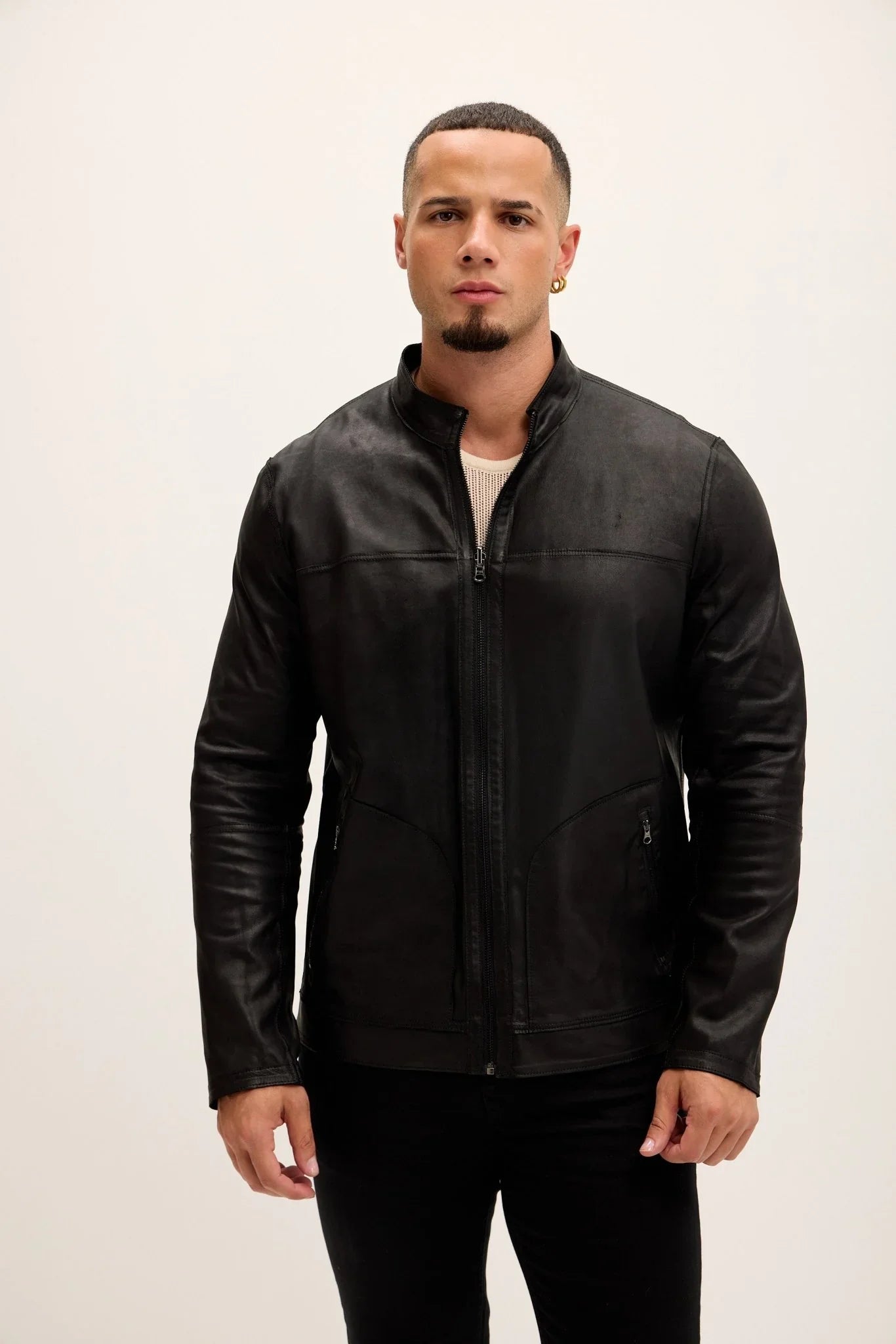 Cut close for a tapered, streamlined fit, this jacket provides a lightweight supple feel for year-round wear. With a zipper closure that runs the length of the jacket, this edgy design pairs well with just about any outfit for an added statement.