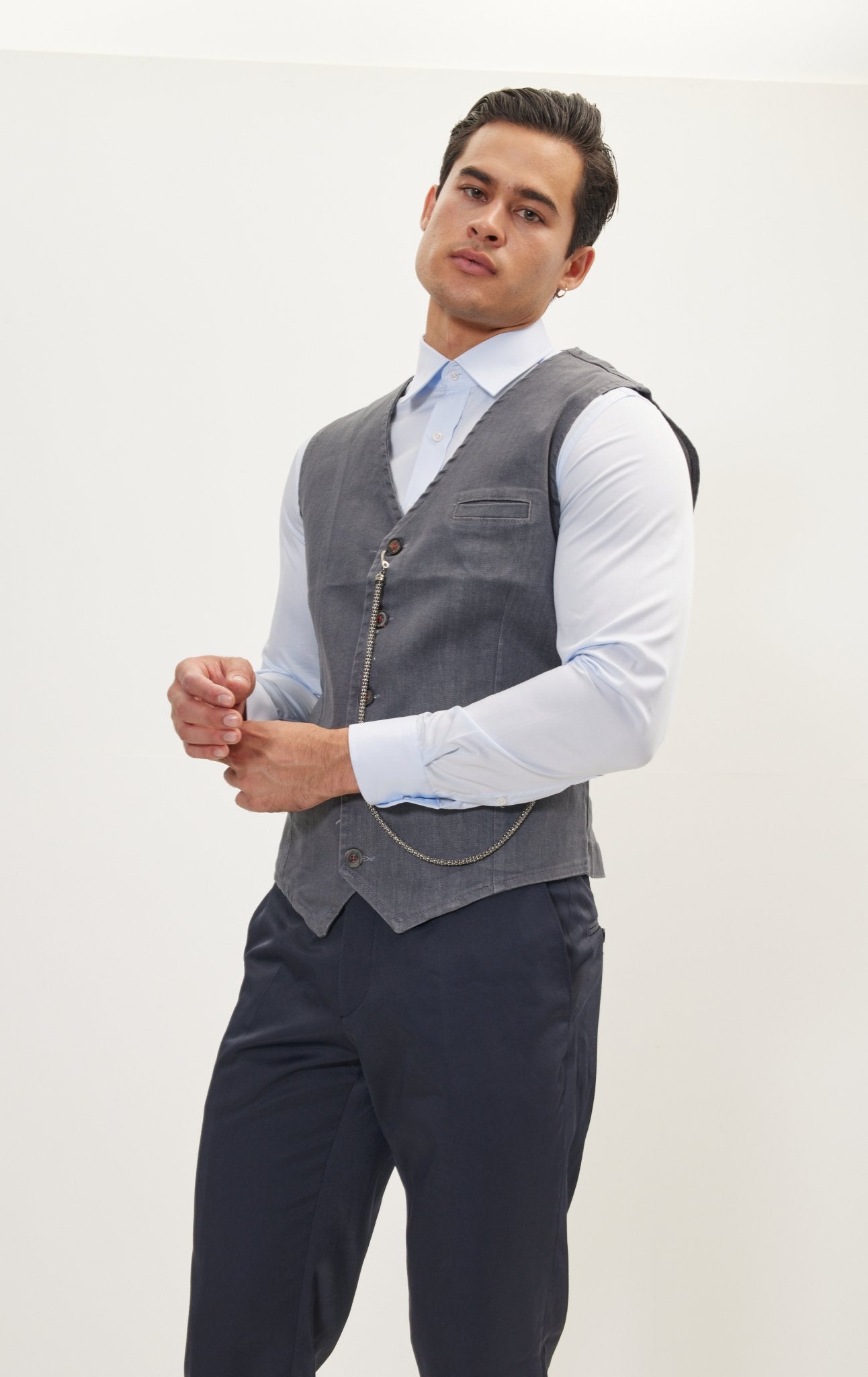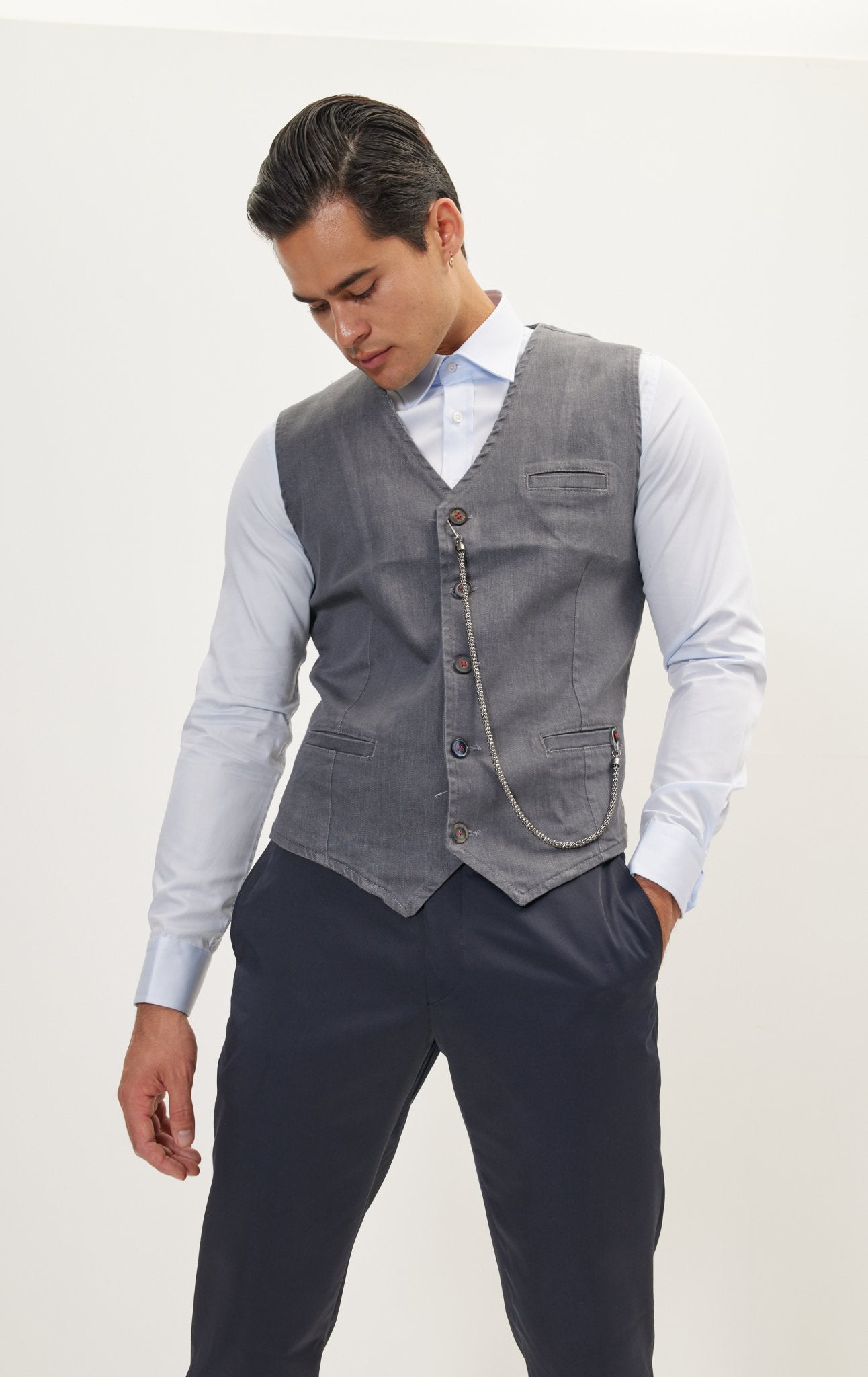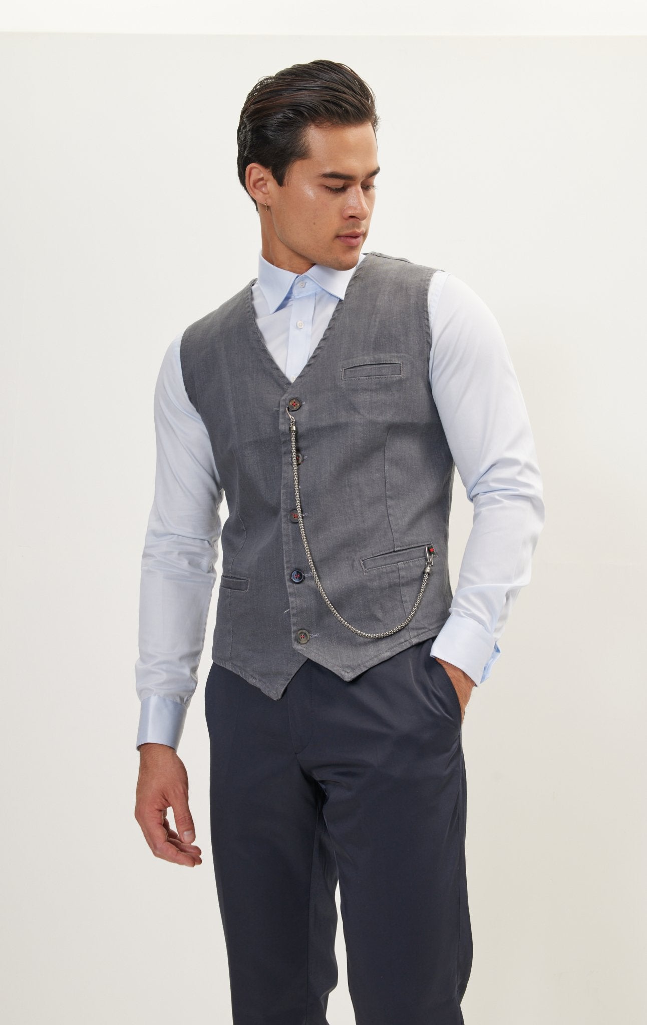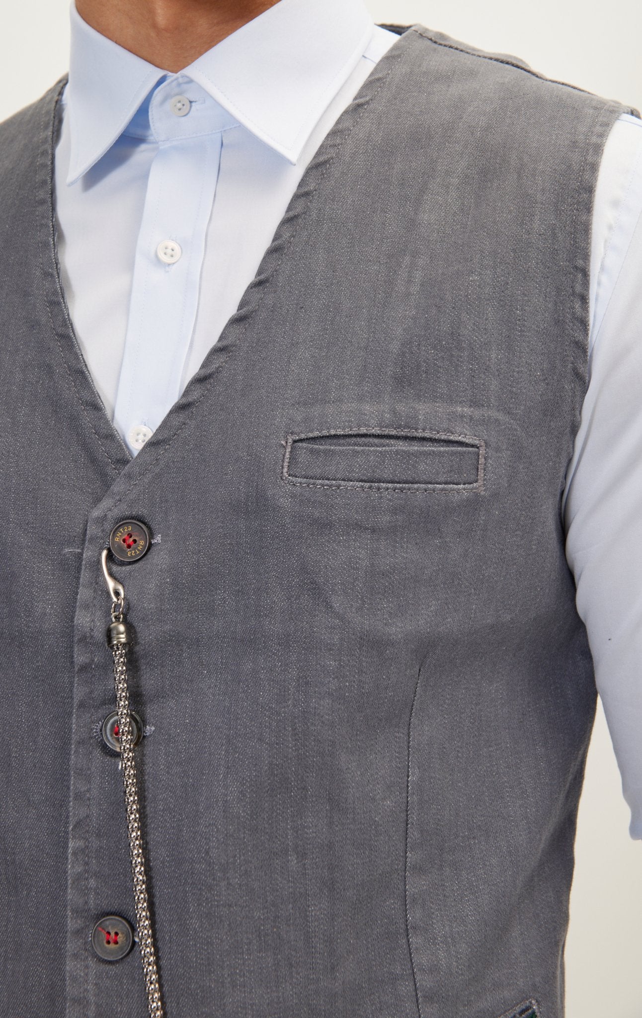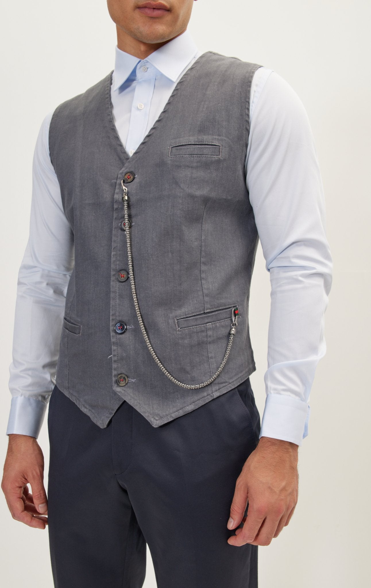 Questo denso gilet di cotone è un classico aggiornamento per qualsiasi outfit. Fa una dichiarazione a sé stante, dettagliata con bottoni a contrasto e una catena splendidamente drappeggiata.