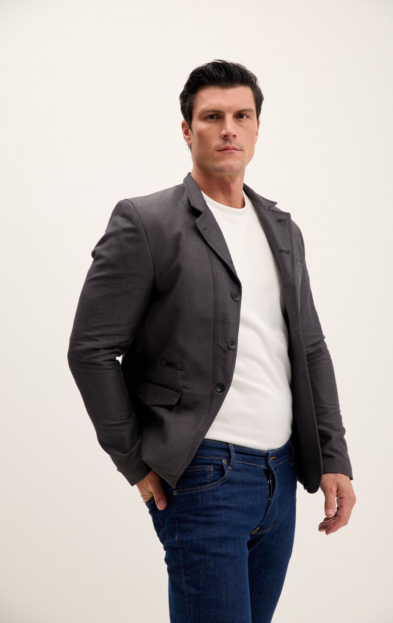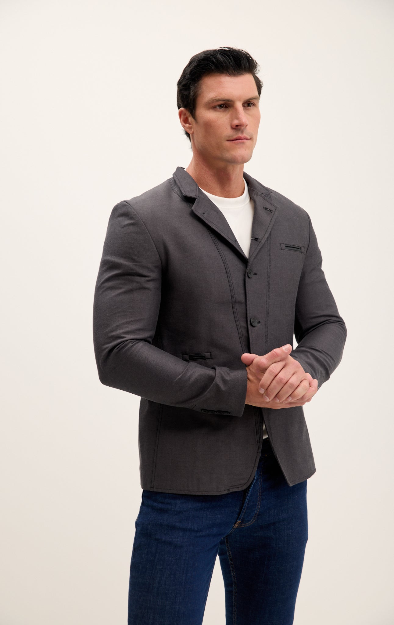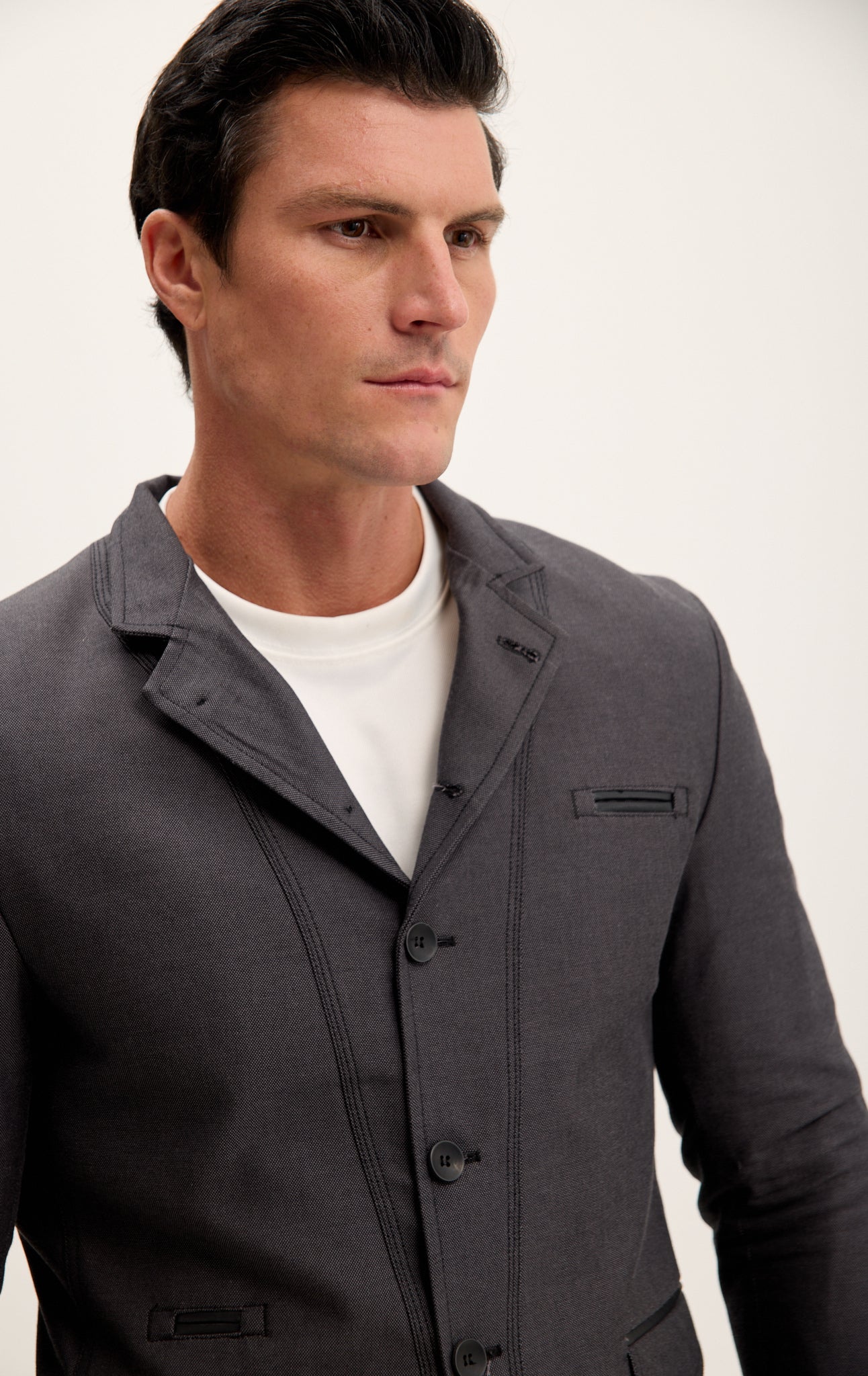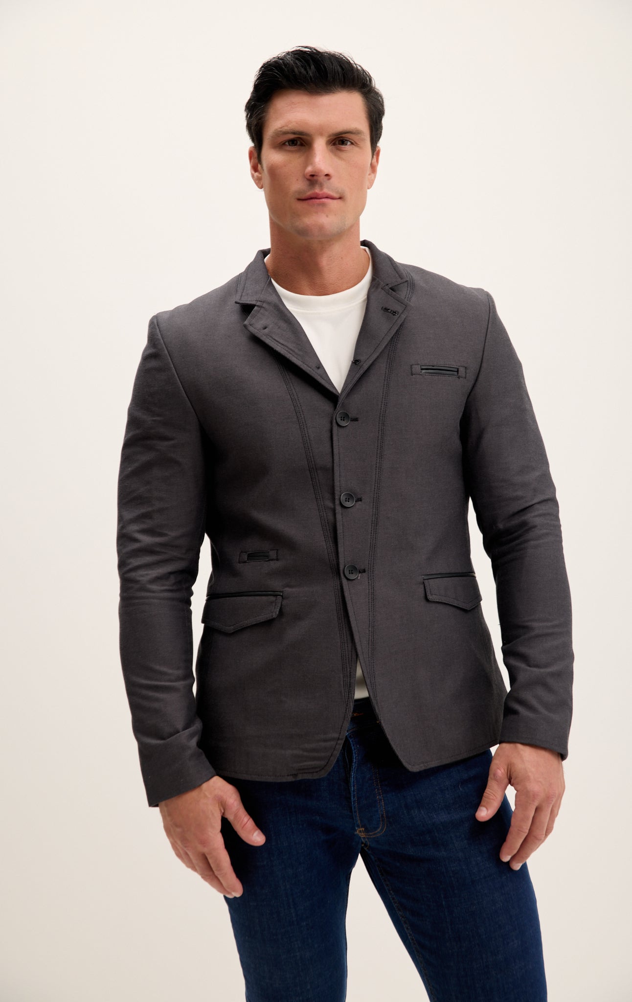 True RT classic, this jacket reflects the soul of the brand. An upturned collar, leather trim details on Pockets, flap side pockets, and slit chest pocket give it the rock n roll look. Made from cotton-blend fabric that sits on the body like a glove. Also features symmetric 5 button closure, inner wallet pocket, and four cuff buttons. Fully lined.