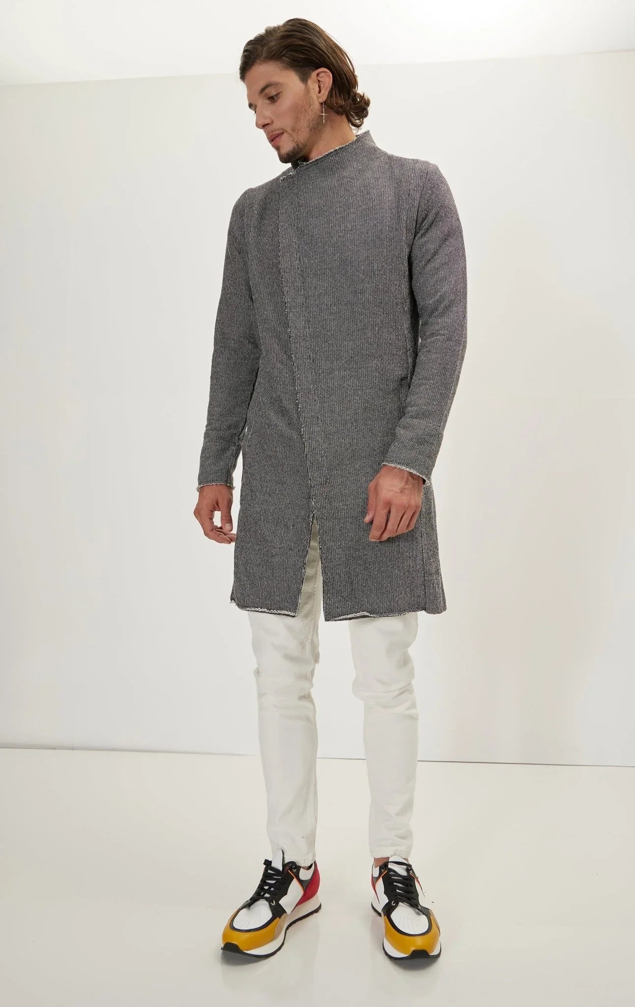 Expertly knitted, this cardigan features an eye-catching asymmetric zipper closure, adding a contemporary twist to a classic design. Its sleek silhouette is designed to hit just above the knee, providing both comfort and versatility for any occasion.