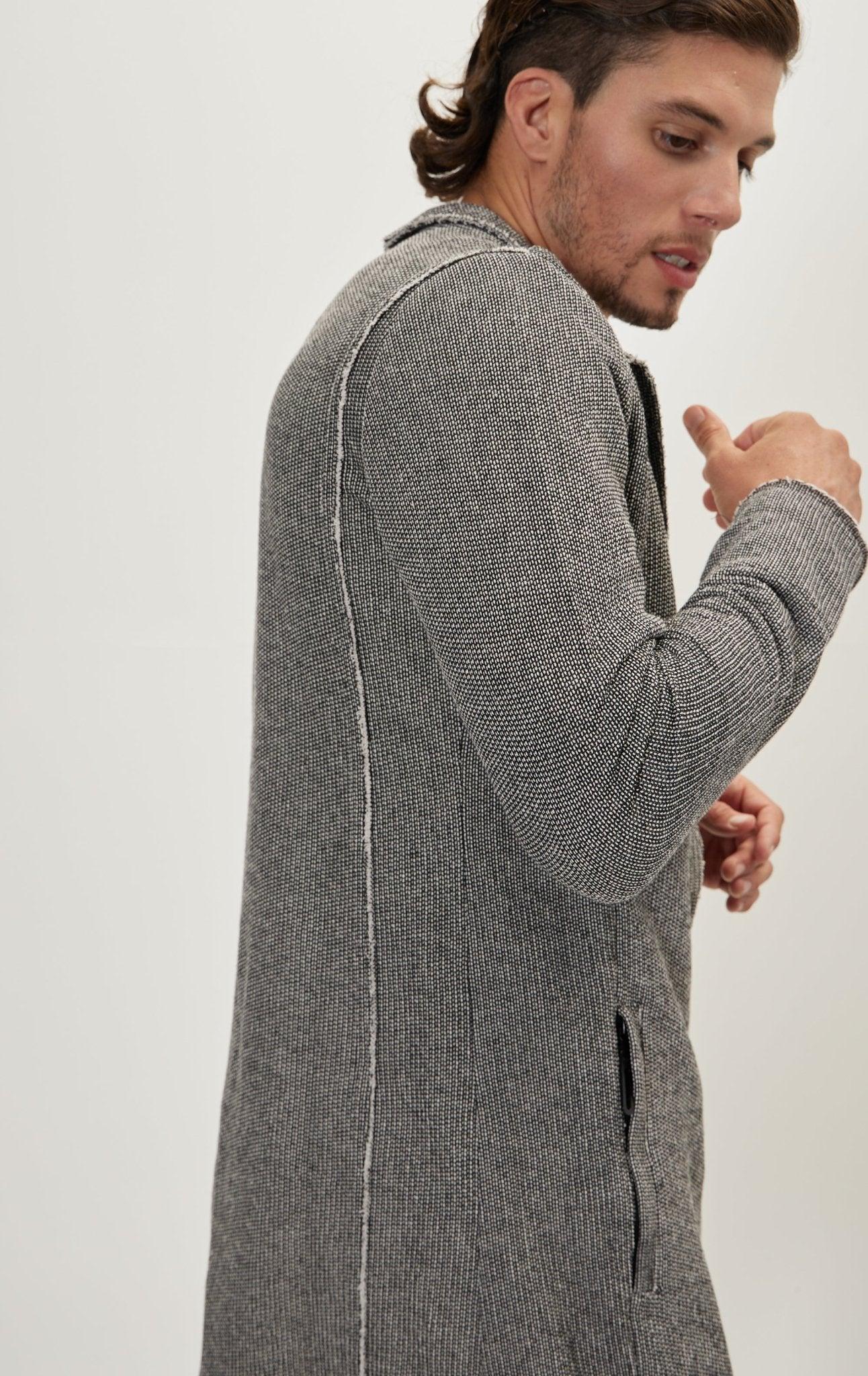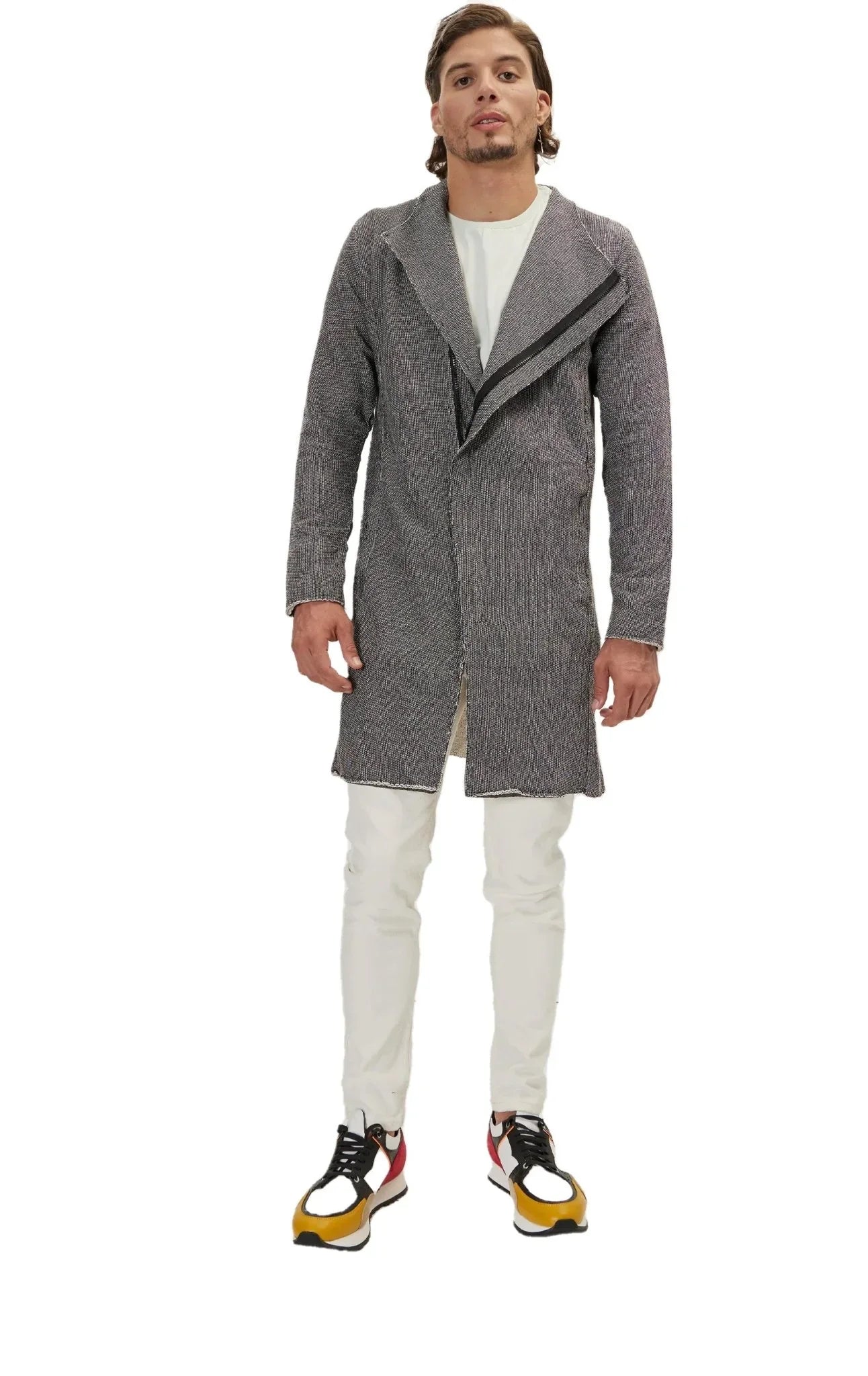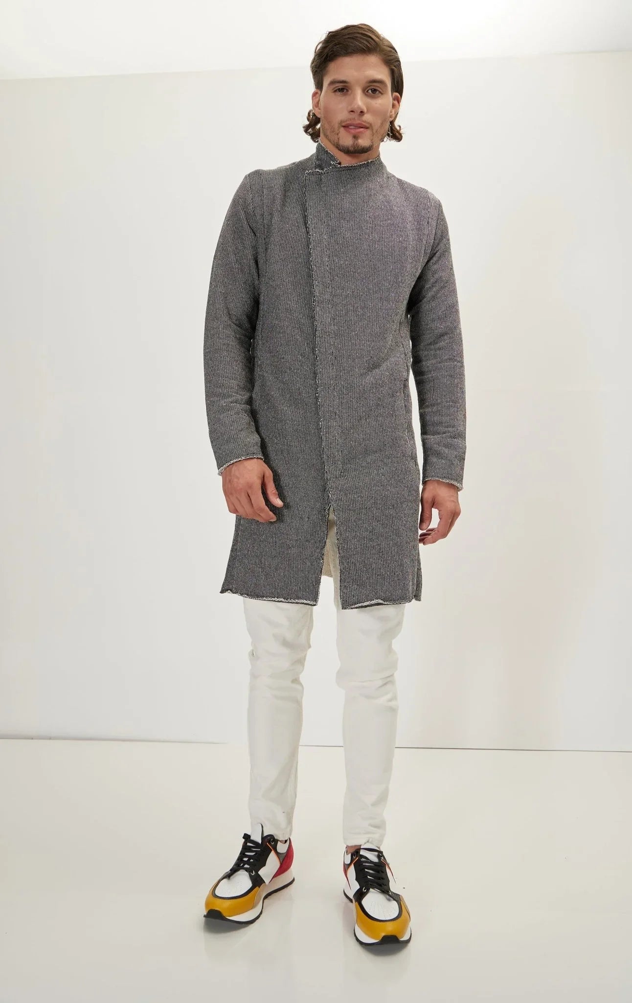 Introducing the Ron Tomson Rebel Long Cardigan, a stylish and sustainable addition to your wardrobe. Crafted from a blend of recycled cotton and polyester, this long-line asymmetric cardigan embodies both fashion and eco-consciousness.
