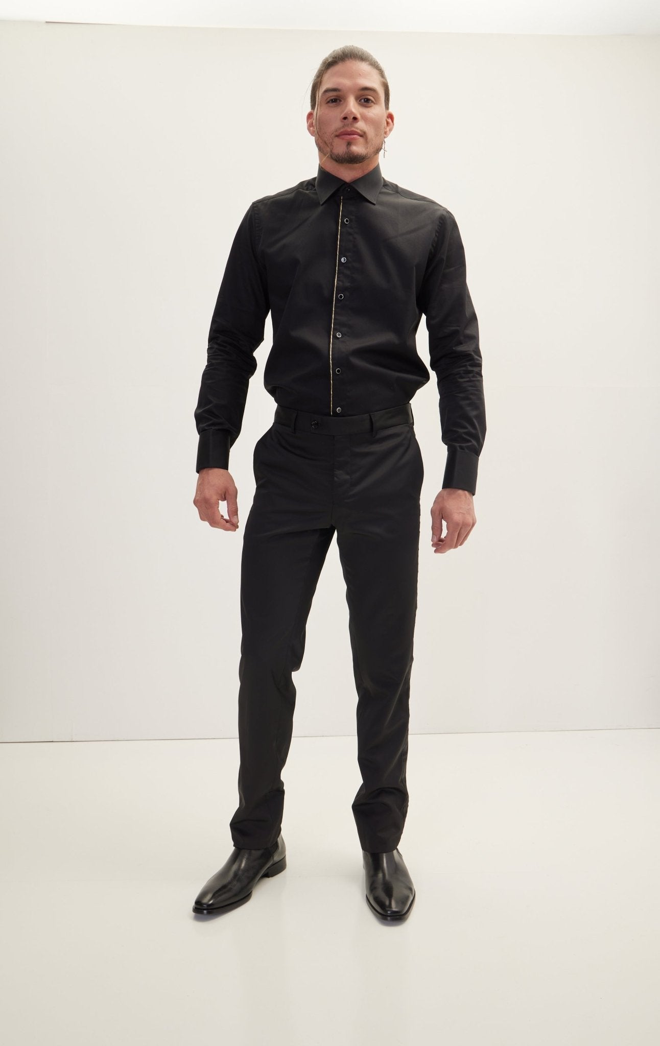 The timeless allure of tuxedo stripes graces the sides, adding a touch of distinguished charm to the ensemble. Designed with a tapered silhouette, these pants offer a sleek and tailored fit that effortlessly flatters the figure, making them a versatile choice for both formal affairs and upscale casual occasions.