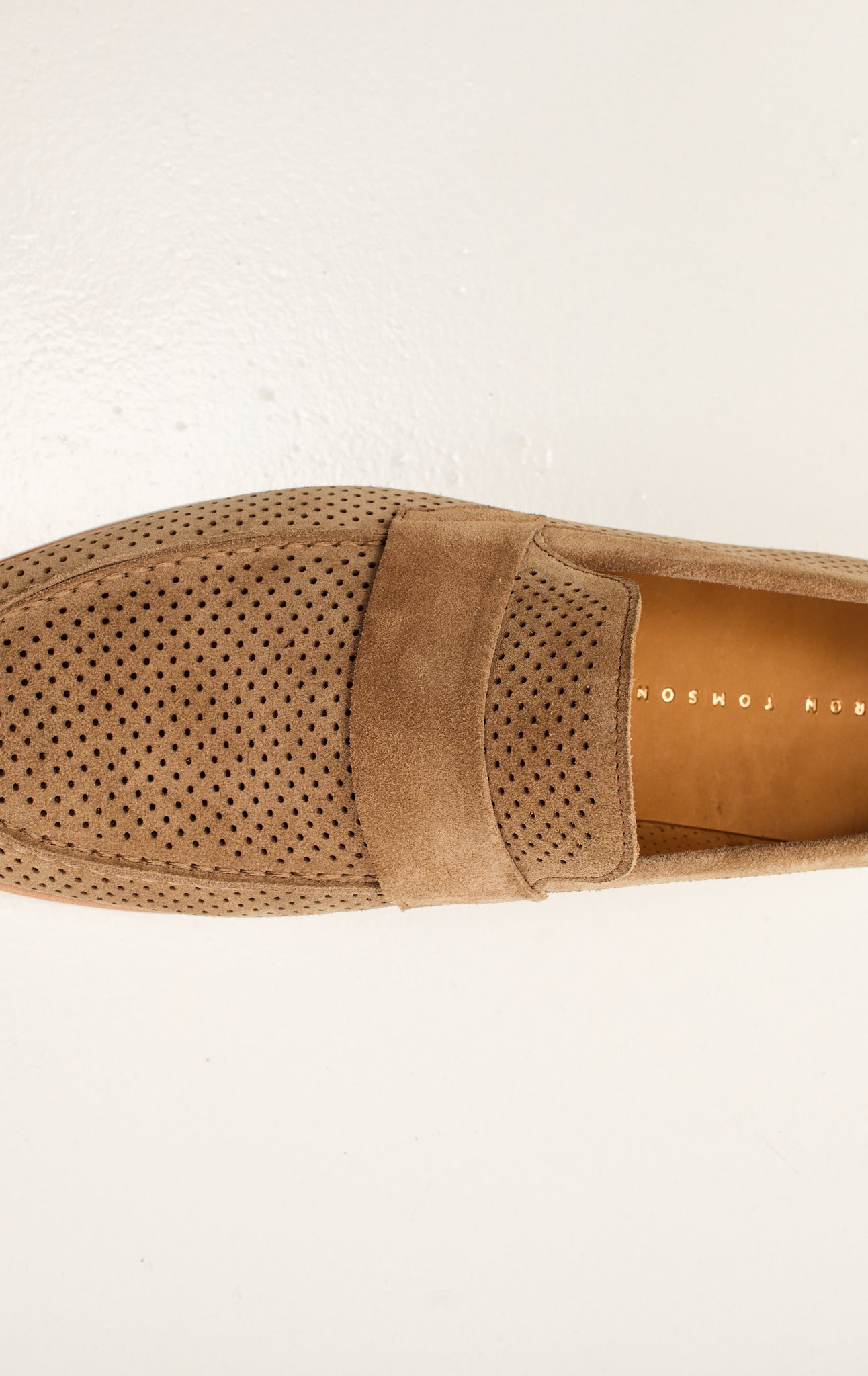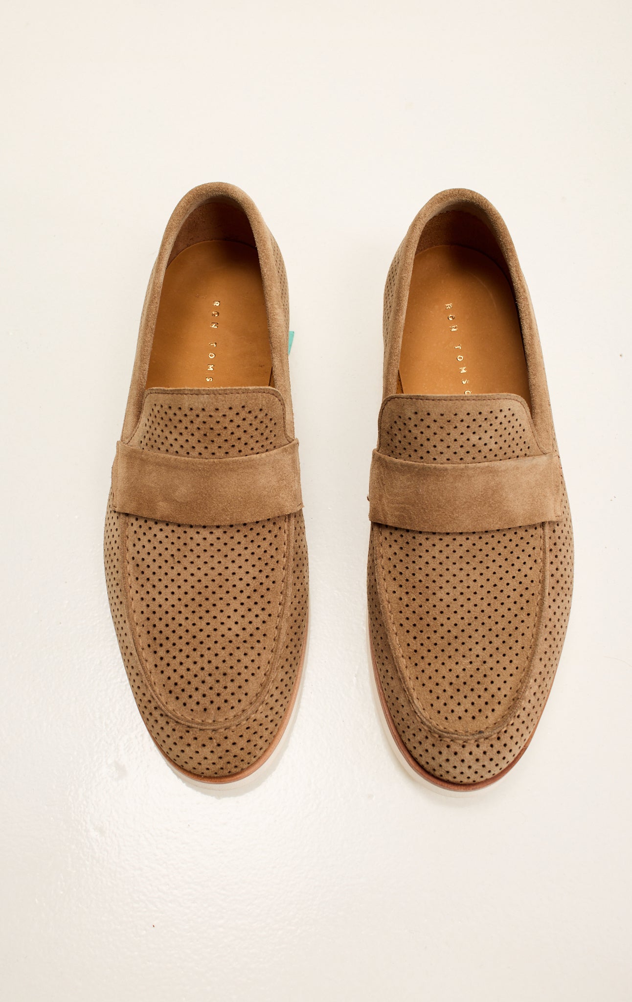 Step into breathable style with these tan perforated nubuck leather shoes, designed for comfort and versatility. Featuring Italian rubber soles for outstanding grip and durability, these shoes combine a lightweight, airy design with rugged sophistication. Perfect for warm weather or casual outings, they offer a unique blend of elegance and practicality.