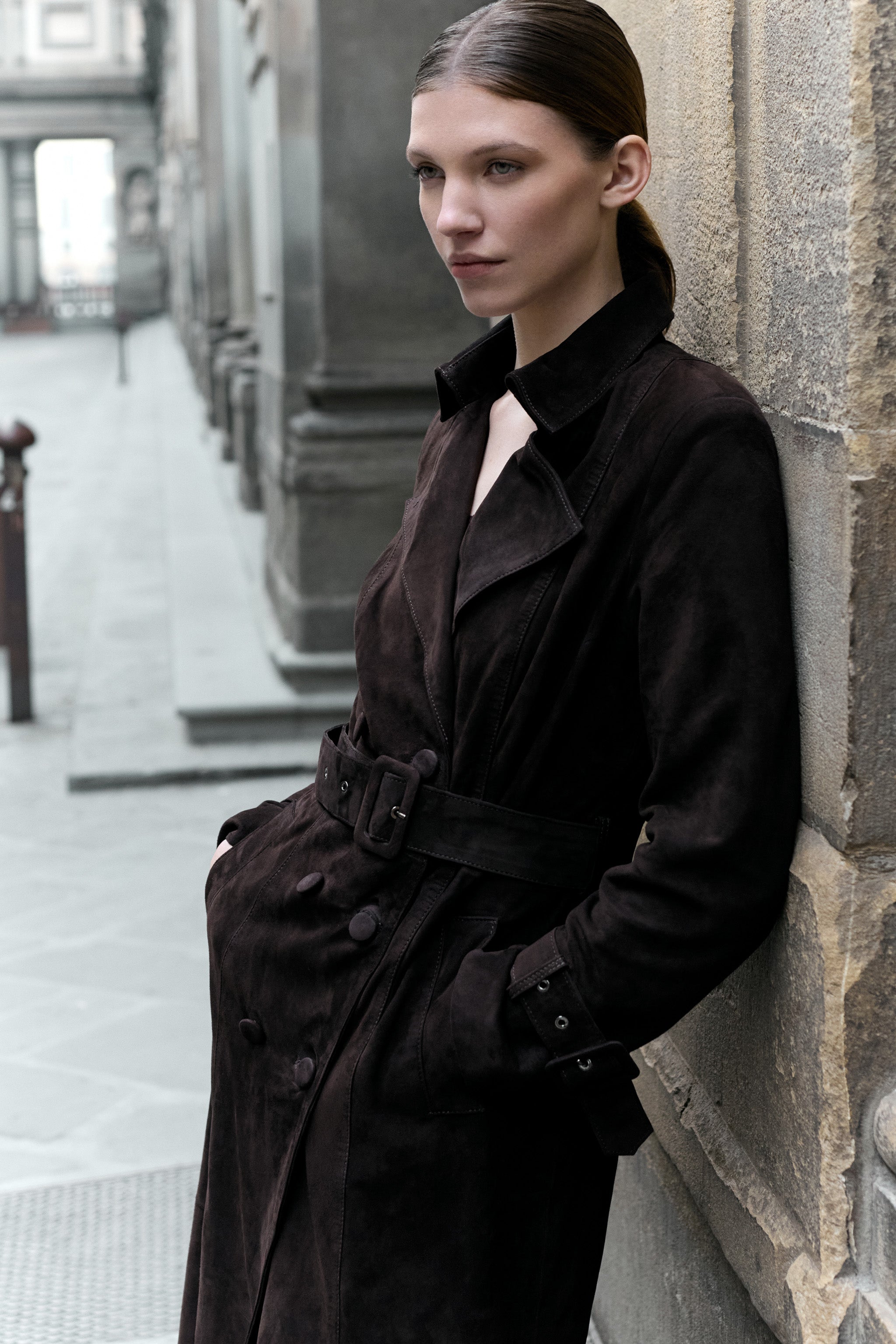 What sets it apart is its double-breasted design, offering structured elegance with wide lapels and a belted waist for customizable cinching, while the deep dark brown hue evokes the warm earth tones of Tuscany's countryside. Inspired by Ron Tomson's exclusive 20th Anniversary Collection, "Firenze," it captures the historic charm of Florence with a soft, velvety texture that blends durability with opulent feel.