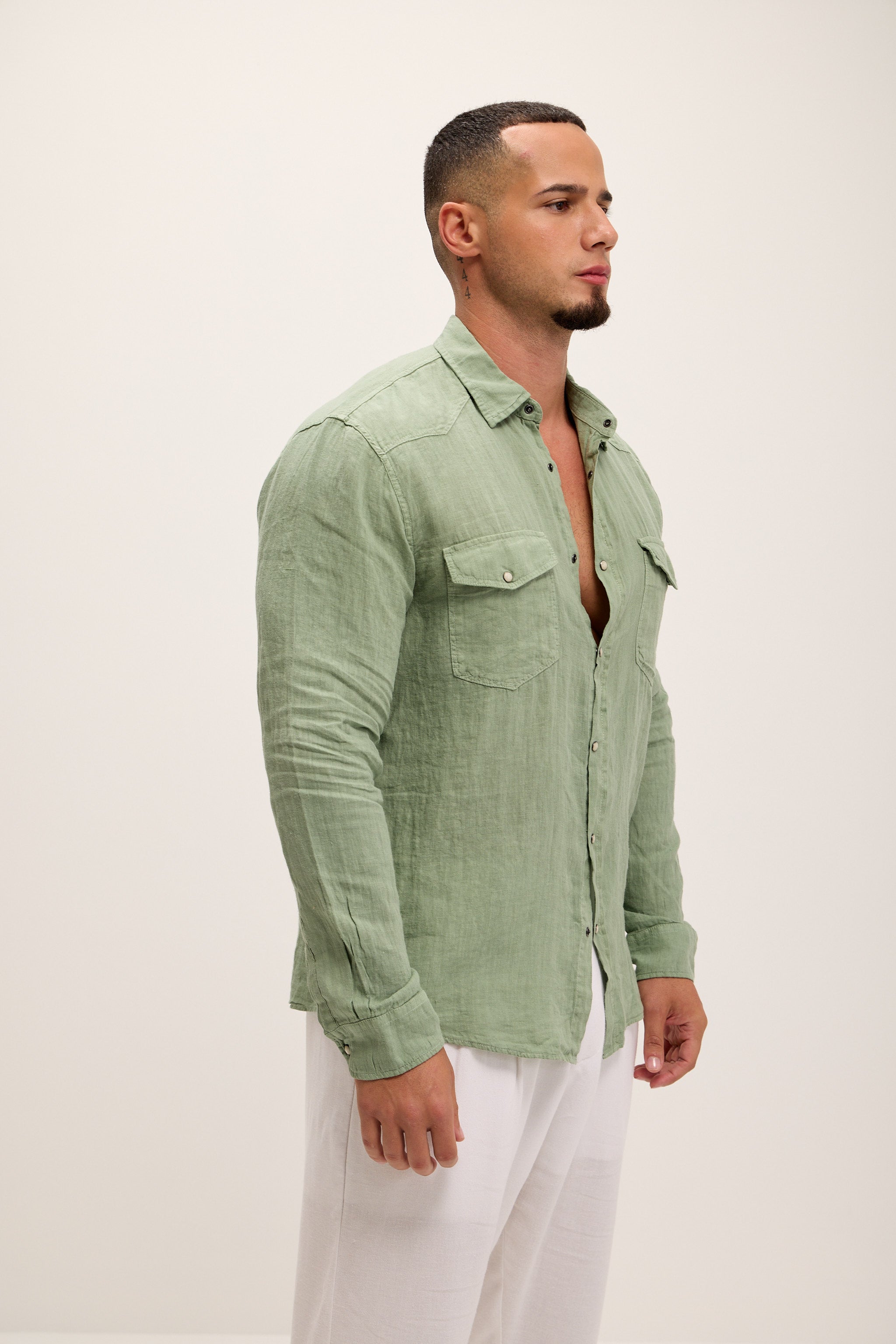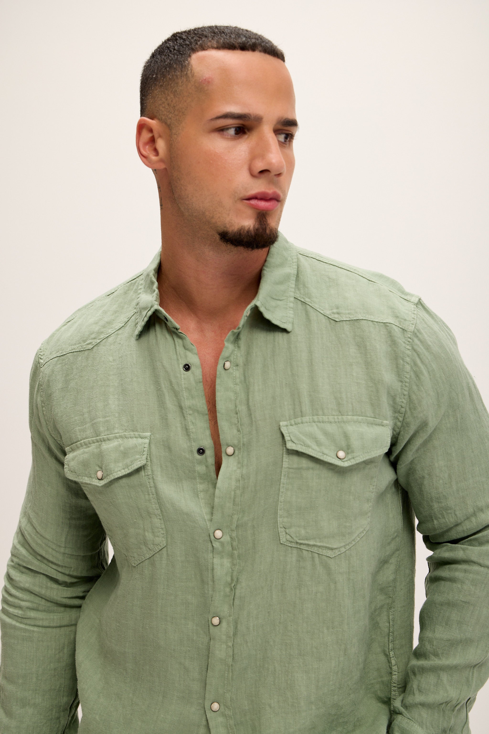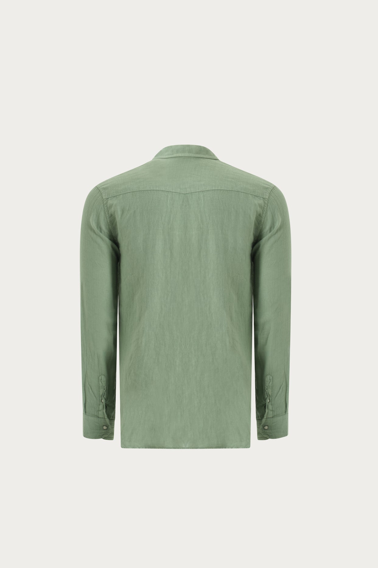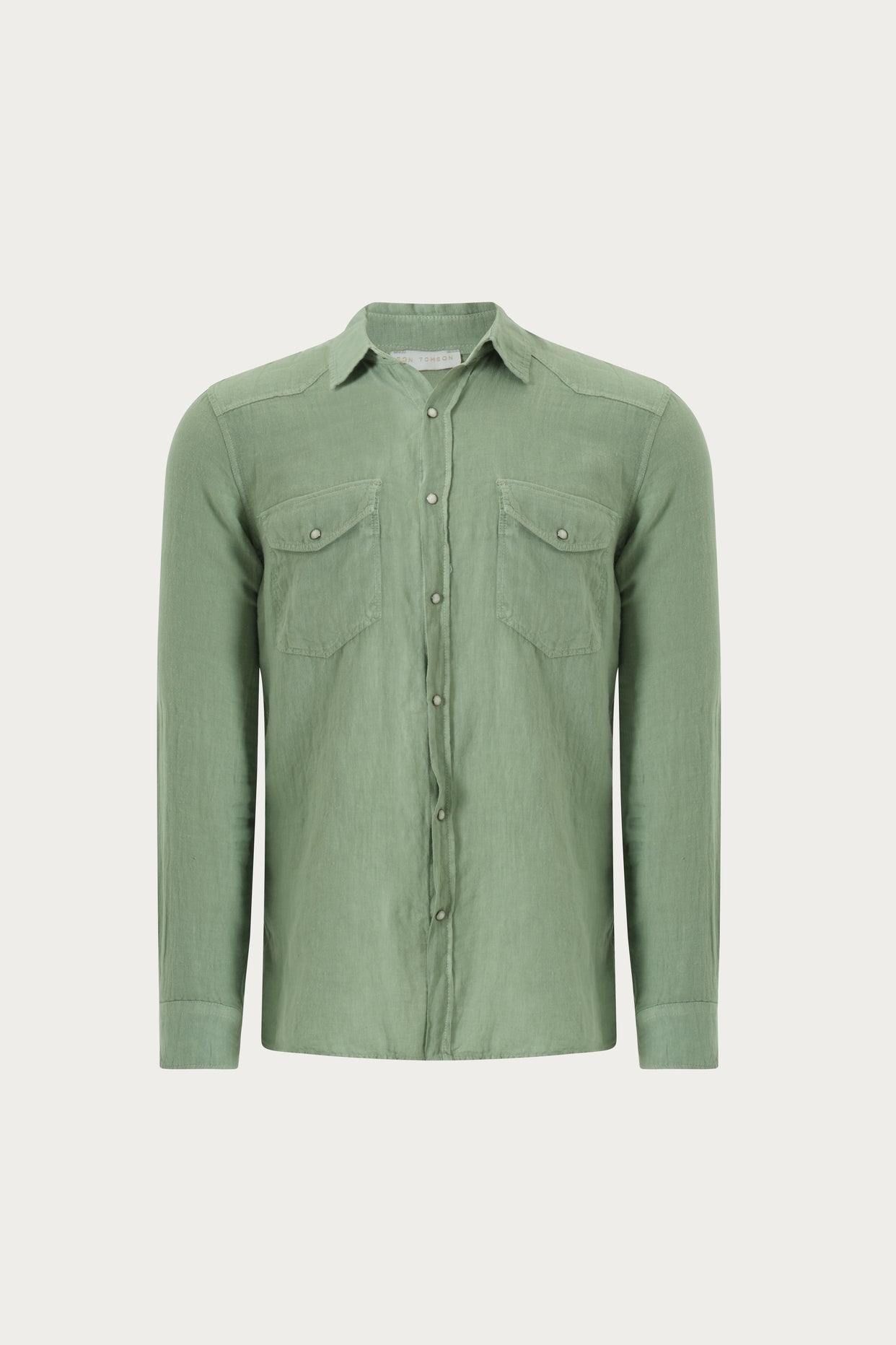 Signature Ron Tomson fitted construction. Front snap closure pockets. Full snap button closure on the placket and cuffs. Italian Collar. Western design over shoulders and back trim details.
