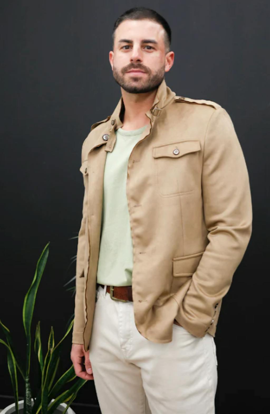 Faux suede stand-up collar with buckle detail notch lapel when folded. 3-button closure, epaulets on the shoulder, and chest and side patch flap pockets.