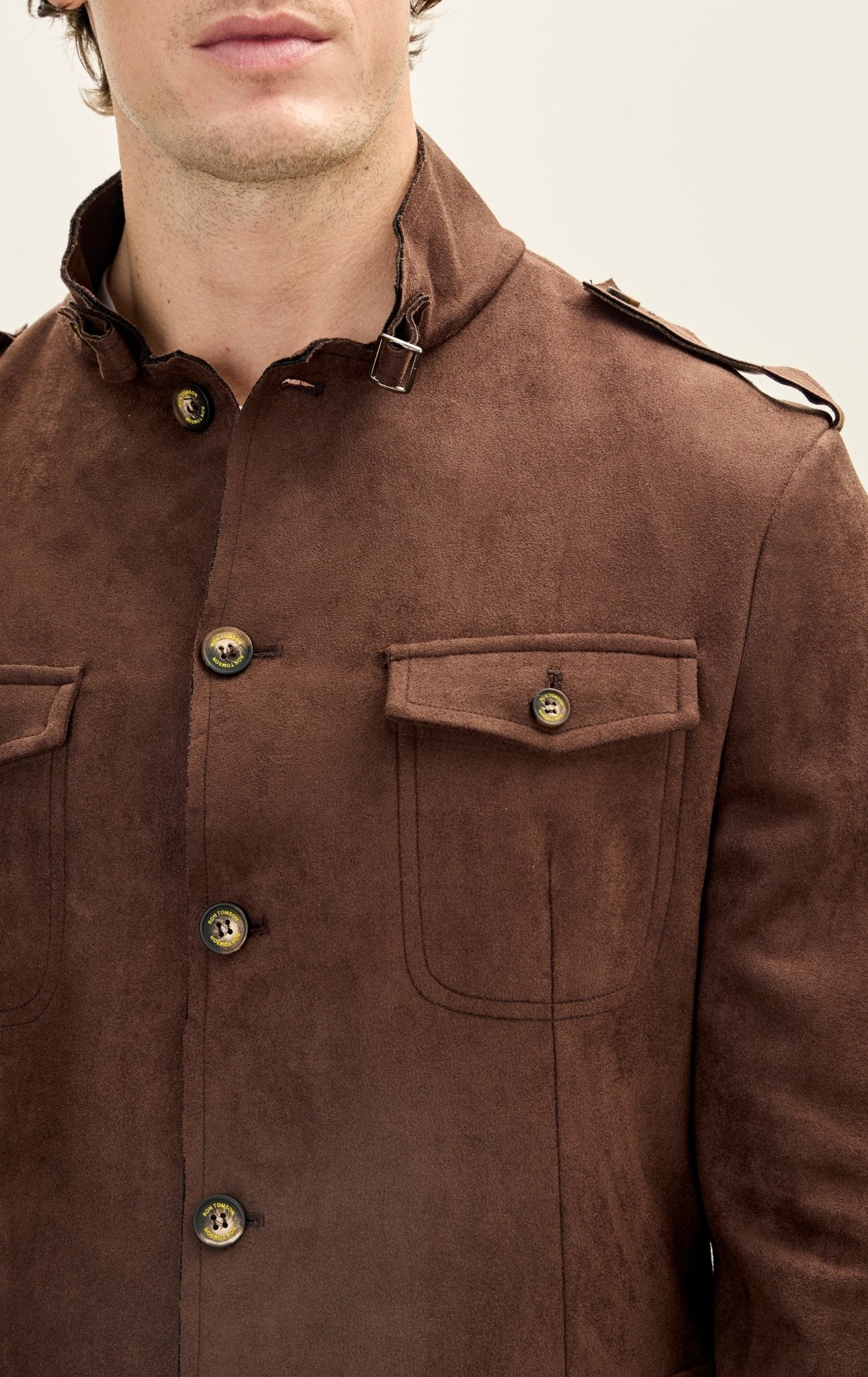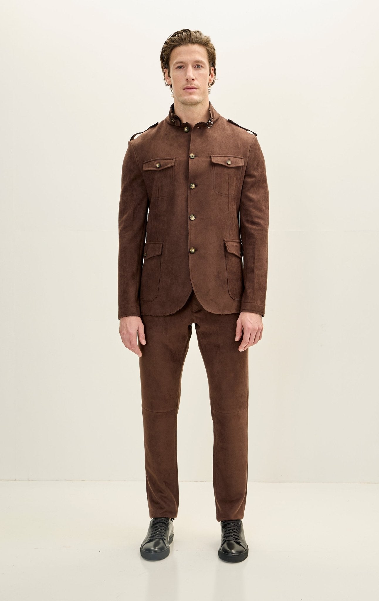 Faux suede stand-up collar with buckle detail notch lapel when folded. 3-button closure, epaulets on the shoulder, and chest and side patch flap pockets.