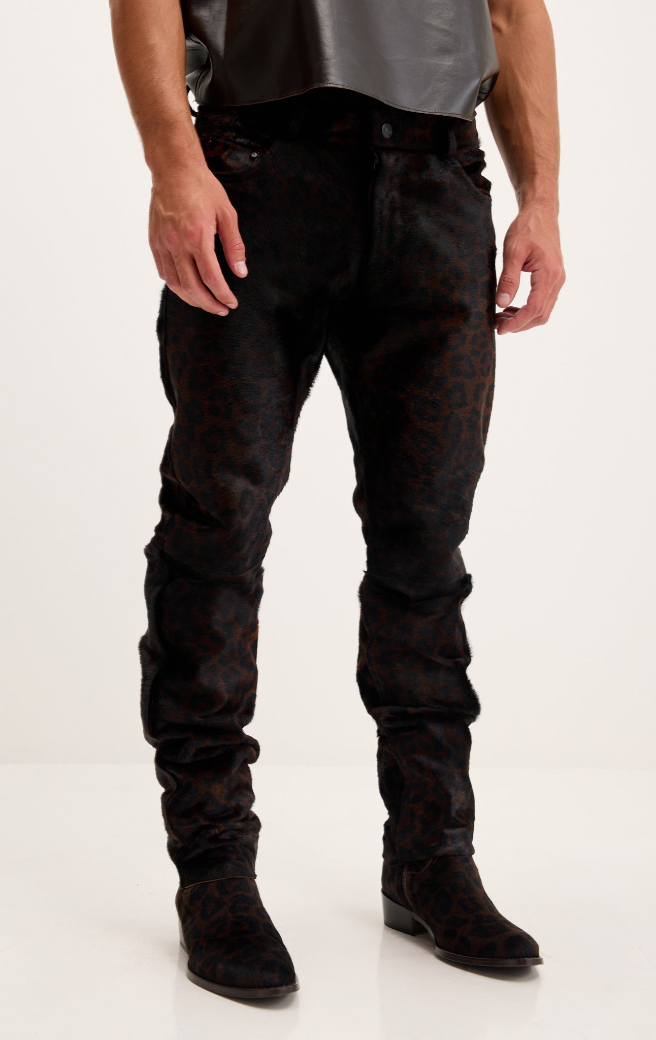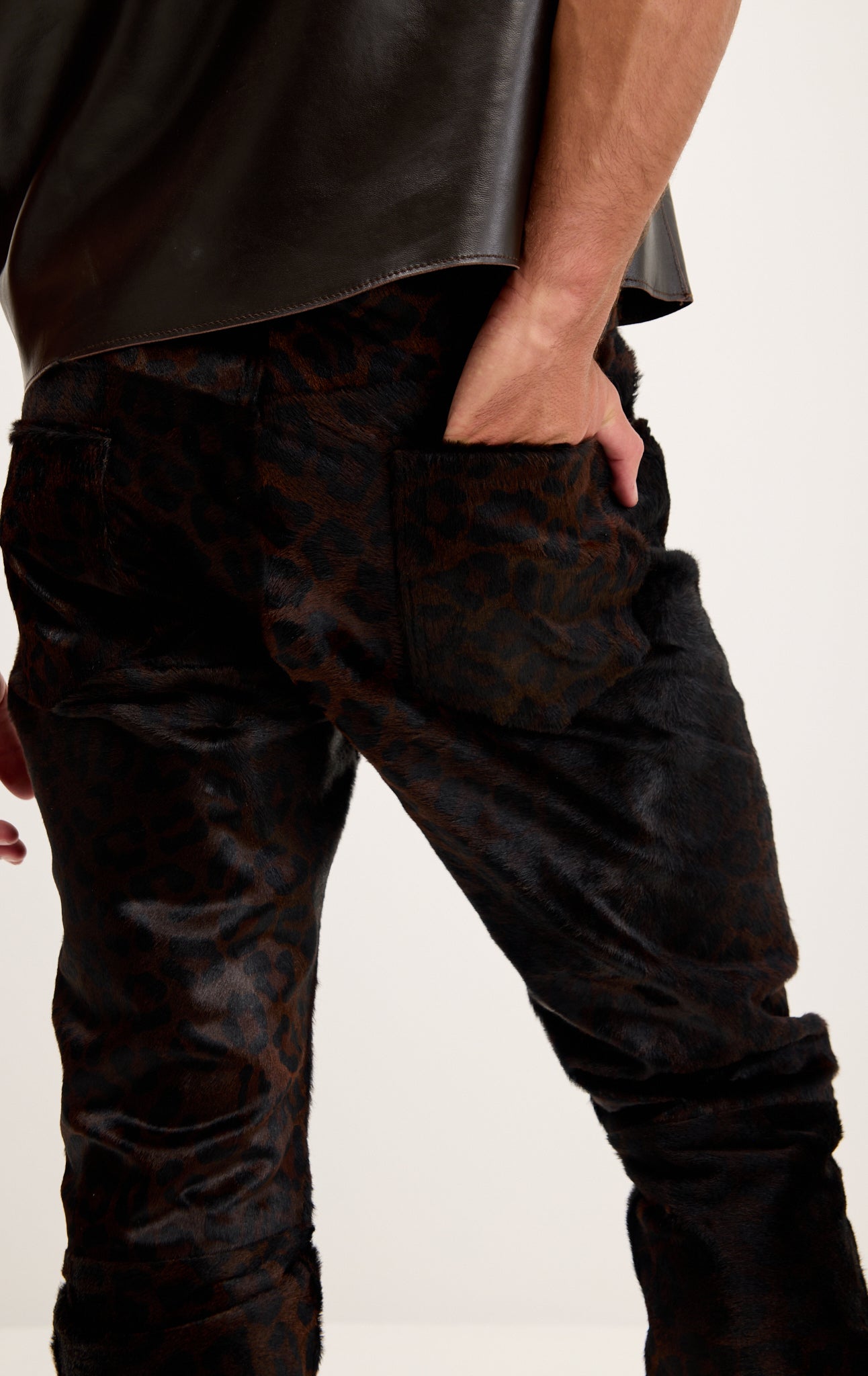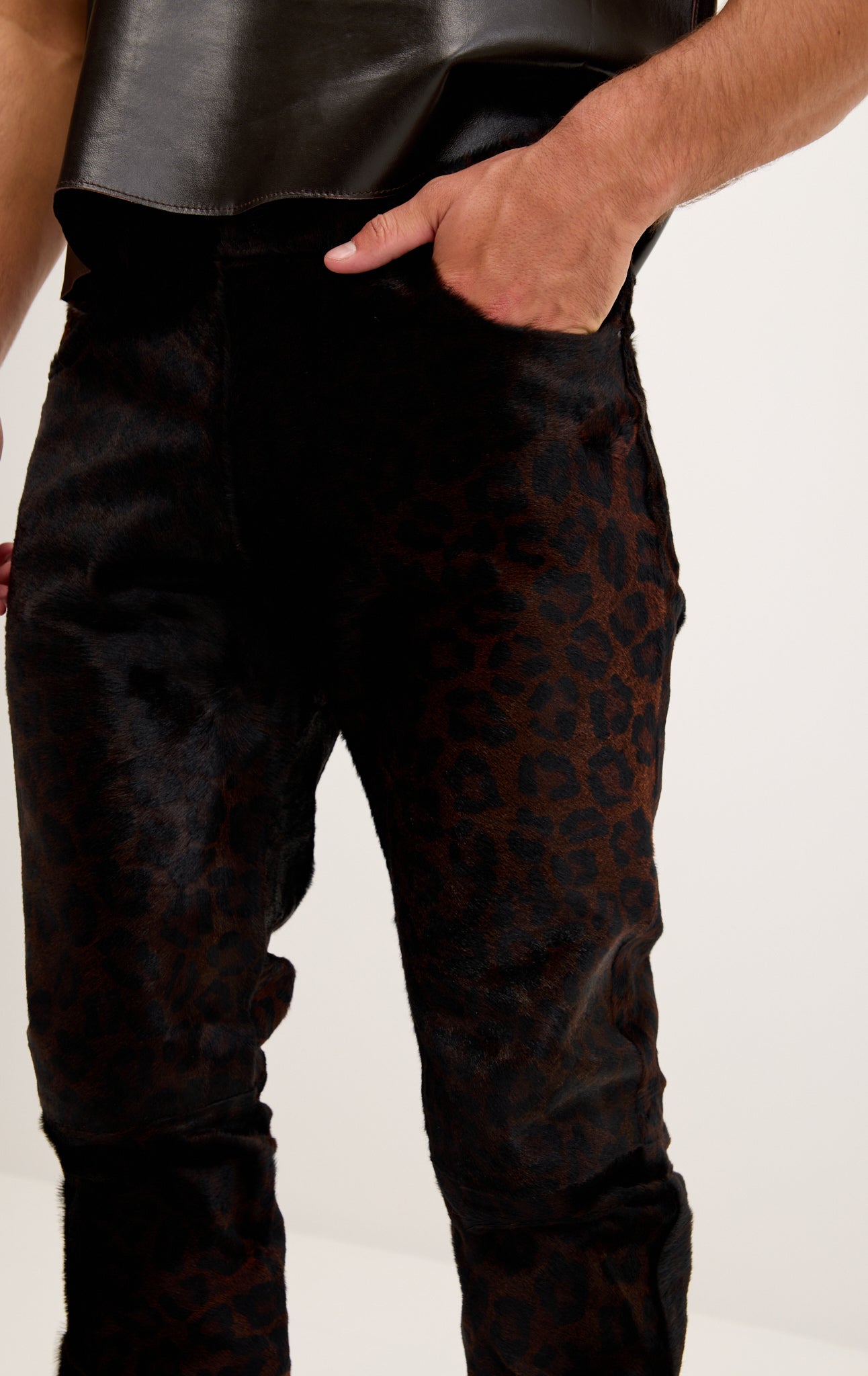 Unleash your wild side with these Ron Tomson slim fit pants, expertly crafted from luxurious calf hair leather in a striking leopard print pattern with a rich brown base and bold black spots, providing a plush, textured finish that's both daring and sophisticated.