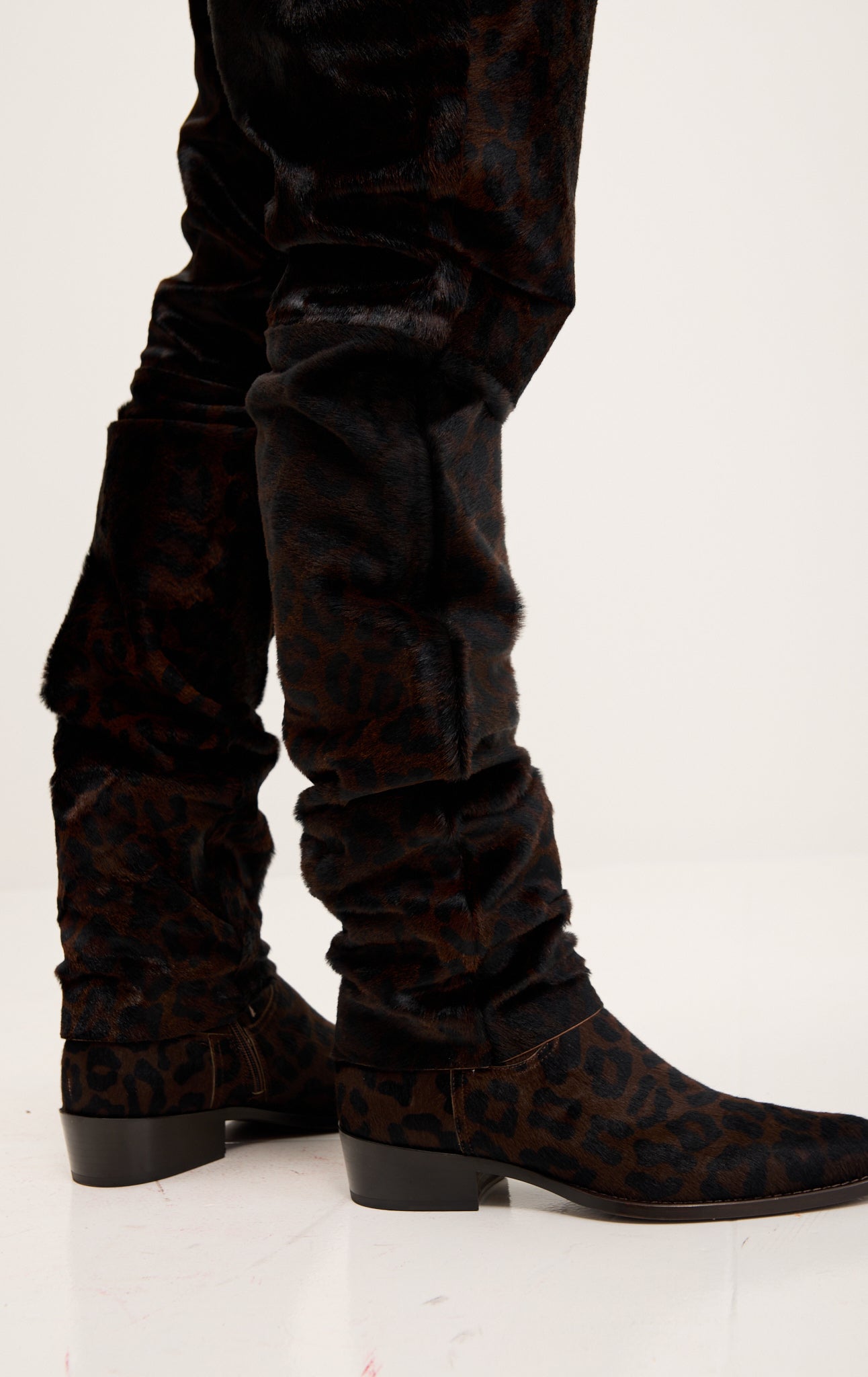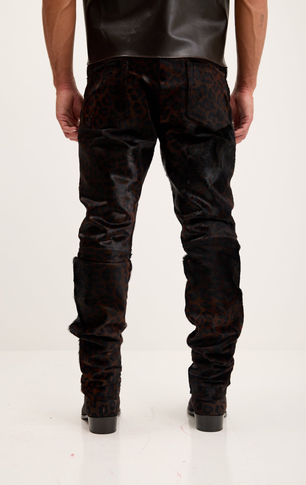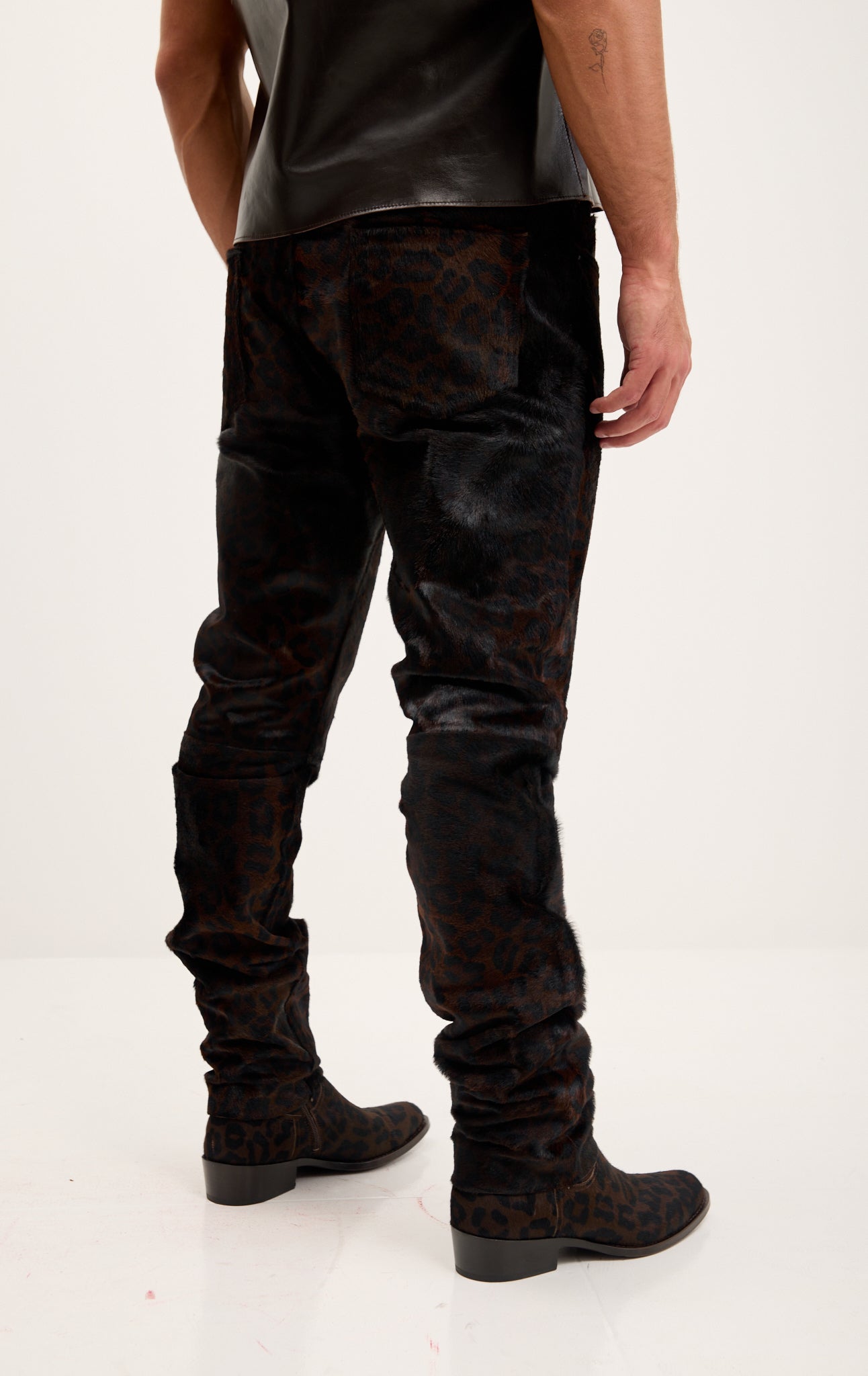 Unleash your wild side with these Ron Tomson slim fit pants, expertly crafted from luxurious calf hair leather in a striking leopard print pattern with a rich brown base and bold black spots, providing a plush, textured finish that's both daring and sophisticated.