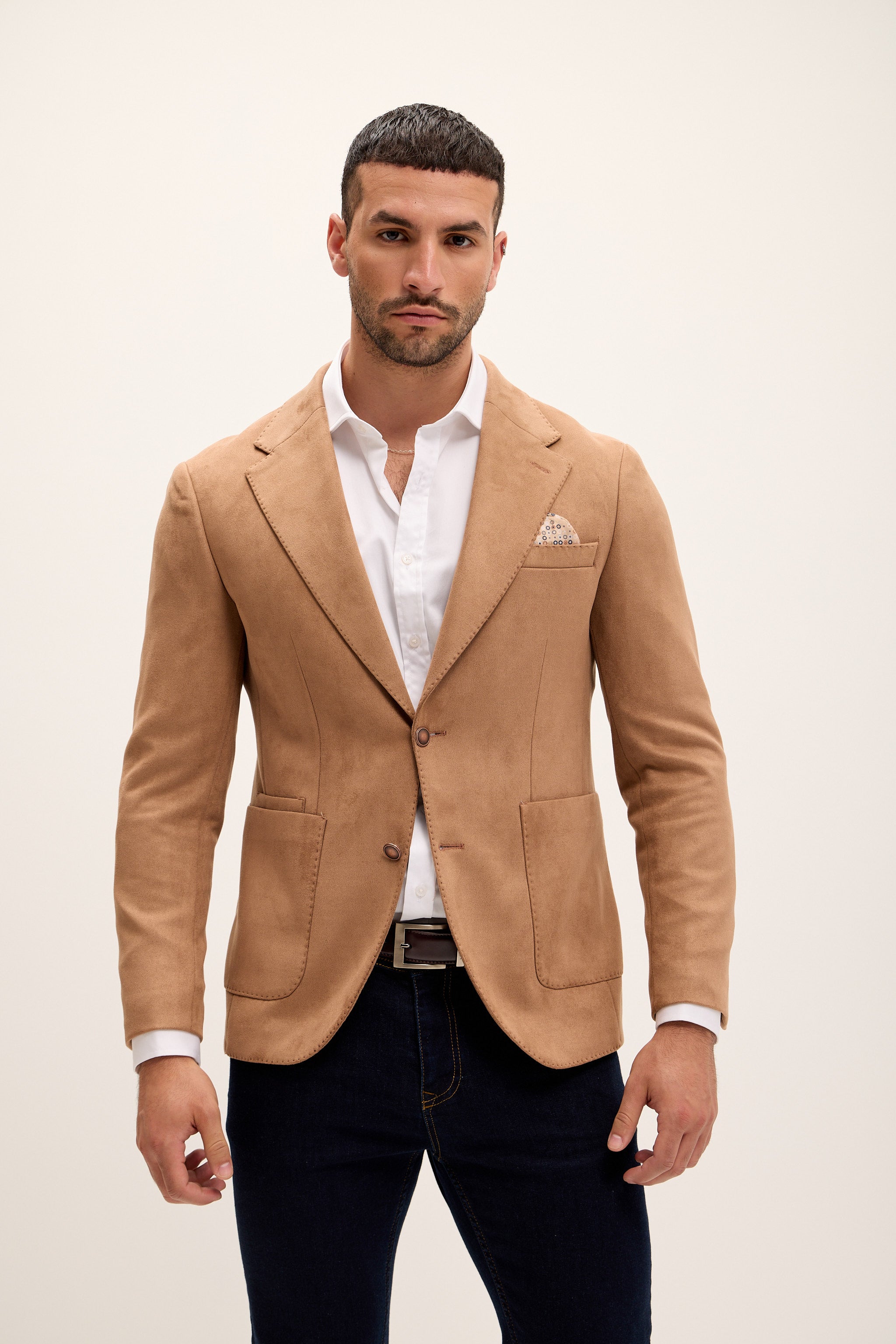 Faux suede notch lapel 2-button closure slim fit blazer. Fully lined with matching pocket square. Brass hardware. Non-functional button cuffs. Double vents. Point stitching throughout the lapel. Patch side pockets. Made with our signature tailored fit, this blazer will be your go-to blazer for many occasions, day or night. Match with our Microsuede Pants, best with contrasting colors.