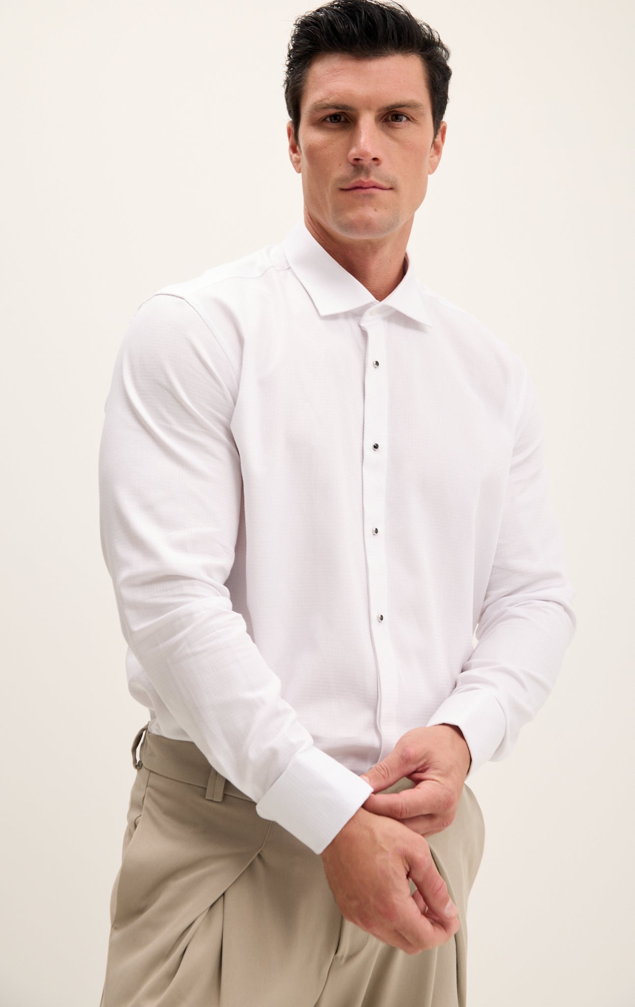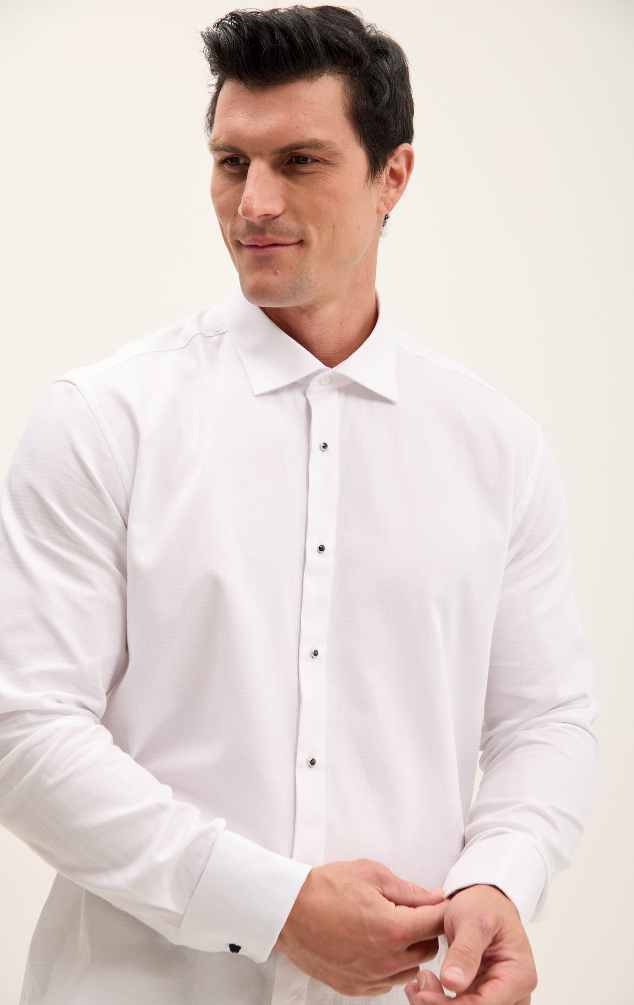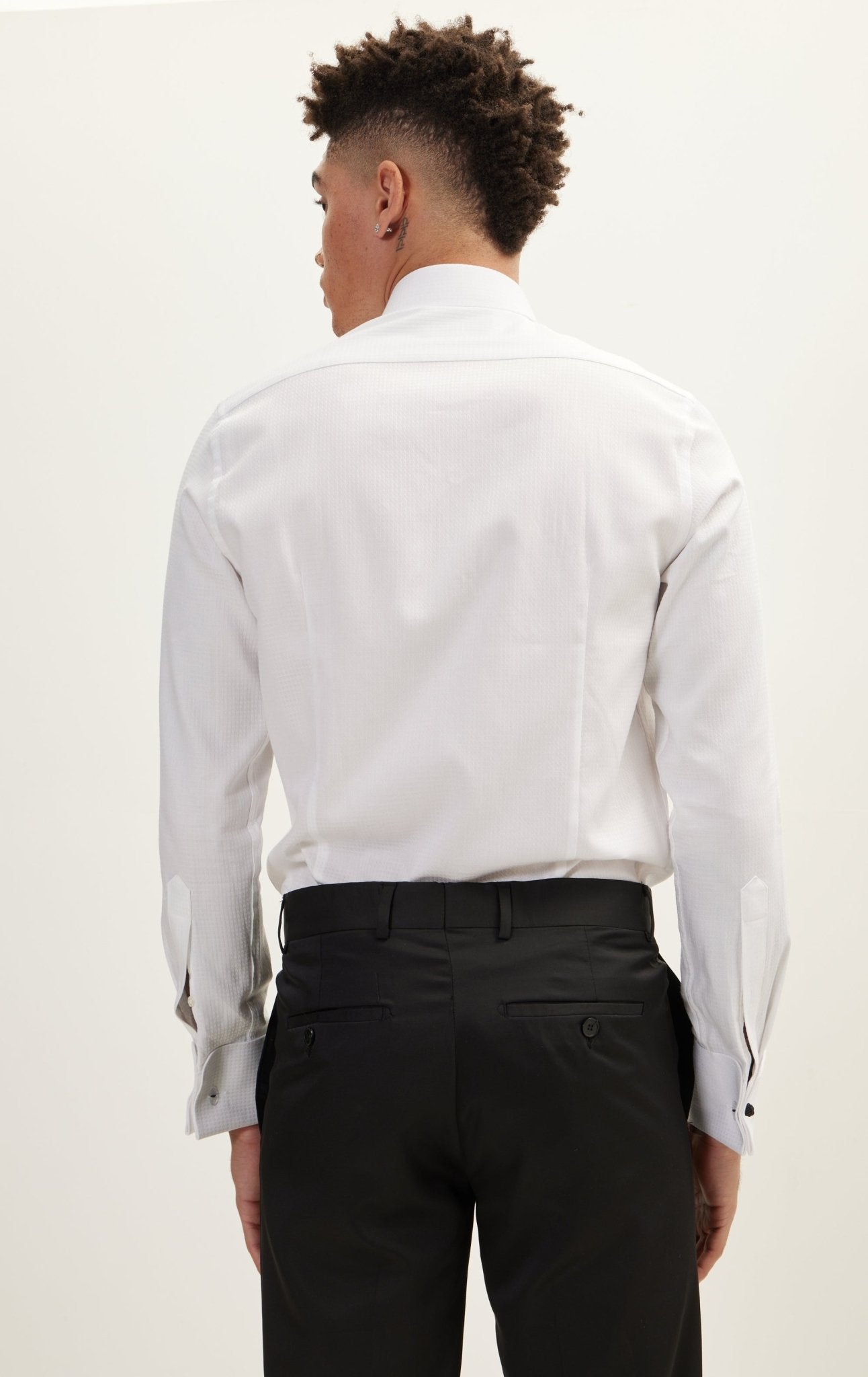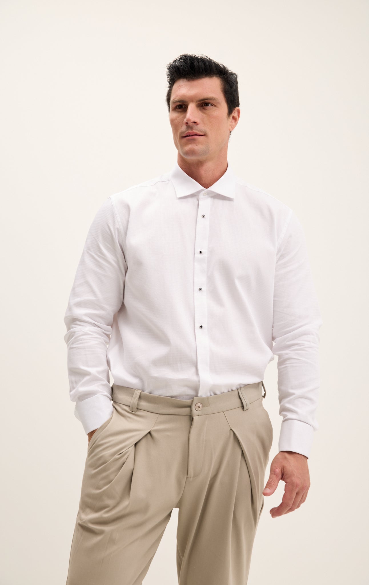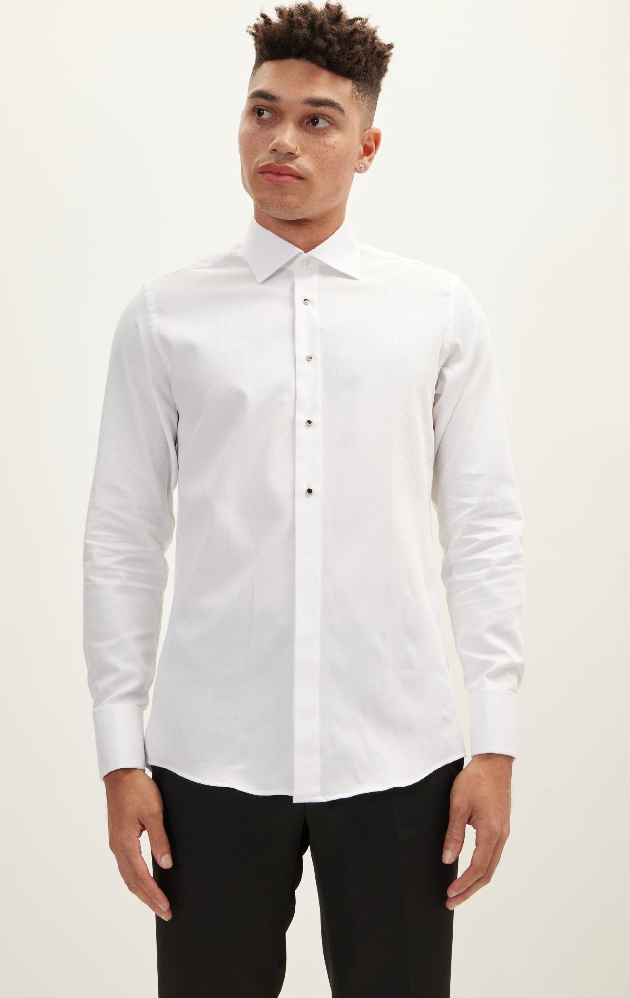 The Classical Top 3 Front Stud Tuxedo Shirt is the most classical option, and the way to go for the minimalist taste. It is a tribute to the historical classical top three buttons tuxedo setup. It’s a particularly clean finish to the shirt front and with tuxedo studs. The top 3 studs are completely removable and can be upgraded to our stainless steal stud sets.