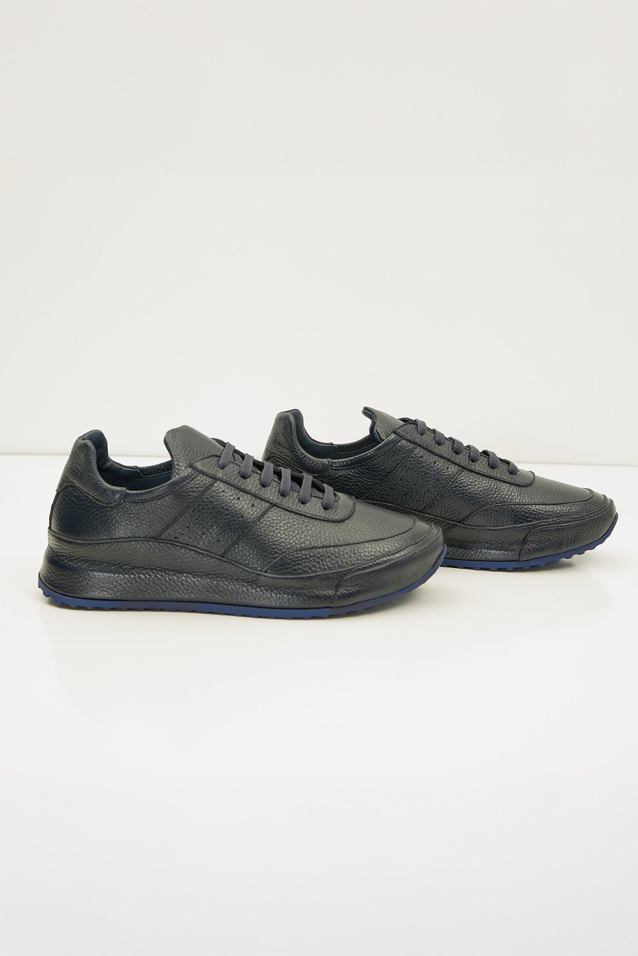 Laced low top runner sneaker. Top grain leather, foam midsole and rubber outsole. Luxurious waxed lace.