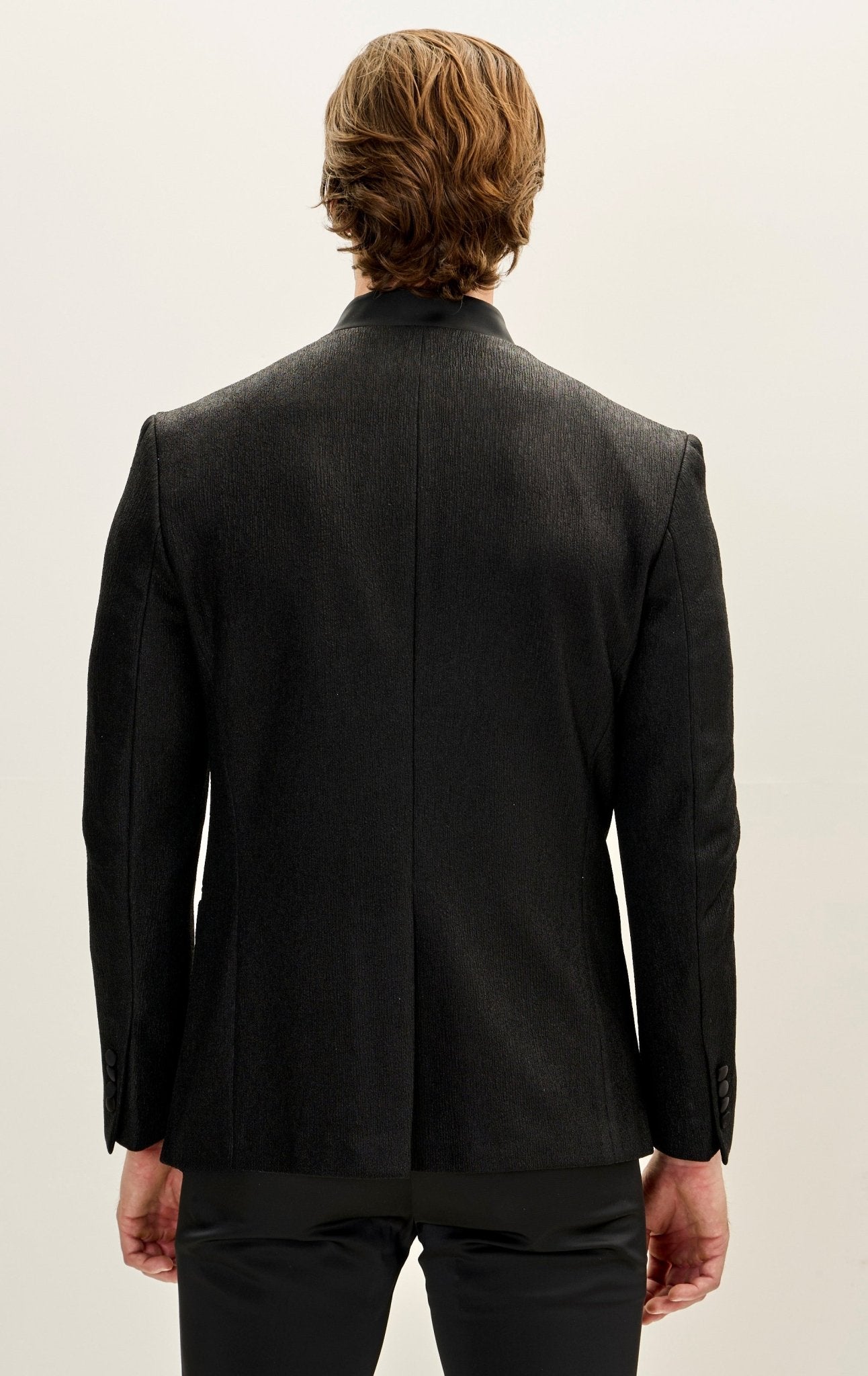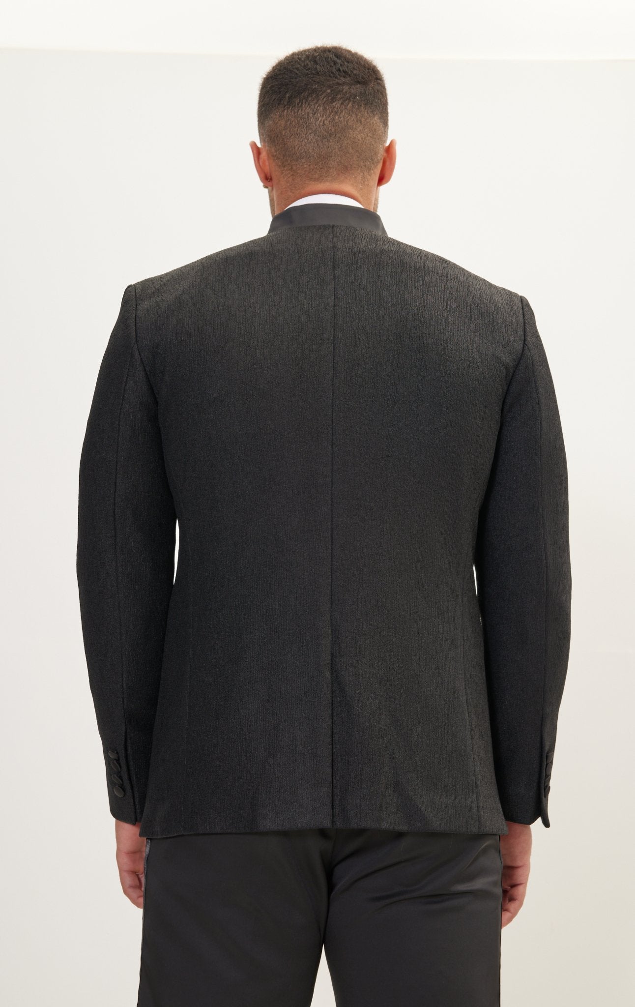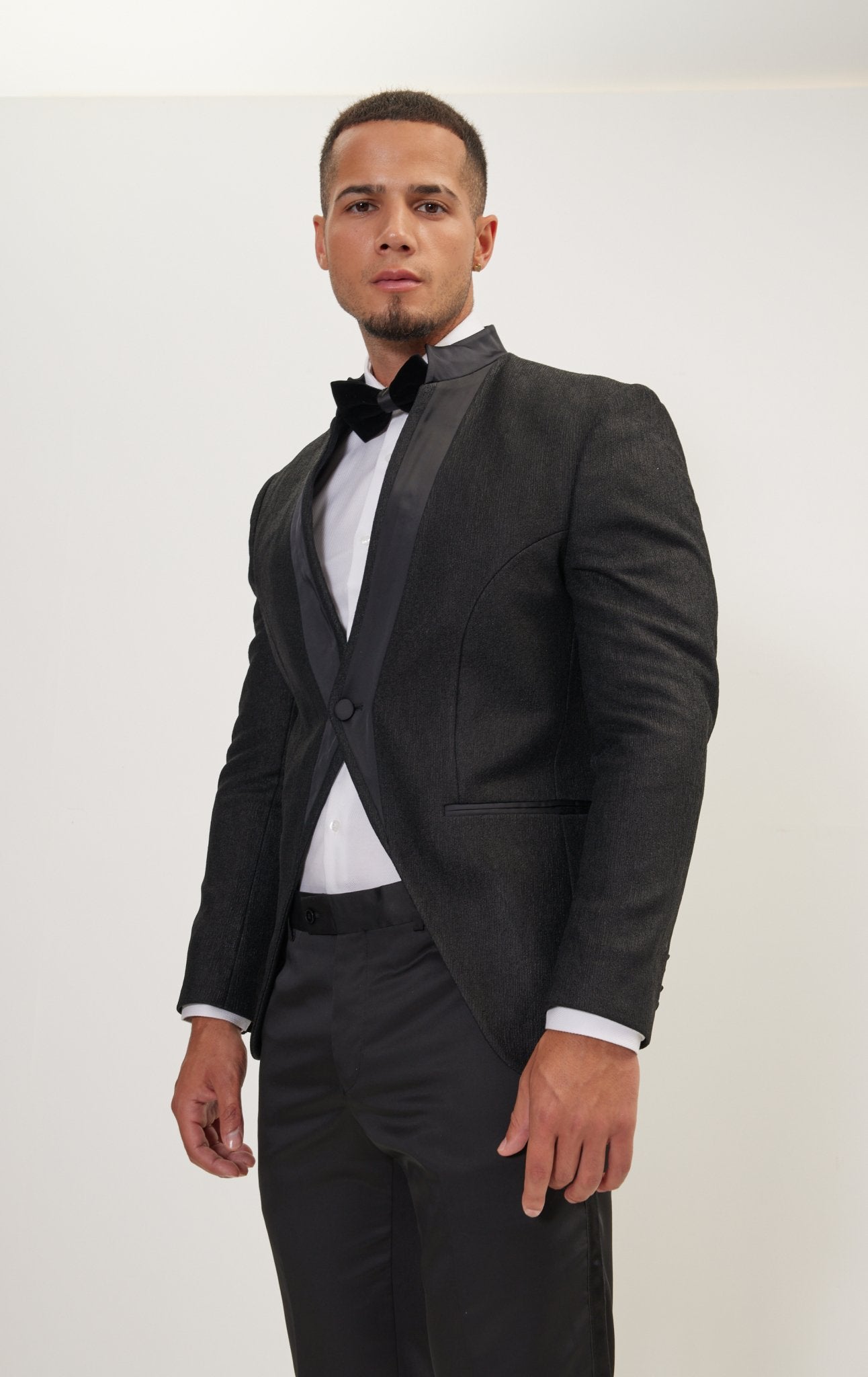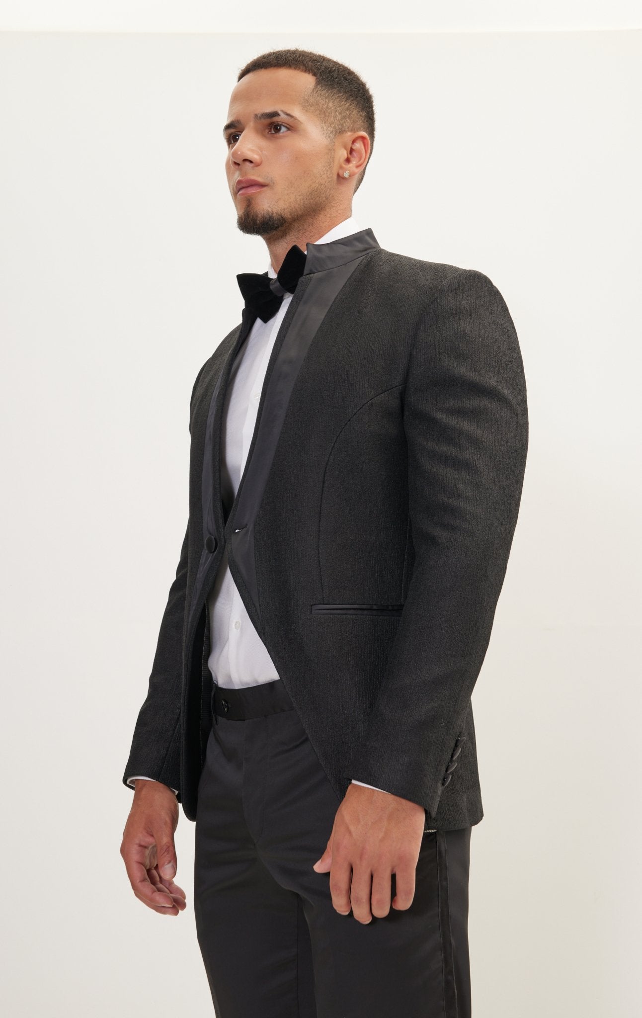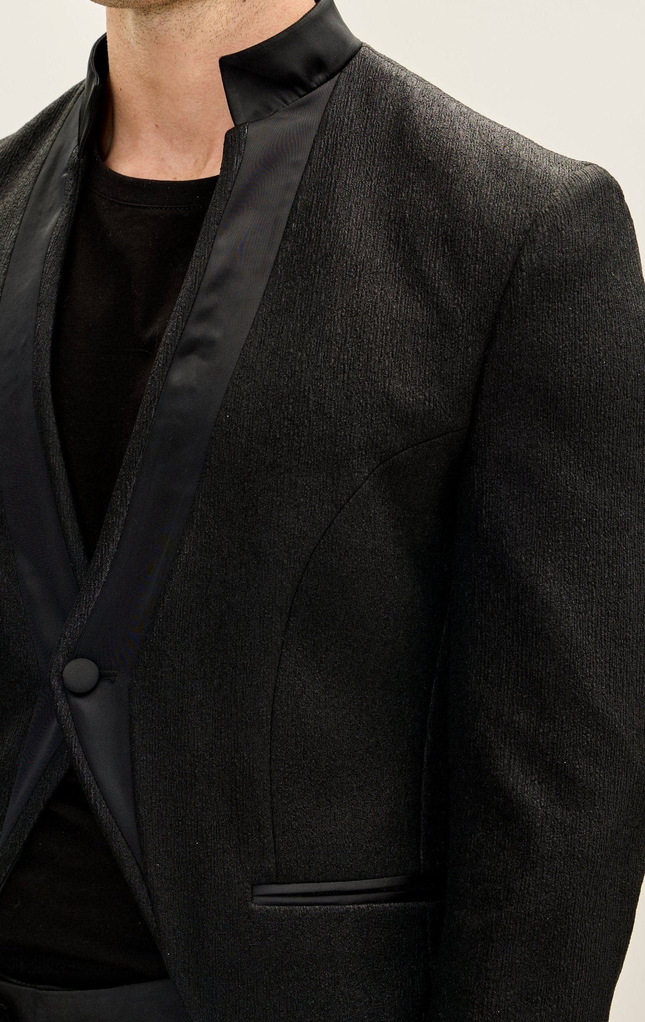 A black-tailored tuxedo with a mandarin collar with a textured feel to it, a modern and stylish take on the traditional tuxedo. The texture on the fabric adds visual interest and depth to the overall design, creating a unique and eye-catching tuxedo. Features a single button closure, creating a sleek and modern design.