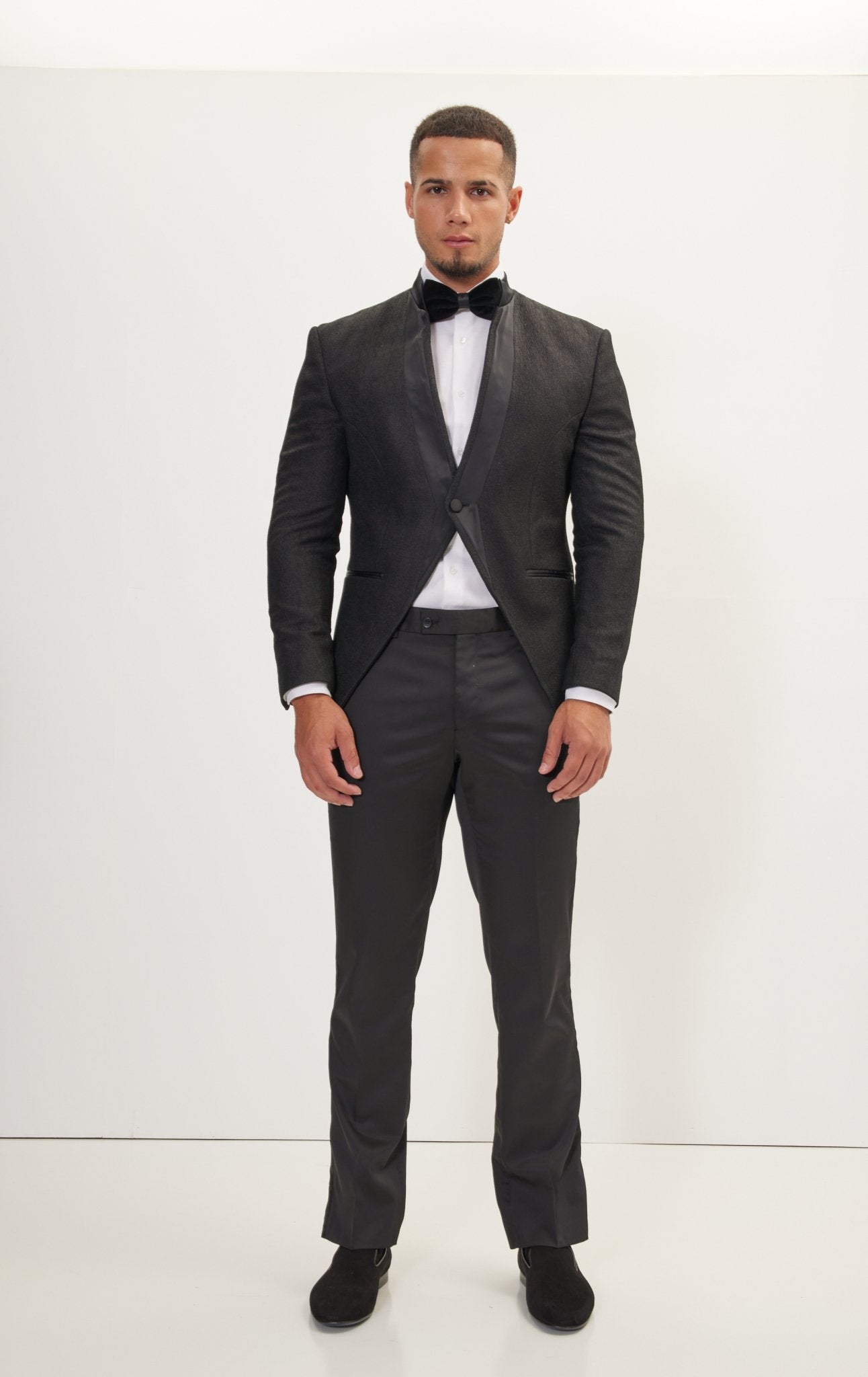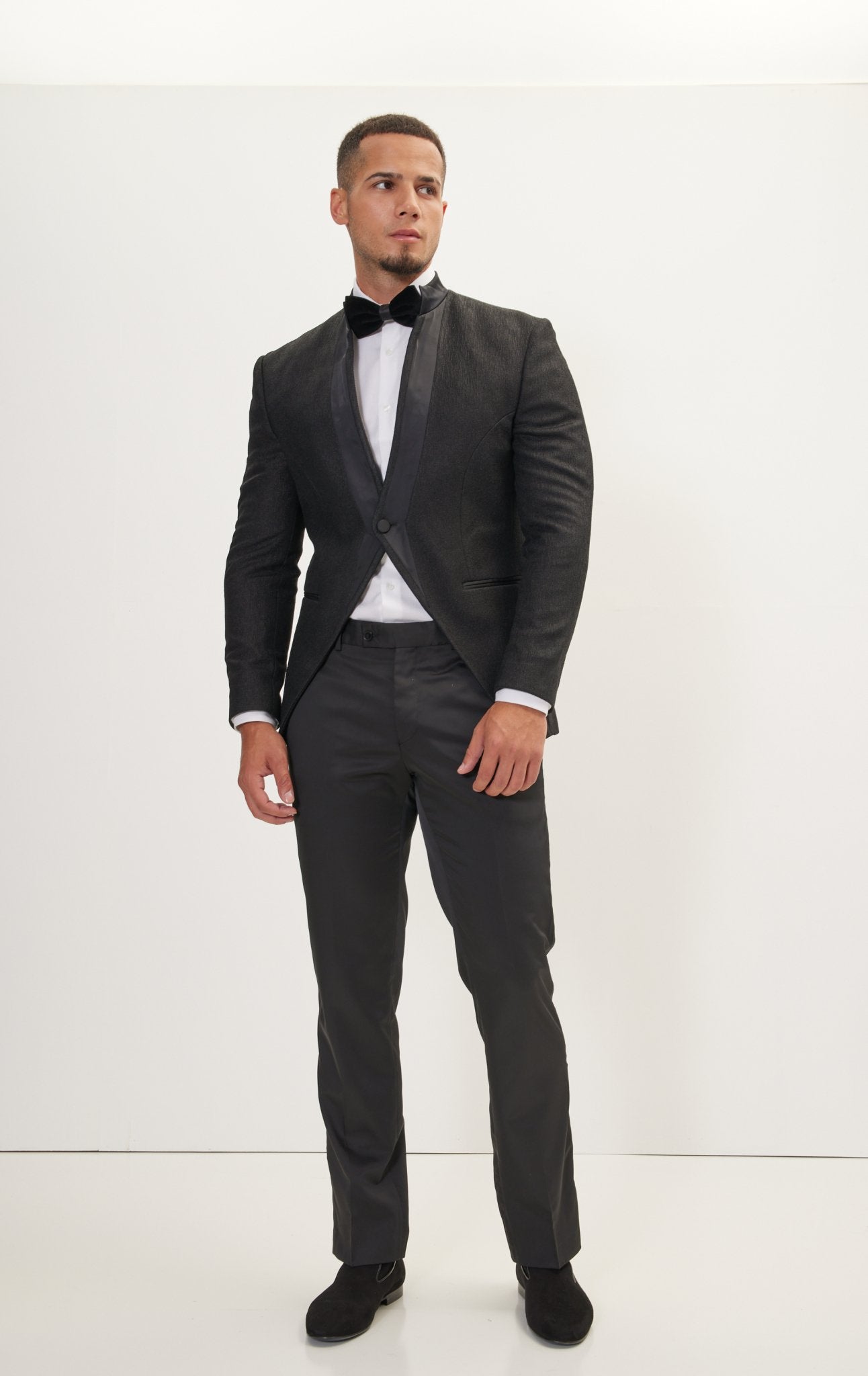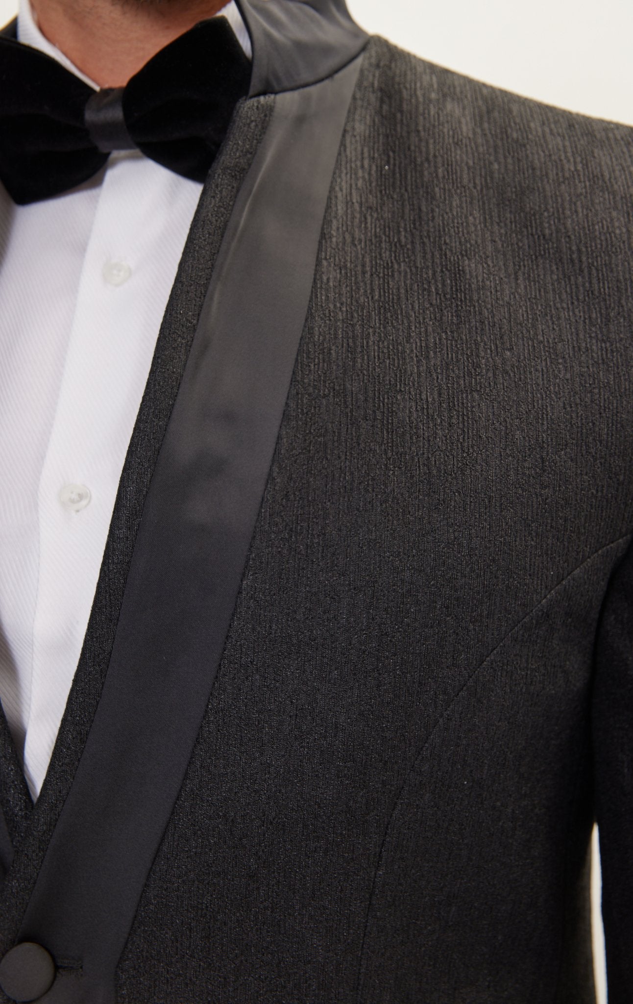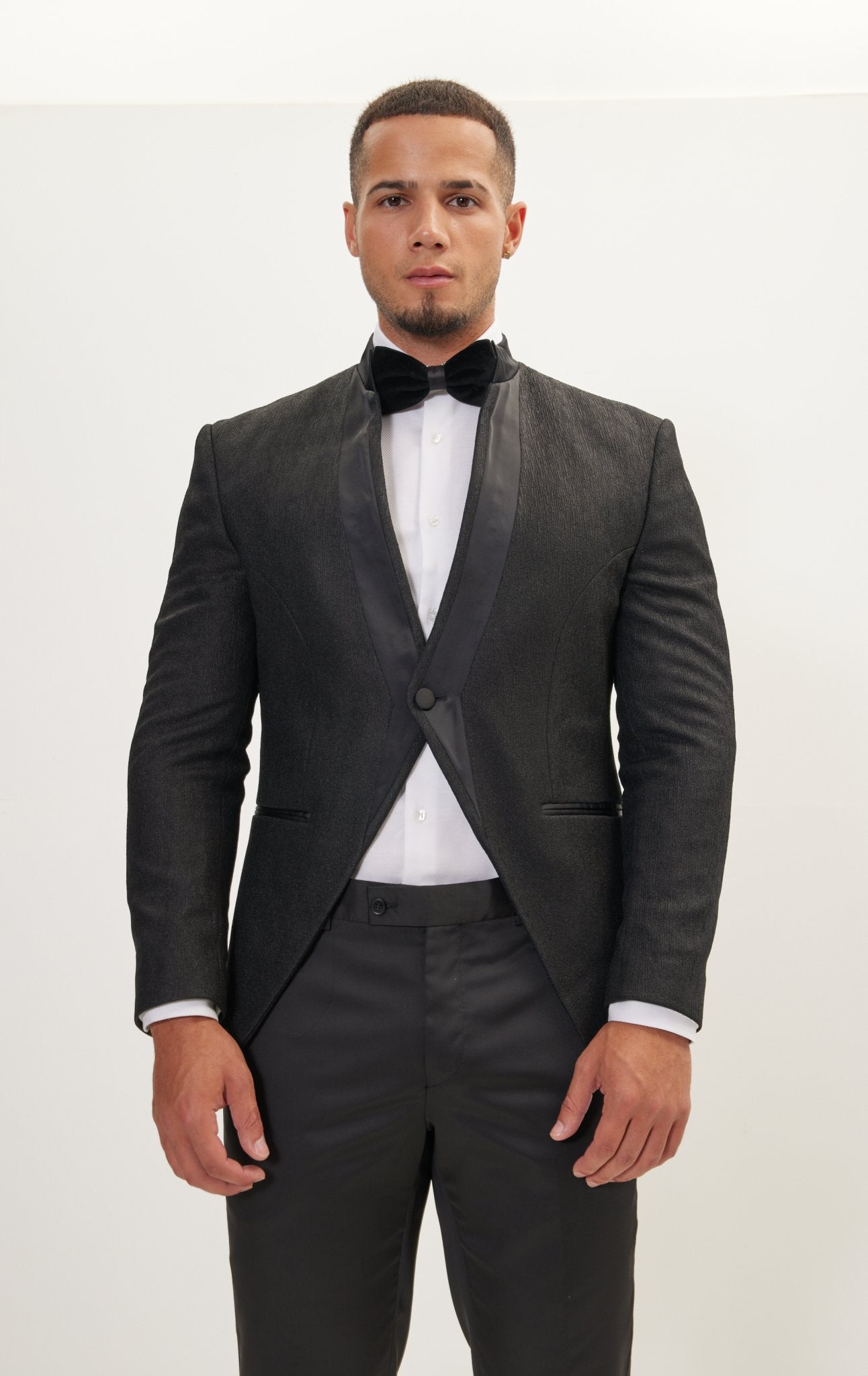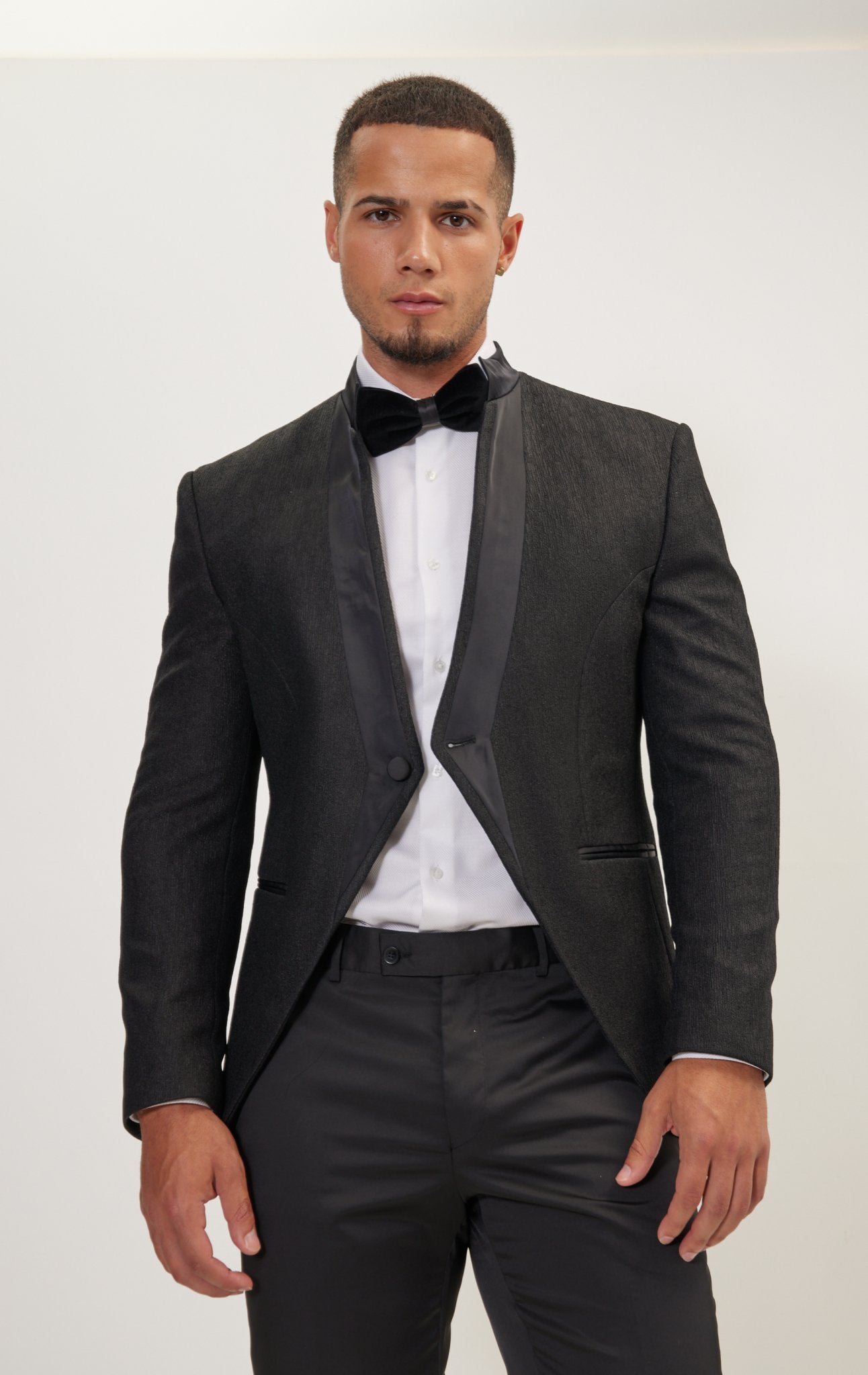 A black-tailored tuxedo with a mandarin collar with a textured feel to it, a modern and stylish take on the traditional tuxedo. The texture on the fabric adds visual interest and depth to the overall design, creating a unique and eye-catching tuxedo. Features a single button closure, creating a sleek and modern design.