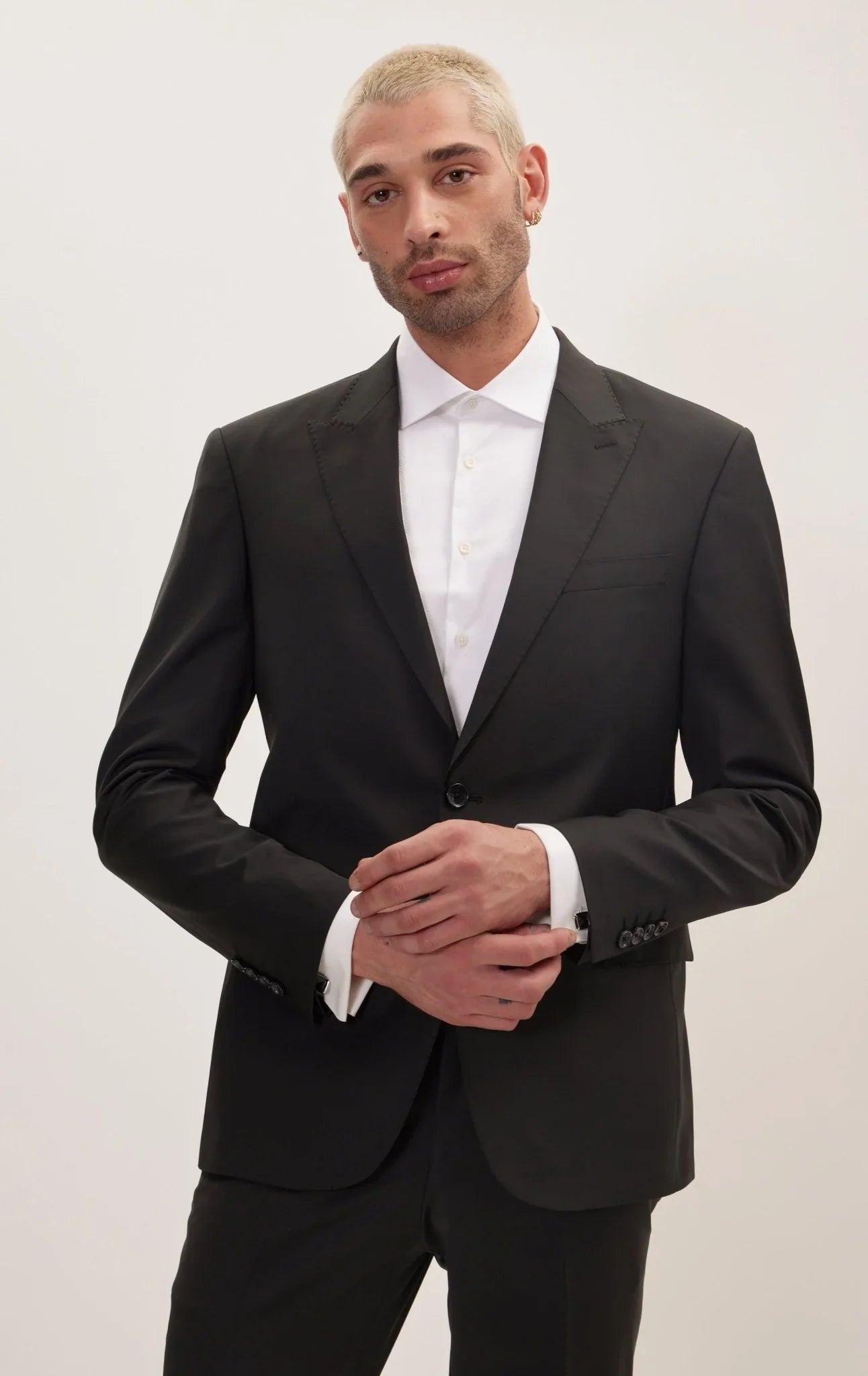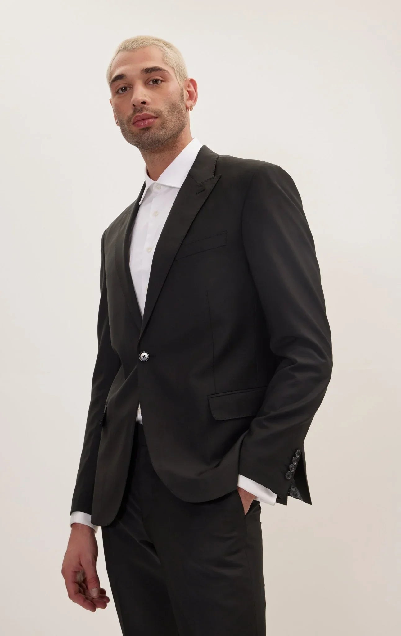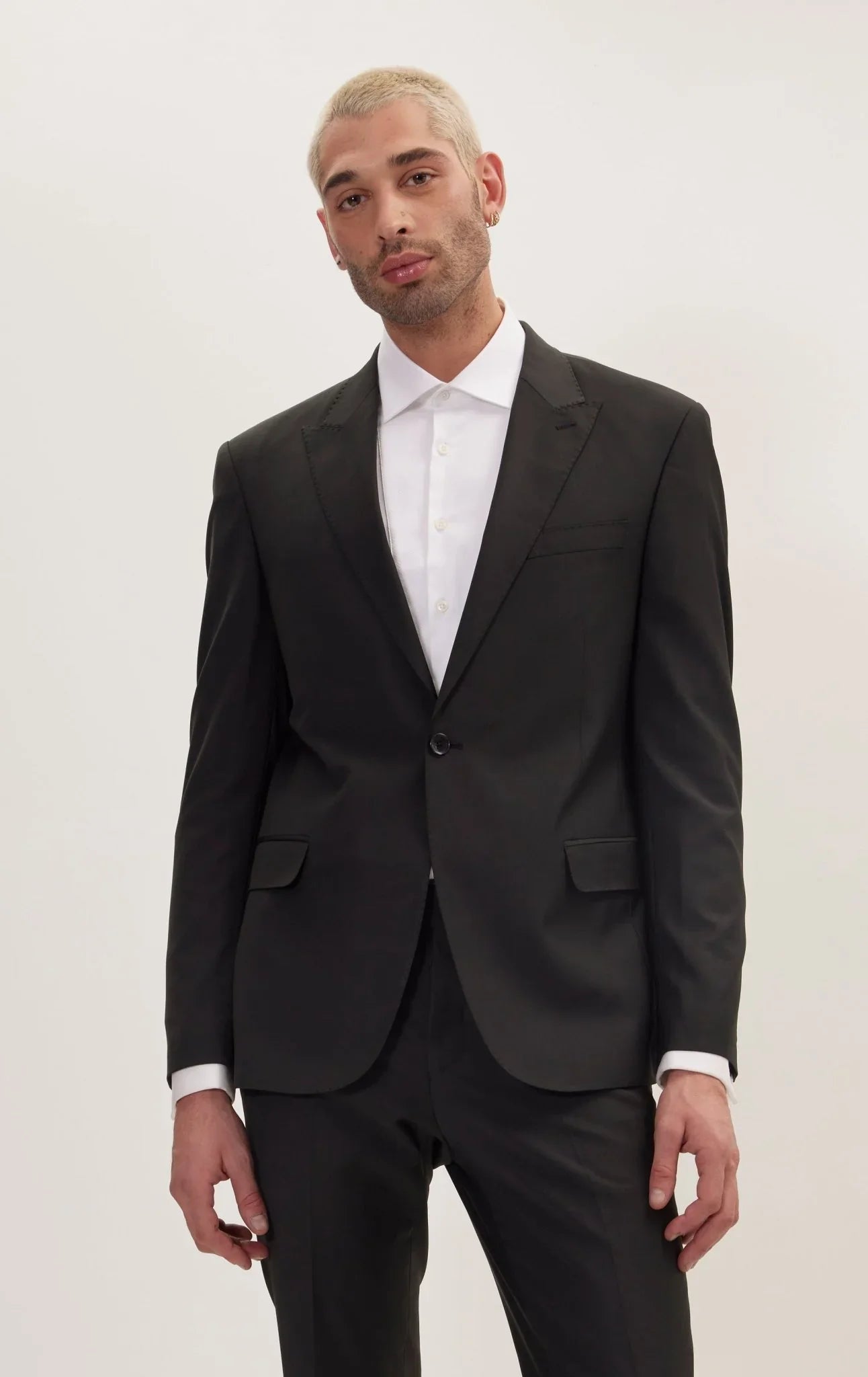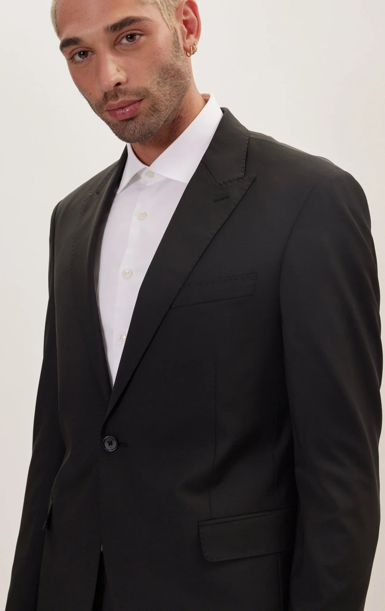 Handpicked stitching highlights the brand's attention to detail, while the peak lapels, combined with the 1-button closure design, exude modern elegance. The flap pockets offer a practical and stylish solution for carrying small essentials.
