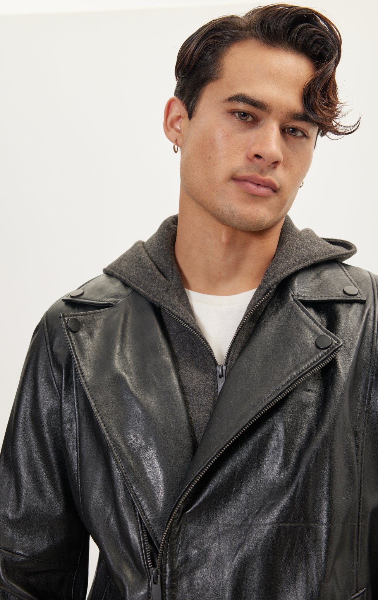 Наша классическая кожаная куртка с застежкой-молнией, изготовленная вручную для Рона Томсона из мягкой натуральной кожи, придаст изюминку любому образу. Кожа ягненка. Тонкие детали, двойные нагрудные карманы на молнии, серебристая фурнитура и съемный вязаный жилет с капюшоном, застегивающийся на кнопки на лацканах. Регулируемые манжеты на кнопках на рукавах и вертикальные прорезные карманы завершают этот классический образ.