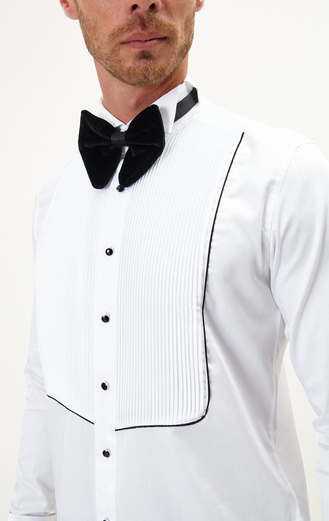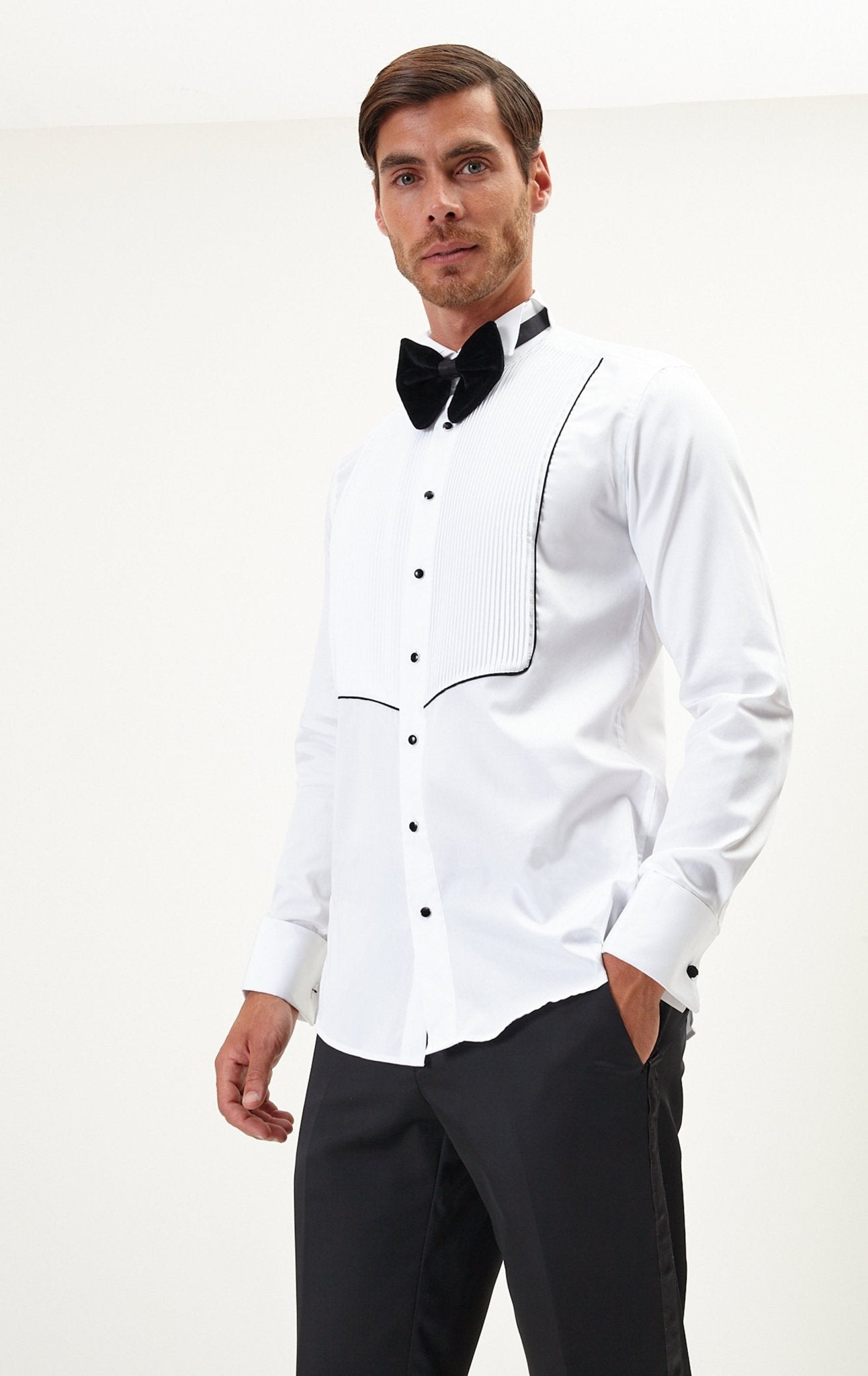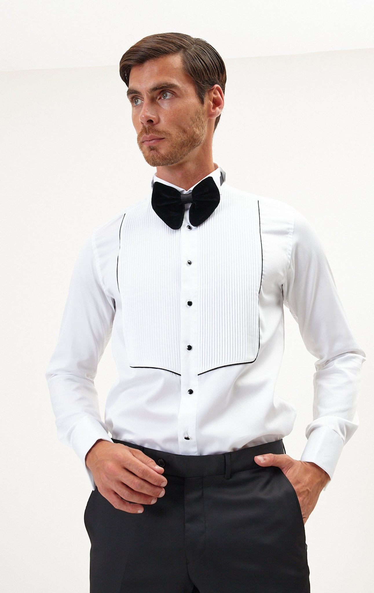 Рубашка с длинным рукавом и воротником на пуговицах. M ADE с европейской чистой хлопчатобумажной тканью, грудью переднего гофрированием, тональными трубопроводами, черной эмалью в кнопках оклада, французских манжеты с узловатыми шелковыми запонками.