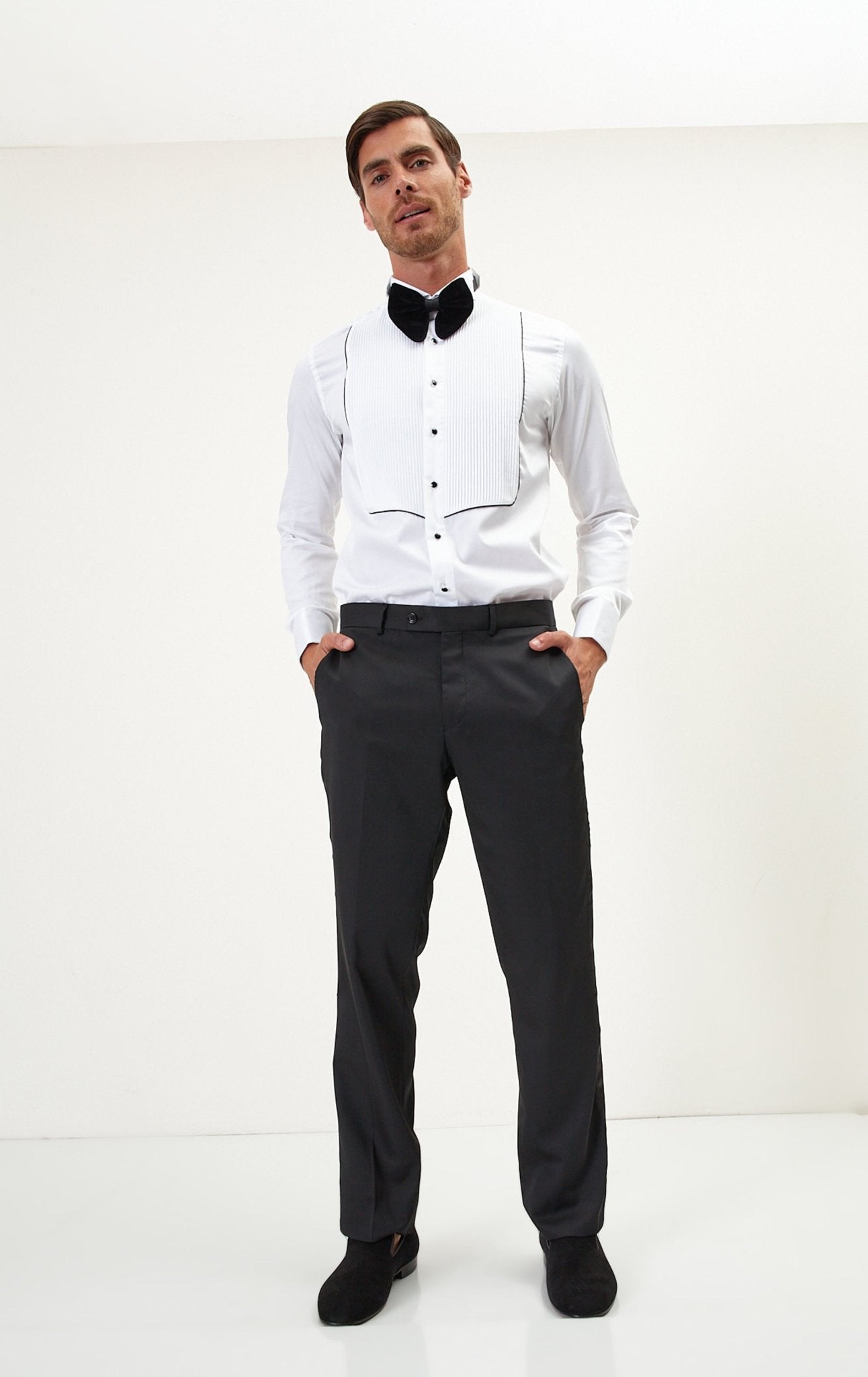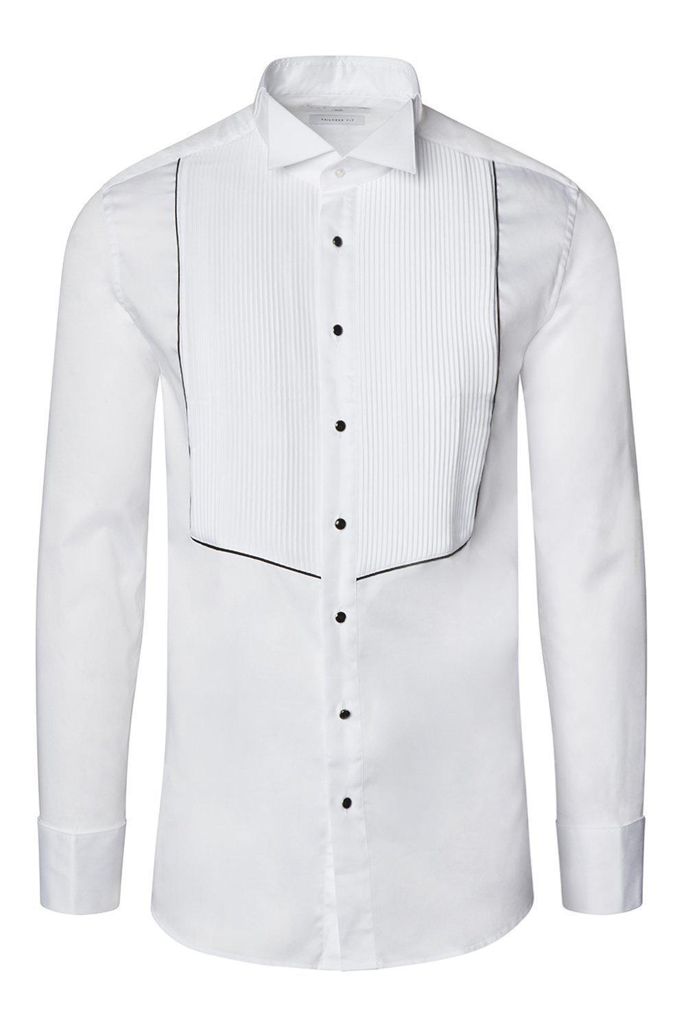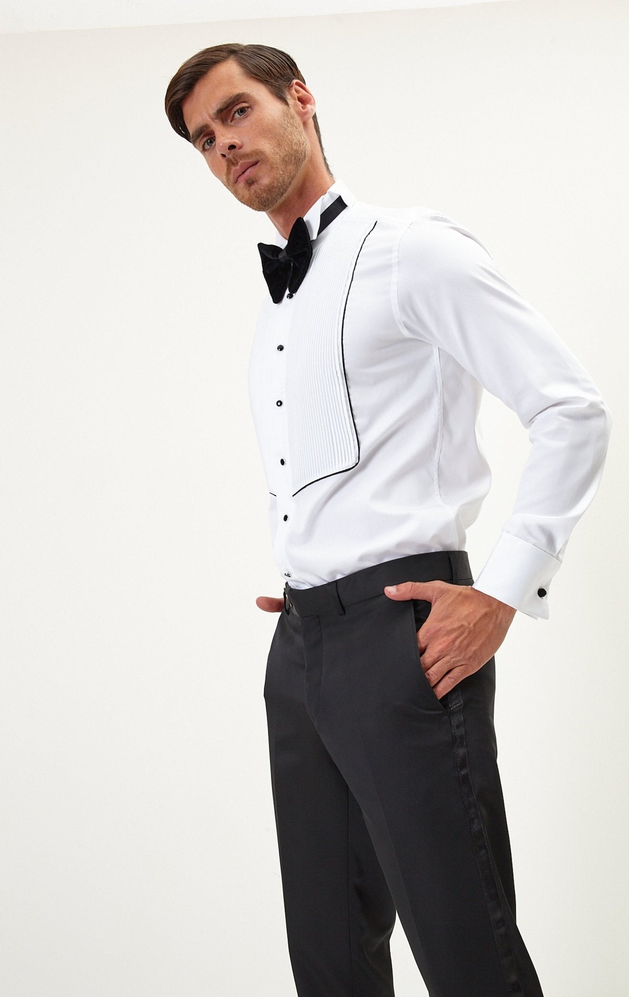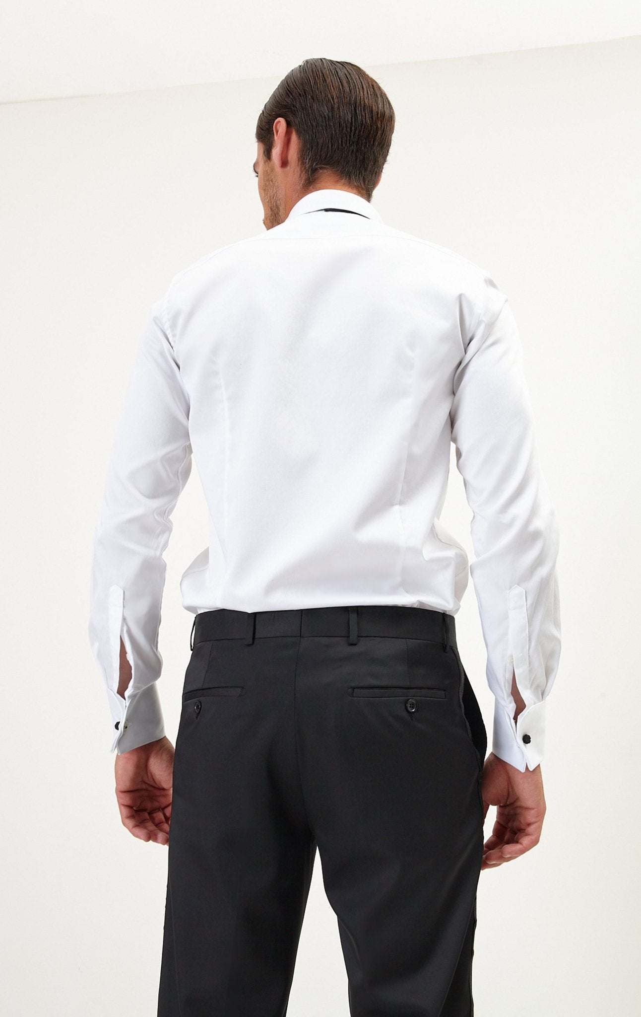 Рубашка с длинным рукавом и воротником на пуговицах. M ADE с европейской чистой хлопчатобумажной тканью, грудью переднего гофрированием, тональными трубопроводами, черной эмалью в кнопках оклада, французских манжеты с узловатыми шелковыми запонками.